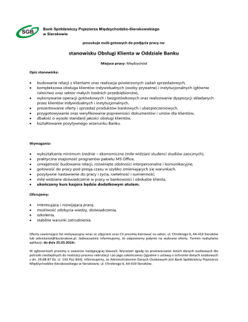 Bank Spółdzielczy Pojezierza Międzychodzko-Sierakowskiego w Sierakowie poszukuje osób gotowych do podjęcia pracy na: stanowisku Obsługi Klienta w Oddziale Banku Miejsce pracy: Międzychód Opis stanowiska: budowanie relacji z klientami oraz realizacja powierzonych zadań sprzedażowych, kompleksowa obsługa klientów indywidualnych (osoby prywatne) i instytucjonalnych (głównie rolnictwo oraz sektor małych średnich przedsiębiorstw), wykonywanie operacji gotówkowych i bezgotówkowych oraz realizowanie dyspozycji składanych przez klientów indywidualnych i instytucjonalnych, prezentowanie oferty i sprzedaż produktów bankowych i ubezpieczeniowych, przygotowywanie oraz weryfikowanie poprawności dokumentów i umów dla klientów, dbałość o wysoki standard jakości obsługi klientów, kształtowanie pozytywnego wizerunku Banku. Wymagania: wykształcenie minimum średnie – ekonomiczne (mile widziani studenci studiów zaocznych), praktyczna znajomość programów pakietu MS Office, umiejętność budowania relacji, rozwinięte zdolności interpersonalne i komunikacyjne, gotowość do pracy pod presją czasu w szybko zmieniających się warunkach, pozytywne nastawienie do pracy i życia, rzetelność i sumienność, mile widziane doświadczenie w pracy w bankowości i obsłudze klienta, ukończony kurs kasjera będzie dodatkowym atutem. Oferujemy: interesującą i rozwijającą pracę, możliwość zdobycia wiedzy, doświadczenia, szkolenia, stabilne warunki zatrudnienia. Oferty zawierające list motywacyjny wraz ze zdjęciem oraz CV prosimy kierować na adres: ul. Chrobrego 6, 64-410 Sieraków lub [email protected]. Jednocześnie informujemy, że odpowiemy jedynie na wybrane oferty. Termin nadsyłania aplikacji: do dnia 25.03.2016r. W zgłoszeniach prosimy o zawarcie następującej klauzuli: Wyrażam zgodę na przetwarzanie moich danych osobowych dla potrzeb niezbędnych do realizacji procesu rekrutacji i po jego zakończeniu (zgodnie z ustawą o ochronie danych osobowych z dn. 29.08.97 Dz. U. 133 Poz 833). Informujemy, że Administratorem Danych Osobowych jest Bank Spółdzielczy Pojezierza Międzychodzko-Sierakowskiego w Sierakowie, ul. Chrobrego 6, 64-410 Sieraków.