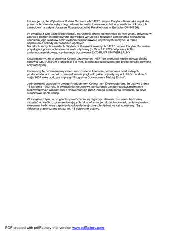 Informujemy, że Wytwórnia Kotłów Grzewczych “HEF” Lucyna Foryta – Ruranska uzyskała prawo ochronne do wyłącznego używania znaku towarowego hef w sposób zarobkowy lub zawodowy na całym obszarze Rzeczypospolitej Polskiej oraz w Europie (00444756). W związku z tym wszelkiego rodzaju naruszenia prawa ochronnego do w/w znaku (również w zakresie domen internetowych) spowoduje wysunięcie roszczeń zaniechania naruszania i usunięcia jego skutków oraz wydania bezpodstawnie uzyskanych korzyści, a także naprawienia szkody na zasadach ogólnych. Na takich samych zasadach Wytwórni Kotłów Grzewczych “HEF” Lucyna Foryta- Ruranska przysługują prawa ochronne na wzór użytkowy (nr W – 111922) dotyczący kotła zmiennopaleniskowego centralnego ogrzewania EKO-PLUS UNIWERSALNY Oświadczamy, że Wytwórnia Kotłów Grzewczych “HEF” do produkcji kotłów używa blachy kotłowej typu P265GH o grubości 3-8 mm. Blacha zabezpieczona jest przed korozją powłoką antykorozyjną. Informację tę przekazujemy celem umożliwienia klientom porównania ofert różnych producentów oraz w celu zdementowania pogłosek, jakie pojawiły się w Lublińcu w dniu 6 maja 2007 roku podczas imprezy “Programu Ograniczenia Niskiej Emisji”. Jednocześnie zwracamy uwagę Producentom Kotłów i ich Dystrybutorom, że ustawa z dnia 16 kwietnia 1993 roku o zwalczaniu nieuczciwej konkurencji uznaje rozpowszechnianie nieprawdziwych wiadomości o wytwarzanych przez innego producenta towarach, za czyn nieuczciwej konkurencji. W związku z tym, w przypadku powtórzenia się tego typu działań, zmuszeni będziemy zażądać od osób rozpowszechniających takie informacje, złożenia oświadczenia w prasie o stosownej treści oraz zapłacenia odpowiedniej sumy pieniężnej na cel społeczny. Są to działania przewidziane przez art. 18 cytowanej ustawy. PDF created with pdfFactory trial version www.pdffactory.com