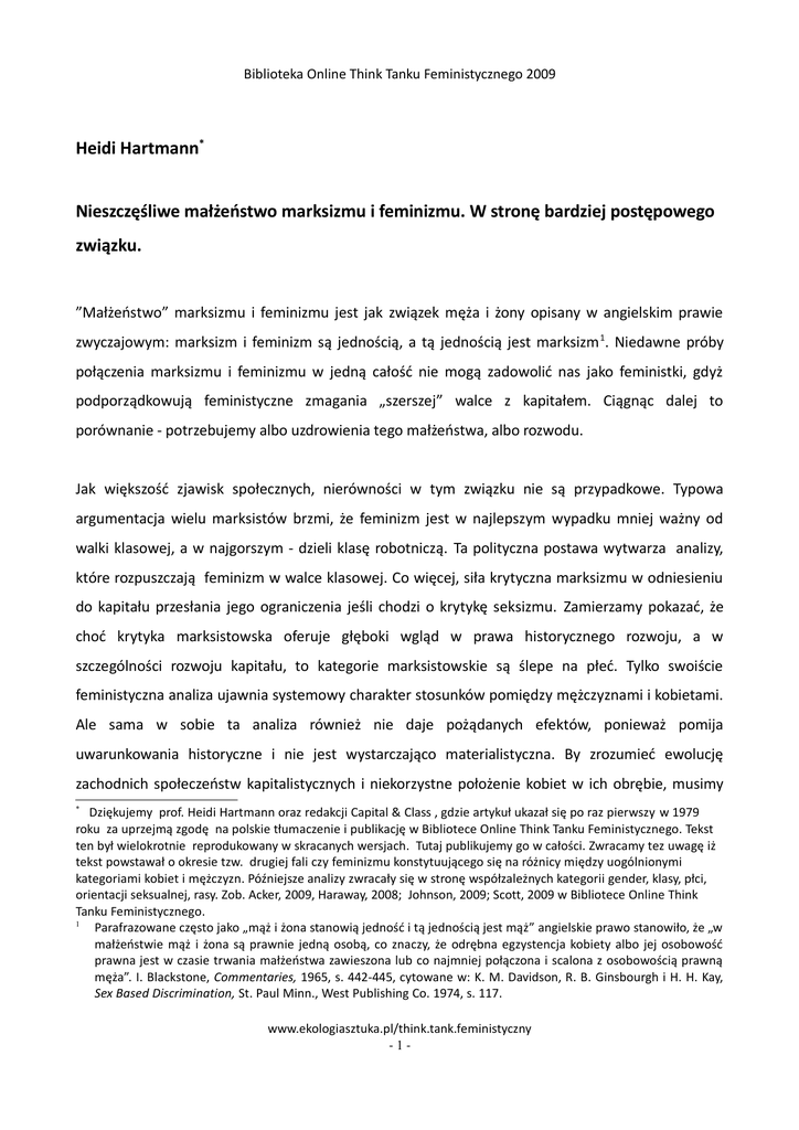 Biblioteka Online Think Tanku Feministycznego 2009 Heidi Hartmann* Nieszczęśliwe małżeństwo marksizmu i feminizmu. W stronę bardziej postępowego związku. ”Małżeństwo” marksizmu i feminizmu jest jak związek męża i żony opisany w angielskim prawie zwyczajowym: marksizm i feminizm są jednością, a tą jednością jest marksizm 1. Niedawne próby połączenia marksizmu i feminizmu w jedną całość nie mogą zadowolić nas jako feministki, gdyż podporządkowują feministyczne zmagania „szerszej” walce z kapitałem. Ciągnąc dalej to porównanie - potrzebujemy albo uzdrowienia tego małżeństwa, albo rozwodu. Jak większość zjawisk społecznych, nierówności w tym związku nie są przypadkowe. Typowa argumentacja wielu marksistów brzmi, że feminizm jest w najlepszym wypadku mniej ważny od walki klasowej, a w najgorszym - dzieli klasę robotniczą. Ta polityczna postawa wytwarza analizy, które rozpuszczają feminizm w walce klasowej. Co więcej, siła krytyczna marksizmu w odniesieniu do kapitału przesłania jego ograniczenia jeśli chodzi o krytykę seksizmu. Zamierzamy pokazać, że choć krytyka marksistowska oferuje głęboki wgląd w prawa historycznego rozwoju, a w szczególności rozwoju kapitału, to kategorie marksistowskie są ślepe na płeć. Tylko swoiście feministyczna analiza ujawnia systemowy charakter stosunków pomiędzy mężczyznami i kobietami. Ale sama w sobie ta analiza również nie daje pożądanych efektów, ponieważ pomija uwarunkowania historyczne i nie jest wystarczająco materialistyczna. By zrozumieć ewolucję zachodnich społeczeństw kapitalistycznych i niekorzystne położenie kobiet w ich obrębie, musimy Dziękujemy prof. Heidi Hartmann oraz redakcji Capital & Class , gdzie artykuł ukazał się po raz pierwszy w 1979 roku za uprzejmą zgodę na polskie tłumaczenie i publikację w Bibliotece Online Think Tanku Feministycznego. Tekst ten był wielokrotnie reprodukowany w skracanych wersjach. Tutaj publikujemy go w całości. Zwracamy tez uwagę iż tekst powstawał o okresie tzw. drugiej fali czy feminizmu konstytuującego się na różnicy między uogólnionymi kategoriami kobiet i mężczyzn. Późniejsze analizy zwracały się w stronę współzależnych kategorii gender, klasy, płci, orientacji seksualnej, rasy. Zob. Acker, 2009, Haraway, 2008; Johnson, 2009; Scott, 2009 w Bibliotece Online Think Tanku Feministycznego. 1 Parafrazowane często jako „mąż i żona stanowią jedność i tą jednością jest mąż” angielskie prawo stanowiło, że „w małżeństwie mąż i żona są prawnie jedną osobą, co znaczy, że odrębna egzystencja kobiety albo jej osobowość prawna jest w czasie trwania małżeństwa zawieszona lub co najmniej połączona i scalona z osobowością prawną męża”. I. Blackstone, Commentaries, 1965, s. 442-445, cytowane w: K. M. Davidson, R. B. Ginsbourgh i H. H. Kay, Sex Based Discrimination, St. Paul Minn., West Publishing Co. 1974, s. 117. * www.ekologiasztuka.pl/think.tank.feministyczny -1- Biblioteka Online Think Tanku Feministycznego 2009 korzystać zarówno z krytyki marksistowskiej, z jej historyczną i materialistyczną metodą w szczególności, jaki i z krytyki feministycznej, zwłaszcza tam, gdzie rozpoznaje ona patriarchat jako strukturę społeczną i historyczną. Dlatego chcemy tu zaproponować nowy kierunek marksistowskiej krytyki feministycznej. W pierwszej części niniejszej rozprawy przyglądamy się podejściu różnych teoretyków marksistowskich do "kwestii kobiecej". Następnie, w części drugiej przechodzimy do rezultatów pracy radykalnych feministek. W części trzeciej próbujemy, korzystając z mocnych stron marksizmu i feminizmu, przedstawić własne propozycje, dotyczące zarówno rozwoju kapitalistycznych społeczeństw, jak i obecnej sytuacji kobiet. Rozważając cele feminizmu staramy się posługiwać metodologią marksistowską, by skorygować brak równowagi w najnowszych pracach feministek socjalistycznych i zaproponować pełniejszą krytykę obecnego porządku społeczno-ekonomicznego. Naszym zdaniem analiza materialistyczna dowodzi, że patriarchat nie jest strukturą wyłącznie psychiczną, ale także społeczną i ekonomiczną. Sugerujemy, że współczesne społeczeństwo można najlepiej zrozumieć przyjmując, że jest ono zorganizowane jednocześnie na warunkach kapitalizmu i patriarchatu. Choć dostrzegamy napięcia pomiędzy interesami kapitalistycznymi i patriarchalnymi, naszym zdaniem akumulacja kapitału nie tylko dostosowuje się do patriarchalnej struktury społecznej, ale również pomaga ją utrwalać. W tym kontekście wydaje się, że obecnie ideologia seksistowska przybrała specyficznie kapitalistyczną formę, dowodząc w pewien sposób, że stosunki patriarchalne mają tendencję do wspierania kapitalizmu. Krótko mówiąc, twierdzimy, że związek patriarchatu z kapitalizmem ewoluował. W końcowym rozdziale utrzymujemy, że o politycznych relacjach, w których marksizm dominuje nad feminizmem przesądza to, jak lewica pojmuje „kwestię kobiecą. . ”polityczne koneksje marksizmu i feminizmu są tym, co uzasadnia dominację marksizmu nad feminizmem w pojmowaniu kwestii kobiecej przez lewicę. Bardziej postępowy związek marksizmu z feminizmem wymaga zatem nie tylko lepszego zrozumienia relacji między klasą a płcią, ale również zmiany w lewicowej polityce i zastąpienia stosunków opartych na dominacji i podporządkowaniu stosunkami opartymi na sojuszu marksizmu i feminizmu. www.ekologiasztuka.pl/think.tank.feministyczny -2- Biblioteka Online Think Tanku Feministycznego 2009 I. MARKSIZM I KWESTIA KOBIECA „Kwestia kobieca” nigdy nie była „kwestią feministyczną”. Kwestia feministyczna odnosi się do przyczyn nierówności płciowej między kobietami i mężczyznami, do męskiej dominacji nad kobietami. Większość marksistowskich analiz położenia kobiet za punkt wyjścia obiera stosunek kobiet do s