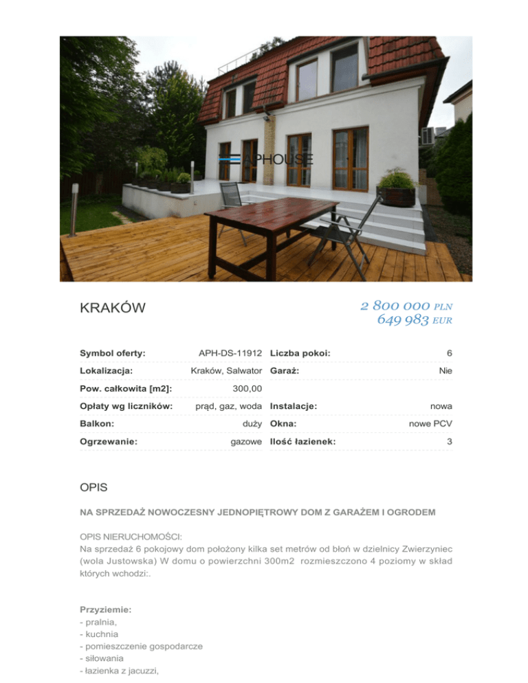 2 800 000 PLN 649 983 EUR KRAKÓW Symbol oferty: Lokalizacja: APH-DS-11912 Liczba pokoi: Kraków, Salwator Garaż: Pow. całkowita [m2]: Opłaty wg liczników: 6 Nie 300,00 prąd, gaz, woda Instalacje: Balkon: Ogrzewanie: duży Okna: nowa nowe PCV gazowe Ilość łazienek: 3 OPIS NA SPRZEDAŻ NOWOCZESNY JEDNOPIĘTROWY DOM Z GARAŻEM I OGRODEM OPIS NIERUCHOMOŚCI: Na sprzedaż 6 pokojowy dom położony kilka set metrów od błoń w dzielnicy Zwierzyniec (wola Justowska) W domu o powierzchni 300m2 rozmieszczono 4 poziomy w skład których wchodzi:. Przyziemie: - pralnia, - kuchnia - pomieszczenie gospodarcze - siłowania - łazienka z jacuzzi, - garaż dwustanowiskowy (wejście z garażu bezpośrednio do domu) Parter: - hall, - salon z kominkiem i wyjściem na taras, - kuchnia połączona z jadalnią, - toaleta Półpiętro: - duży salon, Piętro I: - 2 sypialnie, (w tym w jednej garderoba) - łazienka (prysznic, wanna) - 2 balkony II Półpiętro: - sypialnia Piętro II - sypialnia z tarasem - łazienka - garderoba Dom jest w pełni wyposażony i umeblowany w wysokim standardzie. Umeblowana i wyposażona kuchnia (płyta indukcyjna, piekarnik, lodówka,).W domu znajdują się dwa salony pierwszy może pełnić rolę rekreacyjny z sofą oraz kominkiem, a drugi może pełnić rolę sali telewizyjnej w którym znajduje się sofa duży telewizor. W sypialniach znajdują się podwójne łóżka oraz szafy. Dużym atutem domu jest duży taras oraz ogródek przynależny do domu na którym znajdują się meble ogrodowe. Dom wyposażony jest w klimatyzacje, alarm, elektryczne rolety zewnętrzne antywłamaniowe. Dodatkowo dom posiada garaż dwustanowiskowy oraz trzy miejsca parkingowe przed budynkiem. Ogrzewanie gazowe. OPIS BUDYNKU: Wolnostojący dom położony na działce o powierzchni 550m2 na małym osiedlu w którym jest zaledwie kilka domków. OPIS LOKALIZACJI: Cicha i spokojna okolica, mnóstwo terenów zielonych i rekreacyjnych. W najbliższym otoczenia znajduje się rzeka rudawa, błonie. Bardzo dobra infrastruktura ( liczne sklepy, restauracje, szkoły, przedszkola, basen siłowania korty tenisowe). Bardzo dobre połączenie z centrum miasta i oraz z autostradom. CENA: Cena najmu 2800000zł KONTAKT Marek Cygal +48 795 184 428 [email protected]