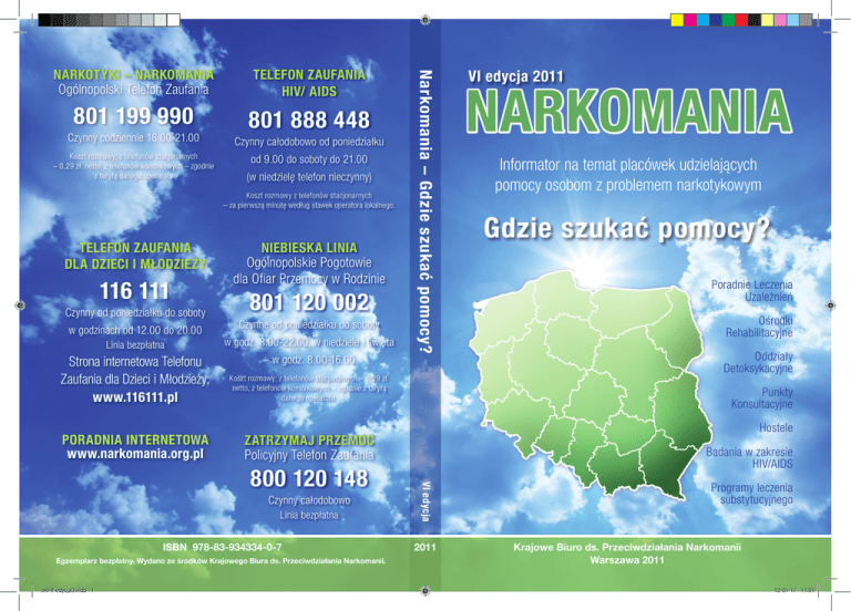 Telefon zaufania HIV/ AIDS 801 199 990 801 888 448 Czynny codziennie 16.00-21.00 Czynny całodobowo od poniedziałku Koszt rozmowy: z telefonów stacjonarnych – 0,29 zł. netto, z telefonów komórkowych – zgodnie z taryfą danego operatora od 9.00 do soboty do 21.00 (w niedzielę telefon nieczynny) Koszt rozmowy z telefonów stacjonarnych – za pierwszą minutę według stawek operatora lokalnego. Telefon Zaufania dla Dzieci i Młodzieży 116 111 Czynny od poniedziałku do soboty w godzinach od 12.00 do 20.00 Niebieska Linia Ogólnopolskie Pogotowie dla Ofiar Przemocy w Rodzinie 801 120 002 Czynne od poniedziałku do soboty Linia bezpłatna w godz. 8.00-22.00, w niedziele i święta Strona internetowa Telefonu Zaufania dla Dzieci i Młodzieży: www.116111.pl – w godz. 8.00-16.00 Poradnia Internetowa www.narkomania.org.pl Koszt rozmowy: z telefonów stacjonarnych – 0,29 zł. netto, z telefonów komórkowych – zgodnie z taryfą danego operatora. Linia bezpłatna ISBN 978-83-934334-0-7 Egzemplarz bezpłatny. Wydano ze środków Krajowego Biura ds. Przeciwdziałania Narkomanii. NARKOMANIA Informator na temat placówek udzielających pomocy osobom z problemem narkotykowym Gdzie szukać pomocy? Poradnie Leczenia Uzależnień Ośrodki Rehabilitacyjne Oddziały Detoksykacyjne Hostele Badania w zakresie HIV/AIDS VI edycja Czynny całodobowo VI edycja 2011 Punkty Konsultacyjne Zatrzymaj przemoc Policyjny Telefon Zaufania 800 120 148 okl-VIedycja3.indd 1 Narkomania – Gdzie szukać pomocy? NARKOTYKI – NARKOMANIA Ogólnopolski Telefon Zaufania 2011 Programy leczenia substytucyjnego Krajowe Biuro ds. Przeciwdziałania Narkomanii Warszawa 2011 12-01-17 11:01 województwo dolnośląskie NARKOMANIA Informator na temat placówek udzielających pomocy osobom z problemem narkotykowym Gdzie szukać pomocy? 1 województwo dolnośląskie 2 województwo dolnośląskie NARKOMANIA Informator na temat placówek udzielających pomocy osobom z problemem narkotykowym Gdzie szukać pomocy? Krajowe Biuro ds. Przeciwdziałania Narkomanii Warszawa 2011 3 województwo dolnośląskie Narkomania – Gdzie szukać pomocy? Informator na temat placówek udzielających pomocy osobom z problemem narkotykowym – VI edycja 2011 Dane na temat placówek zostały zebrane w roku 2011. Krajowe Biuro ds. Przeciwdziałania Narkomanii nie ponosi odpowiedzialności za treści dotyczące placówek zamieszczone w niniejszym Informatorze. Cyfrowa wersja Informatora zamieszczona jest na stronie: www.narkomania.gov.pl © Copyright by Krajowe Biuro ds. Przeciwdziałania Narkomanii Nadzór nad projektem: Krajowe Biuro ds. Przeciwdziałania Narkomanii Skład i projekt okładki Sumus www.sumus.com.pl tel.: 510 789 877 Druk i oprawa Drukarnia Read ME ul. Olechowska 83 92-403 Łódź ISBN 978-83-934334-0-7 Informator sfinansowany ze środków Krajowego Biura ds. Przeciwdziałania Narkomanii Egzemplarz bezpłatny 4 województwo dolnośląskie Spis treści Wstęp 9 WOJEWÓDZTWO DOLNOŚLĄSKIE Placówki ambulatoryjne Oddziały/Pododdziały detoksykacyjne Placówki stacjonarne Placówki prowadzące badania na obecność HIV Programy leczenia substytucyjnego 11 11 20 21 24 25 WOJEWÓDZTWO KUJAWSKO-POMORSKIE Placówki ambulatoryjne Oddziały/Pododdziały detoksykacyjne Placówki stacjonarne Placówki prowadzące badania na obecność HIV Programy leczenia substytucyjnego 27 27 33 33 35 36 WOJEWÓDZTWO LUBELSKIE Placówki ambulatoryjne Oddziały/Pododdziały detoksykacyjne Placówki stacjonarne Placówki prowadzące badania na obecność HIV Programy leczenia substytucyjnego 37 37 45 45 46 46 WOJEWÓDZTWO LUBUSKIE Placówki ambulatoryjne Oddziały/Pododdziały detoksykacyjne Placówki stacjonarne Placówki prowadzące badania na obecność HIV Programy leczenia substytucyjnego 47 47 57 57 59 60 WOJEWÓDZTWO ŁÓDZKIE Placówki ambulatoryjne Oddziały/Pododdziały detoksykacyjne Placówki stacjonarne Placówki prowadzące badania na obecność HIV Programy leczenia substytucyjnego 61 61 68 68 70 70 5 województwo spis treści dolnośląskie WOJEWÓDZTWO MAŁOPOLSKIE Placówki ambulatoryjne Oddziały/Pododdziały detoksykacyjne Placówki stacjonarne Placówki prowadzące badania na obecność HIV Programy leczenia substytucyjnego 71 71 75 75 77 77 WOJEWÓDZTWO MAZOWIECKIE Placówki ambulatoryjne Oddziały/Pododdziały detoksykacyjne Placówki stacjonarne Placówki prowadzące badania na obecność HIV Programy leczenia substytucyjnego 78 78 95 96 109 110 WOJEWÓDZTWO OPOLSKIE Placówki ambulatoryjne Placówki stacjonarne Placówki prowadzące badania na obecność HIV Programy leczenia substytucyjnego 112 112 119 121 121 WOJEWÓDZTWO PODKARPACKIE Placówki ambulatoryjne Placówki stacjonarne Placówki prowadzące badania na obecność HIV 122 122 124 125 Województwo PODLASKIE Placówki ambulatoryjne Oddziały/Pododdziały detoksykacyjne Placówki stacjonarne Placówki prowadzące badania na obecność HIV 126 126 129 130 131 WOJEWÓDZTWO POMORSKIE Placówki ambulatoryjne Oddziały/Pododdziały detoksykacyjne Placówki stacjonarne Placówki prowadzące badania na obecność HIV Programy leczenia substytucyjnego 133 133 141 141 148 148 WOJEWÓDZTWO ŚLĄSKIE Placówki ambulatoryjne Oddziały/Pododdziały detoksykacyjne Placówki stacjonarne Placówki prowadzące badania na obecność HIV Programy leczenia substytucyjnego 149 149 161 162 168 169 WOJEWÓDZTWO ŚWIĘTOKRZYSKIE Placówki ambulatoryjne Placówki stacjonarne Placówki prowadzące badania na obecność HIV Programy leczenia substytucyjnego 170 170 173 175 176 6 województwo dolnośląskie spis treści WOJEWÓDZTWO WARMIŃSKO-MAZURSKIE Placówki ambulatoryjne Oddziały/Pododdziały detoksykacyjne Placówki stacjonarne Placówki prowadzące badania na obecność HIV Programy leczenia substytucyjnego 177 177 181 181 183 183 WOJEWÓDZTWO WIELKOPOLSKIE Placówki ambulatoryjne Oddziały/Pododdziały detoksykacyjne Placówki stacjonarne Placówki prowadzące badania na obecność HIV Progra