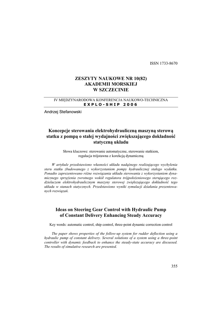 ISSN 1733-8670 ZESZYTY NAUKOWE NR 10(82) AKADEMII MORSKIEJ W SZCZECINIE IV MIĘDZYNARODOWA KONFERENCJA NAUKOWO-TECHNICZNA EXPLO-SHIP 2006 Andrzej Stefanowski Koncepcje sterowania elektrohydrauliczną maszyną sterową statku z pompą o stałej wydajności zwiększającego dokładność statyczną układu Słowa kluczowe: sterowanie automatyczne, sterowanie statkiem, regulacja trójstawna z korekcją dynamiczną W artykule przedstawiono własności układu nadążnego realizującego wychylenia steru statku zbudowanego z wykorzystaniem pompy hydraulicznej stałego wydatku. Ponadto zaprezentowano różne rozwiązania układu sterowania z wykorzystaniem dynamicznego sprzężenia zwrotnego wokół regulatora trójpołożeniowego sterującego rozdzielaczem elektrohydraulicznym maszyny sterowej zwiększającego dokładność tego układu w stanach statycznych. Przedstawiono wyniki symulacji działania prezentowanych rozwiązań. Ideas on Steering Gear Control with Hydraulic Pump of Constant Delivery Enhancing Steady Accuracy Key words: automatic control, ship control, three-point dynamic correction control The paper shows properties of the follow-up system for rudder deflection using a hydraulic pump of constant delivery. Several solutions of a system using a three-point controller with dynamic feedback to enhance the steady-state accuracy are discussed. The results of simulative research are presented. 355 Andrzej Stefanowski Wstęp Maszyna sterowa (MS) statku to urządzenie, od którego poprawnej i niezawodnej pracy zależy w znacznym stopniu bezpieczeństwo statku, szczególnie w wysokich stanach morza. W wysokich stanach morza, przy sterowaniu autopilotem, maszyna sterowa jest często przeciążana, tj. pracuje poza przedziałem projektowanych wskaźników, co prowadzi do nadmiernego nagrzania jej elementów (np. silników elektrycznych głównych i nastawczych, pomp hydraulicznych, siłowników) i czynnika roboczego – oleju hydraulicznego. Przeciążenie MS jest sygnalizowane alarmem. Reakcją na ten alarm jest działanie załogi polegające na odłączeniu maszyny od autopilota i sterowanie nią (i statkiem) w sposób ręczny przez sternika celem szybkiego jej ostudzenia. Powodów pracy MS poza przedziałami projektowych parametrów jest wiele. Najważniejszy z nich to zbyt mała moc MS dla tych wysokich stanów morza (moc maszyny porównywalna jest z mocą zakłóceń działających na statek od środowiska dla stanu morza 4). Dobór mocy MS dla potrzeb sterowania, np. utrzymania statku na kursie, jest zagadnieniem oddzielnym i nie będzie rozpatrywany w niniejszym artykule. Jednym z działań odciążających maszynę sterową jest ograniczenie ilości niepotrzebnych nawrotów na skutek przeregulowania w stosunku do zadanej wartości jej wychylenia będącego wynikiem znacznej bezwładności mechanizmu i opóźnienia w działaniu. Problem dotyczy szczególnie maszyn sterowych z pompą hydrauliczną stałego wydatku sterowaną w sposób skokowy – regulatorem trójpołożeniowym. 1. Cechy maszyny sterowej statku jako obiektu sterowania Z punktu widzenia automatyki, elektro-hydrauliczna maszyna sterowa z pompą o stałej wydajności charakteryzuje się, między innymi, następującymi własnościami wynikającymi z założeń projektowych, jak i z przyjętych rozwiązań konstrukcyjnych: – podstawowym rodzajem pracy jest praca w układzie nadążnym (nadążanie za sygnałem regulatora kursu – sterowanie automatyczne statkiem, bądź za sygnałem wytwarzanym w przetworniku związanym z kołem sterowym – sterowanie ręczne statkiem); – posiada ograniczoną moc w stosunku do potrzeb sterowania automatycznego przy wysokich stanach morza; – posiada ograniczoną maksymalną prędkość kątową przestawiania steru (3 – 6°/s); – ma ograniczony zakres przestawiania steru (–35° +35°); 356 Koncepcje sterowania elektrohydrauliczną maszyną sterową statku... – charakteryzują się dużą bezwładnością części mechanicznej; – pasmo przenoszenia sygnałów harmonicznych jest znacznie ograniczone od góry z uwagi na ograniczoną moc i ograniczoną prędkość ; – dynamika członu siłowego może być przedstawiona dynamiką elementu całkującego z inercją i opóźnieniem, w której wzmocnienie i stała czasowa zależą od wielkości wychylenia steru oraz od kierunku obrotu steru – w kierunku burty lub kierunku płaszczyzny symetrii kadłuba (moment siły powstającej na wychylonej płetwie steru względem osi obrotu trzonu sterowego dodaje się lub odejmuje od momentu napędowego maszyny); – wykazuje pewne opóźnienie czasowe w działaniu w stosunku do sterowania; – sterowanie kierunkiem przepływu oleju do cylindrów roboczych maszyny jest sterowaniem silnie nieliniowym („trójpołożeniowym” z nieczułością i histerezą). Dla analizy działania MS i modelowania procesów dynamicznych przyjmuje się szereg założeń upraszczających np.: stałość wzmocnienia i stałych czasowych członu siłowego, przestawianie rozdzielaczy elektrohydraulicznych w pomijalnie krótkim czasie, stałość napięcia zasilającego silnik napędowy pompy, brak wpływu na ciśnienie w układzie zaworów bezpieczeństwa, stałość charakterystyk przetworników itp. 2. Koncepcje sterowania 2.1. Ogólne założenia Przykładową realizację uproszczonego sterowania MS z pompą o stałej wydajności pokazano na rysunku 1. W uproszczeniu działanie układu można przedstawić następująco: Zmiana zadanej wartości kąta wychylenia steru βo, która daje wartość błędu ε większą od progu działania regulatora trójpołożeniowego powoduje zasilenie jednej z cewek rozdzielacza elektrohydraulicznego np. EPB prawej burty, co powoduje przyłączenie pompy do cylindra roboczego siłownika i ruch steru w kierunku prawej burty. Przestawianie steru powoduje zmianę sygnału β rzeczywistego kąta wychylenia steru dającego zmniejszenie sygnału błędu ε. Po zmniejszeniu ε do w