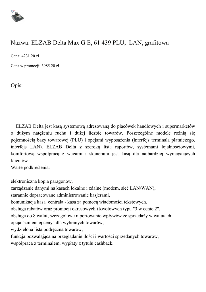 Nazwa: ELZAB Delta Max G E, 61 439 PLU, LAN, grafitowa Cena: 4231.20 zł Cena w promocji: 3985.20 zł Opis: ELZAB Delta jest kasą systemową adresowaną do placówek handlowych i supermarketów o dużym natężeniu ruchu i dużej liczbie towarów. Poszczególne modele różnią się pojemnością bazy towarowej (PLU) i opcjami wyposażenia (interfejs terminala płatniczego, interfejs LAN). ELZAB Delta z szeroką listą raportów, systemami lojalnościowymi, komfortową współpracą z wagami i skanerami jest kasą dla najbardziej wymagających klientów. Warte podkreślenia: elektroniczna kopia paragonów, zarządzanie danymi na kasach lokalne i zdalne (modem, sieć LAN/WAN), starannie dopracowane administrowanie kasjerami, komunikacja kasa centrala - kasa za pomocą wiadomości tekstowych, obsługa rabatów oraz promocji okresowych i kwotowych typu "3 w cenie 2", obsługa do 8 walut, szczegółowe raportowanie wpływów ze sprzedaży w walutach, opcja "zmiennej ceny" dla wybranych towarów, wydzielona lista podręczna towarów, funkcja pozwalająca na przeglądanie ilości i wartości sprzedanych towarów, współpraca z terminalem, wypłaty z tytułu cashback. Współpraca z terminalami kart płatniczych Kasa ELZAB Delta Max E współpracuje z terminalami firm FirstData (dawny Polcard), eService oraz Elavon. Są to dla FirstData i eService terminale Verifone Vx510, a dla Elavon model Hypercom Optimum T4200. Współpracując z terminalem kasa ma możliwość rejestracji i raportowania wypłat z tytułu cashback pod warunkiem, że terminal kart płatniczych realizuje funkcjonalność związaną z usługą cashback. Współpraca z drukarką zamówień Gniazdo EXT służy do podłączenia do kasy drukarki ELZAB Kuchta albo ELZAB Talos. W przypadku drukarki ELZAB Kuchta na drukarkę wysyłane są nazwy i ilości sprzedanych towarów. Dodatkowo drukowany jest numer zamówienia, numer kasy i kasjera oraz data i czas. Monitoring sprzedaży Przez złącze rozszerzeń (EXT) możliwe jest przekazywanie zdarzeń z kasy na rejestrator do obsługi video - monitoringu transakcji. Zarządzanie obsługującymi na kasie W modelu ELZAB Delta Max E starannie dopracowana została kwestia zarządzania kasjerami. Poprzez możliwość przyporządkowania poszczególnych sprzedających do ról, jakie pełnią w sklepie, a co za tym idzie przydzielenia im uprawnień do tych funkcji i raportów, do których mają uprawniony dostęp, właściciel urządzenia może być pewny szczegółowego rozliczenia zarówno samych kasjerów, jak i zmiany. Do ról poszczególnych sprzedających można przydzielić miedzy innymi maksymalny rabat/ narzut. automatyczne wylogowanie kasjera W konfiguracji kasy można zdefiniować czas, po którym ma nastąpić automatyczne wylogowanie kelnera, jeśli jest on nieaktywny i nie ma otwartego paragonu. Wylogowanie może również nastąpić po zamknięciu paragonu. Funkcje usprawniające obsługę: Lista podręczna Dla wygody prowadzenia sprzedaży w kasie ELZAB Delta Max E wprowadzono listę podręczną towarów. Do listy tej można przyporządkować dowolną ilość towarów z bazy, lista jest dostępna pod klawiszem funkcyjnym na klawiaturze kasy. Lista podręczna upraszcza wyszukiwanie określonej grupy towarów, np. takich, które nie mają nadanego kodu kreskowego, są najczęściej sprzedawane, a nie mieszczą się na klawiszach szybkiej sprzedaży. Naciśnięcie klawisza listy podręcznej otwiera listę, po której można się przemieszczać klawiszami strzałek lub szukać po nazwie. Tryby sprzedaży Sprzedaż na kasie można prowadzić zarówno w trybie komputerowym jak i ECR zależnie od tego, do którego sposobu przyzwyczajony jest użytkownik. Edycja paragonu, podgląd sprzedaży Przed zamknięciem paragonu posługując się klawiszami strzałek można poruszać się po paragonie. Funkcja edycji paragonu przy długich paragonach może być wykorzystywana do kontroli poszczególnych pozycji paragonu. Możliwe jest kasowanie pozycji, warunkiem jest posiadanie odpowiedniego uprawnienia. W czasie tworzenia paragonu możliwe jest wyświetlenie wartości podsumy paragonu oraz sumarycznej ilości zrealizowanych pozycji. Funkcja "wyświetl sprzedaż" pozwala na przeglądanie ilości i wartości sprzedanych towarów, a dla opakowań zwrotnych dodatkowo ilości i wartości zwrotów. W dzisiejszych czasach liczy się szybkość Szybkość transmisji, szybkość wydruku paragonów i raportów, szybkość programowania kasy to parametry, które sprawiają, że jest to najlepsza kasa na rynku: - szybkość druku: 19 wierszy/s (66,5 mm/s) - wczytanie bazy 20 tys. PLU: transmisja RS232 przy ustawionej prędkości 57 600b/s - 2 min. 35 s - transmisja modemowa, przesłanie bazy 5 tys. PLU, modem PSTN przy ustawionej prędkości 57 600b/s - 3 min. 31 s Wiadomości sms - informacje z kasy prosto do centrali Za pośrednictwem funkcji "wiadomości kasjera" kasa ELZAB Delta Max E pozwala komunikować się w instalacjach rozproszonych pomiędzy sklepem a centralą. Funkcja pozwala na przykład na zrealizowanie zamówienia sklepu do centrali. Treść wiadomości wychodzącej zapisywana jest do bufora kasy i podobnie jak pozycje paragonowe, podczas transmisji przesyłana do centrali. Dane techniczne: Typ: systemowa kasa rejestrująca PLU: 61 439 Grupy towarów: 99 Stawki VAT: 7 Opis towaru: nazwa o długości do 18 znaków, stawka VAT, grupa towarowa, jednostka miary, liczba miejsc po przecinku do określania ilości, kod kreskowy, cena jednostkowa, atrybuty: blokada, opakowanie, wyłączenie z rabatu/ narzutu, zmienna cena, przynależność do listy Ilość dodatkowych kodów kreskowych: 11 700 Kasjerzy: 30 Ilość opakowań zwrotnych: 64 Ilość towarów wiązanych: 256 Ilość pozycji paragonowych w buforze: 48 896 Pamięć fiskalna: 2 060 zapisów Mechanizm drukujący: mechanizm termiczny, 40 znaków w wierszu, 19 wierszy/sek., atrybuty: podwójna szerokość i podwójna wysokość Wyświetlacz 