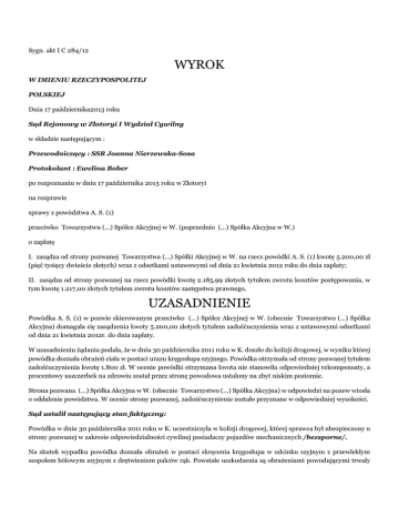 Sygn. akt I C 284/12 WYROK W IMIENIU RZECZYPOSPOLITEJ POLSKIEJ Dnia 17 października2013 roku Sąd Rejonowy w Złotoryi I Wydział Cywilny w składzie następującym : Przewodniczący : SSR Joanna Nierzewska-Sosa Protokolant : Ewelina Bober po rozpoznaniu w dniu 17 października 2013 roku w Złotoryi na rozprawie sprawy z powództwa A. S. (1) przeciwko Towarzystwu (...) Spółce Akcyjnej w W. (poprzednio (...) Spółka Akcyjna w W.) o zapłatę I. zasądza od strony pozwanej Towarzystwa (...) Spółki Akcyjnej w W. na rzecz powódki A. S. (1) kwotę 5.200,00 zł (pięć tysięcy dwieście złotych) wraz z odsetkami ustawowymi od dnia 21 kwietnia 2012 roku do dnia zapłaty; II. zasądza od strony pozwanej na rzecz powódki kwotę 2.185,99 złotych tytułem zwrotu kosztów postępowania, w tym kwotę 1.217,00 złotych tytułem zwrotu kosztów zastępstwa prawnego. UZASADNIENIE Powódka A. S. (1) w pozwie skierowanym przeciwko (...) Spółce Akcyjnej w W. (obecnie Towarzystwo (...) Spółka Akcyjna) domagała się zasądzenia kwoty 5.200,00 złotych tytułem zadośćuczynienia wraz z ustawowymi odsetkami od dnia 21 kwietnia 2012r. do dnia zapłaty. W uzasadnieniu żądania podała, że w dniu 30 października 2011 roku w K. doszło do kolizji drogowej, w wyniku której powódka doznała obrażeń ciała w postaci urazu kręgosłupa szyjnego. Powódka otrzymała od strony pozwanej tytułem zadośćuczynienia kwotę 1.800 zł. W ocenie powódki otrzymana kwota nie stanowiła odpowiedniej rekompensaty, a procentowy uszczerbek na zdrowiu został przez stronę powodowa ustalony na zbyt niskim poziomie. Strona pozwana (...) Spółka Akcyjna w W. (obecnie Towarzystwo (...) Spółka Akcyjna) w odpowiedzi na pozew wiosła o oddalenie powództwa. W ocenie strony pozwanej, zadośćuczynienie zostało przyznane w odpowiedniej wysokości. Sąd ustalił następujący stan faktyczny: Powódka w dniu 30 października 2011 roku w K. uczestniczyła w kolizji drogowej, której sprawca był ubezpieczony u strony pozwanej w zakresie odpowiedzialności cywilnej posiadaczy pojazdów mechanicznych /bezsporne/. Na skutek wypadku powódka doznała obrażeń w postaci skręcenia kręgosłupa w odcinku szyjnym z przewlekłym zespołem bólowym szyjnym z drętwieniem palców rąk. Powstałe uszkodzenia są obrażeniami powodującymi trwały uszczerbek na zdrowiu wynoszący 5%. Obrażenia powódki wymagały wykonania zdjęcia rentgenowskiego, założenia kołnierza ortopedycznego, leczenia farmakologicznego i rehabilitacji. Obecnie nadal występują u powódki bóle głowy, kręgosłupa i drętwienie rąk. Powódka ma problemy z wykonywaniem pracy zawodowej, prac domowych oraz codziennych czynności w prowadzeniu gospodarstwa domowego jak gotowanie czy sprzątanie. Powódka ma 41 lat. Pracuje jako sprzątaczka. Przed wypadkiem była osoba samodzielną, w pełni sprawną i aktywną. W wyniku doznanych urazów stała się w wielu czynnościach uzależniona od męża i dzieci, a w pracy zmuszona jest korzystać z pomocy koleżanki. Brak pełnej sprawności powoduje u niej obawę przed utratą pracy. Sprawca wypadku był ubezpieczony w zakresie odpowiedzialności cywilnej u strony pozwanej. W toku likwidacji szkody, strona pozwana wypłaciła na rzecz powódki kwotę 1.800 złotych tytułem zadośćuczynienia za doznaną krzywdę. Dowód: - opinia biegłego sądowego J. B. - k.49-50, - opinia biegłej sądowej A. K. – k.105-106, - akta szkody nr 953477, - wyjaśnienia powódki A. S. – k.35-35v.; Przy tak ustalonym stanie faktycznym Sąd zważył, że powództwo zasługuje na uwzględnienie w całości. Bezspornym w sprawie jest, że dnia 30 października 2011 roku doszło do wypadku, na skutek, którego powódka A. S. (1) poniosła szkodę. Sprawca wypadku, był ubezpieczony u strony pozwanej, która w toku likwidacji szkody wypłaciła powódce kwotę 1.800 złotych. Sporna pozostaje natomiast kwestia wysokości należnego powódce zadośćuczynienia. Zgodnie z art. 445§1 kc w przypadku uszkodzenia ciała lub rozstroju zdrowia, Sąd może przyznać poszkodowanemu odpowiednia sumę tytułem zadośćuczynienia za doznaną krzywdę. Krzywda ujmowana jest jako cierpienie fizyczne i psychiczne tj. jako ujemne uczucia przeżywane w związku z cierpieniami fizycznymi lub następstwami uszkodzenia ciała. Przyznanie zadośćuczynienia nie jest obligatoryjne i zależy od oceny Sądu, opartej na całokształcie okoliczności sprawy. W ocenie Sądu, ustalona przez stronę pozwaną kwota 1.800 złotych nie pozwala na złagodzenie doznanej przez powódkę krzywdy. Ze zgromadzonego w spawie materiału dowodowego, a w szczególności z opinii biegłych sądowych, dokumentacji medycznej, a także z wyjaśnień powódki wynika, iż na skutek wypadku doznała ona urazów, które wymagały kilkutygodniowego leczenia i zabiegów rehabilitacyjnych. W związku z odniesionymi na skutek wypadku obrażeniami, powódka odczuwała ból i cierpienie. W okresie leczenia przyjmowała leki przeciwbólowe. Obecnie nadal odczuwa ból oraz dysfunkcję narządu ruchu. Dolegliwości bólowe oraz ruchowe ograniczają powódkę w wykonywaniu czynności życia codziennego. Utrudniają wykonywanie pracy zawodowej i codziennych prac w gospodarstwie domowym. Powódka nie może się schylać ani dźwigać. Musi korzystać z pomocy rodziny i współpracowników. Od czasu wypadku ogólny poziom funkcjonowania powódki uległ znacznemu pogorszeniu. Uszczerbek na zdrowiu powódki ustalony w toku postępowania przez biegłego sądowego wynosi 5%. Wypłacona powódce kwota 1.800 złotych nie jest adekwatna do poniesionego przez powódkę uszczerbku. W ocenie Sądu kwotą adekwatną do stopnia odniesionych przez powódkę obrażeń, trwałości ich następstw i aktualnych warunków ekonomicznych panujących w kraju jest żądana przez powódkę kwota łącznie 7.000 złotych. Na skutek zdarzenia powódka poniosła uszczerbek na zdrowiu zarówno w sferze psychicznej j