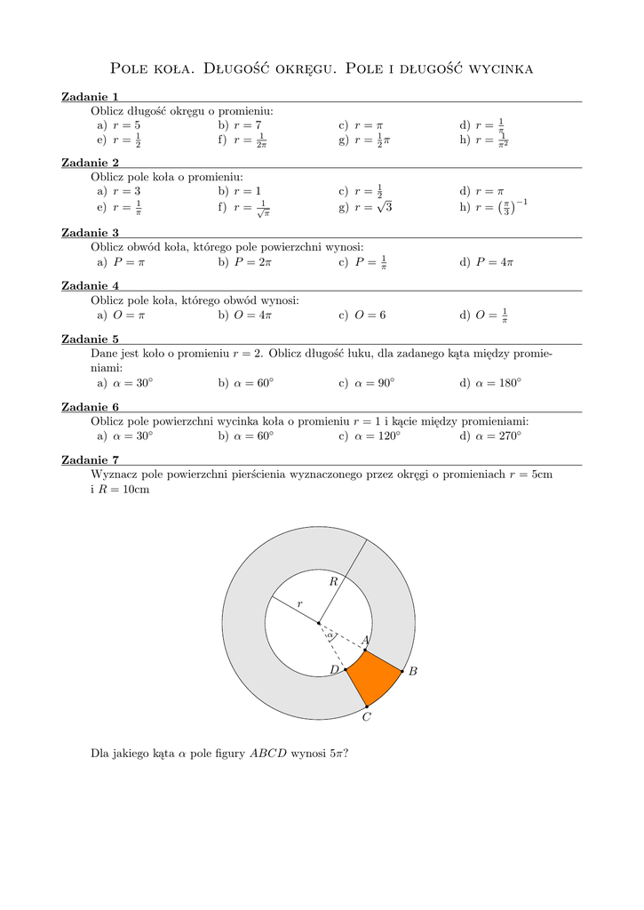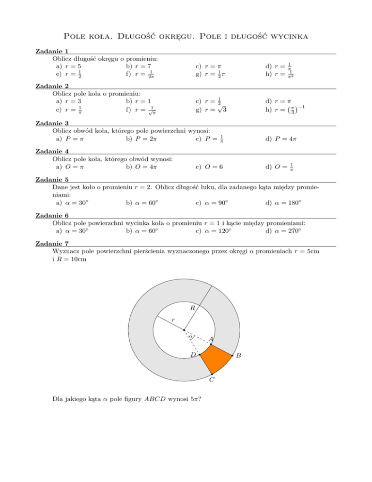 Pole koła. Długość okręgu. Pole i długość wycinka Zadanie 1 Oblicz długość okręgu o promieniu: a) r = 5 b) r = 7 1 1 e) r = 2 f) r = 2π c) r = π g) r = 21 π d) r = h) r = Zadanie 2 Oblicz pole koła o promieniu: a) r = 3 b) r = 1 e) r = π1 f) r = √1π c) r = 21 √ g) r = 3 d) r = π −1 h) r = π3 Zadanie 3 Oblicz obwód koła, którego pole powierzchni wynosi: a) P = π b) P = 2π c) P = Zadanie 4 Oblicz pole koła, którego obwód wynosi: a) O = π b) O = 4π 1 π 1 π 1 π2 d) P = 4π c) O = 6 d) O = 1 π Zadanie 5 Dane jest koło o promieniu r = 2. Oblicz długość łuku, dla zadanego kąta między promieniami: a) α = 30◦ b) α = 60◦ c) α = 90◦ d) α = 180◦ Zadanie 6 Oblicz pole powierzchni wycinka koła o promieniu r = 1 i kącie między promieniami: a) α = 30◦ b) α = 60◦ c) α = 120◦ d) α = 270◦ Zadanie 7 Wyznacz pole powierzchni pierścienia wyznaczonego przez okręgi o promieniach r = 5cm i R = 10cm R r α A D B C Dla jakiego kąta α pole figury ABCD wynosi 5π?