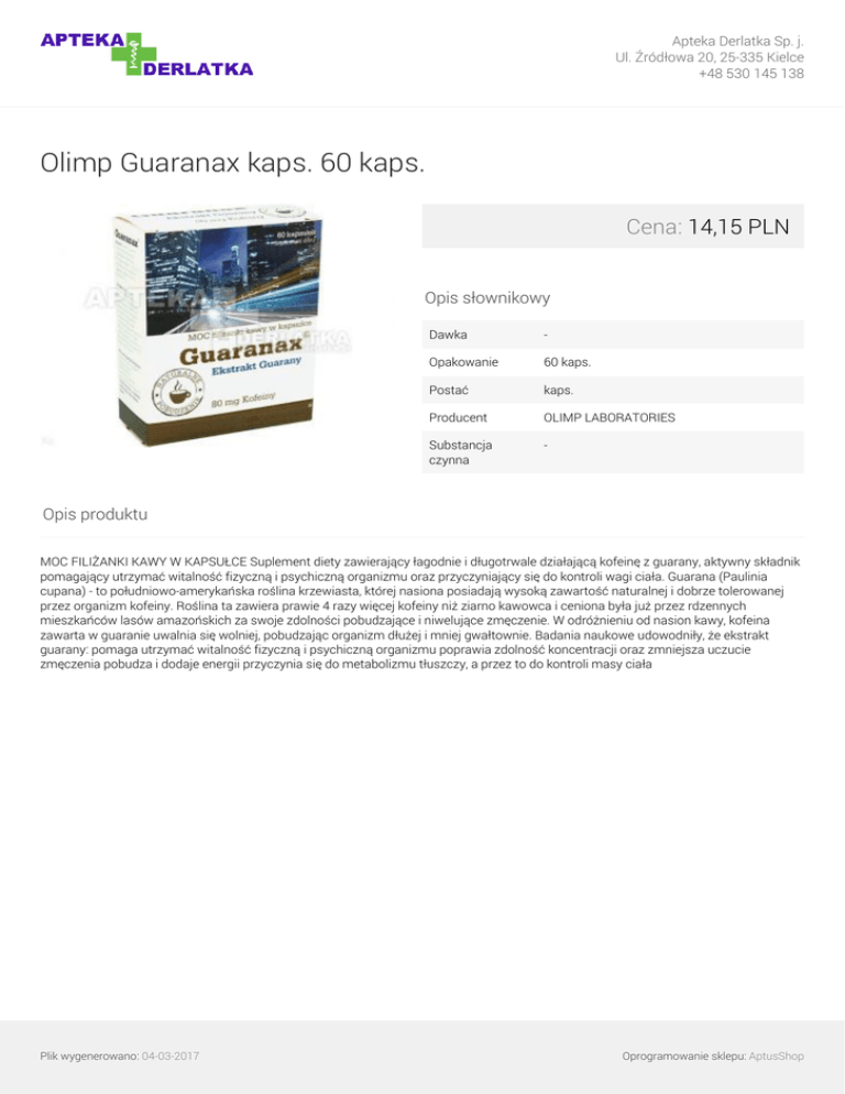 Apteka Derlatka Sp. j. Ul. Źródłowa 20, 25-335 Kielce +48 530 145 138 Olimp Guaranax kaps. 60 kaps. Cena: 14,15 PLN Opis słownikowy Dawka - Opakowanie 60 kaps. Postać kaps. Producent OLIMP LABORATORIES Substancja czynna - Opis produktu MOC FILIŻANKI KAWY W KAPSUŁCE Suplement diety zawierający łagodnie i długotrwale działającą kofeinę z guarany, aktywny składnik pomagający utrzymać witalność fizyczną i psychiczną organizmu oraz przyczyniający się do kontroli wagi ciała. Guarana (Paulinia cupana) - to południowo-amerykańska roślina krzewiasta, której nasiona posiadają wysoką zawartość naturalnej i dobrze tolerowanej przez organizm kofeiny. Roślina ta zawiera prawie 4 razy więcej kofeiny niż ziarno kawowca i ceniona była już przez rdzennych mieszkańców lasów amazońskich za swoje zdolności pobudzające i niwelujące zmęczenie. W odróżnieniu od nasion kawy, kofeina zawarta w guaranie uwalnia się wolniej, pobudzając organizm dłużej i mniej gwałtownie. Badania naukowe udowodniły, że ekstrakt guarany: pomaga utrzymać witalność fizyczną i psychiczną organizmu poprawia zdolność koncentracji oraz zmniejsza uczucie zmęczenia pobudza i dodaje energii przyczynia się do metabolizmu tłuszczy, a przez to do kontroli masy ciała Plik wygenerowano: 04-03-2017 Powered by TCPDF (www.tcpdf.org) Oprogramowanie sklepu: AptusShop