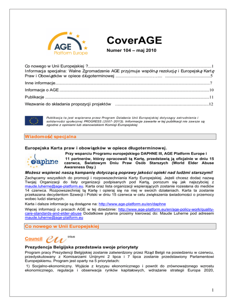 CoverAGE Numer 104 maj 2010 Co nowego w Unii Europejskiej ?.................................................................................................................1 Informacja specjalna: Walne Zgromadzenie AGE przyjmuje wspóln rezolucj i Europejsk Kart Praw i Obowi zków w opiece d ugoterminowej .................................. .... ......................................5 Inne informacje..............................................................................................................................................7 Informacje o AGE .........................................................................................................................................10 Publikacje ......................................................................................................................................................11 Wezwanie do sk adania propozycji projektów .......................................................................12 Publikacj a t a j est w spierana przez Program Dzia ania Unii Europej skiej dot ycz cy zat rudnienia i solidarno ci spo ecznej PROGRESS ( 2007- 2013). Informacje zawarte w tej publikacji nie zawsze s zgodne z opiniami lub stanowiskiem Komisji Europejskiej Wiadomo specjalna Europejska Karta praw i obow i zków w opiece d ugoterminow ej. Przy wsparciu Programu europejskiego DAPHNE III, AGE Platform Europe i 11 partnerów, którzy opracowali t Kart , przedstawi j oficjalnie w dniu 15 czerwca, wiatowym Dniu Praw Osób Starszych (World Elder Abuse Awareness Day.) Mo esz wspiera nasz kampani dotycz c poprawy jako ci opieki nad lud mi starszymi! Zach camy wszystkich do promocji i rozpowszechniania Karty Europejskiej. Je eli chcesz doda nazw Twojej Organizacji do listy organizacji podpisanych pod Kart , porozum si jak najszybciej z [email protected]. Karta oraz lista organizacji wspieraj cych zostanie rozes ana do mediów 14 czerwca. Rozpowszechniaj t Kart i opieraj si na niej w swoich dzia aniach. Karta ta zostanie przekazana decydentom Szwecji i Polski w dniu 15 czerwca w celu zwi kszenia wiadomo ci o przemocy wobec ludzi starszych. Karta i dalsze informacje s dost pne na: http://www.age-platform.eu/en/daphne Wi cej informacji o pracach AGE w tej dziedzinie: http://www.age-platform.eu/en/age-policy-work/qualitycare-standards-and-elder-abuse Dodatkowe pytania prosimy kierowa do: Maude Luherne pod adresem [email protected] Co nowego w Unii Europejskiej Council Prezydencja Belgijska przedstawia swoje priorytety Program pracy Prezydencji Belgijskiej zostanie zatwierdzony przez Rz d Belgii na posiedzeniu w czerwcu, przedyskutowany z Komisarzami Unijnymi 2 lipca i 7 lipca zostanie przedstawiony Parlamentowi Europejskiemu. Program jest oparty na 5 priorytetach: 1) Socjalno-ekonomiczny. Wyj cie z kryzysu ekonomicznego i powrót do zrównowa onego wzrostu ekonomicznego, regulacja i obserwacja rynków kapita owych, wdra anie strategii Europa 2020, 1 zatwierdzenie wytycznych dotycz cych zatrudnienia i miejsc pracy, rozwój struktur ponad granicznych w dziedzinach takich jak dostawy energii; 2) Sprawy socjalne i opieku cze. Studium zmian socjalnych przez opracowanie wska ników i wyznaczanie celów, dalsza debata o us ugach po ytku publicznego, wzmocnienie bezpiecze stwa socjalnego w ramach Europejskiego Roku walki z ubóstwem i wykluczeniem spo ecznym, podkre lenie warto ci dodanych w zdrowiu publicznym oraz starzej cym si spo ecze stwie, zwrócenie specjalnej uwagi na przemoc wobec kobiet; 3) rodowisko. Zmniejszenie emisji gazów cieplarnianych w ramach przygotowa do szczytu UN COP16 w Cancun, wp yw zewn trznych kosztów transportu l dowego na u ytkowników, przygotowanie 10 konferencji na temat bioró norodno ci i poprawienie szeregu praw europejskich w dziedzinie ochrony rodowiska; 4) Sprawiedliwo / Wolno / Bezpiecze stwo. Wdro enie programu Sztokholmskiego; 5) Polityka zagraniczna. Powo anie nowego europejskiego korpusu dyplomatycznego i External Action Service (EEAS), Sprawa wej cia do Unii Chorwacji i Turcji. Prezydencja Hiszpa ska chce w ykorzysta nauk do walki z ubóstwem Wyniki konferencji o roli nauki w walce z ubóstwem i wykluczeniem spo ecznym, Science Against Poverty , zorganizowanej przez prezydencj Hiszpa sk w dniach 8 i 9 kwietnia w La Granja (Segovia), zosta y przedstawione przez Hiszpa skiego Ministra Nauki i Wynalazko ci Pani Cristina Garmendia na spotkaniu Rady Konkurencyjno ci (Competitiveness Counci), w dniu 26 maja w Brukseli. Dokument ten powinien zjednoczy spo ecze stwo w walce z ubóstwem i wykorzysta mo liwo ci tworzone przez zmiany klimatyczne w walce z obecnym kryzysem. Hiszpa ski Sekretarz Stanu do spraw bada Felipe Petriz Calvo zaprosi Kraje cz onkowskie do podj cia dzia a w celu wykorzystania nauki w walce z ubóstwem, podkre laj c zbie no tego celu ze wzrostem konkurencyjno ci, poniewa je eli chcemy produkowa wi cej, musimy to robi lepiej. Trzystu ekspertów, przedstawicieli organizacji politycznych i spo ecznych z 46 krajów wzi o udzia w konferencji, która mia a na celu zwi kszenie wiadomo ci o socjalnej odpowiedzialno ci naukowców i badaczy. Nauka i technologia nie maj zdefiniowanej roli w rozwoju spo ecze stwa, nadal nie zajmuj w a ciwego im miejsca. Nigdy te walka z ubóstwem nie by a celem polityki naukowej i rozwoju powiedzia Peiriz. http://www.scienceagainstpoverty.com/Publico/Home/index.aspx?idioma=en http://www.scienceagainstpoverty.com/Publico/Resultados/conclusiones/index.aspx?idioma=en Rada jednog o nie popar a Europejsk Agend Cyfrow . W dniu 31 maja, Rada ds. Transportu i Energii (Telecom Concil) przyj a dokument zawieraj cy wnioski popieraj ce Europejsk Agend Cyfrow , która zosta a og oszona w Grenadzie, jako cz Strategii Europa 2020, maj cej na celu wzrost i zatrudnienie. Agenda zosta a przedstawiona Komisji w dniu 19 maja tego roku. W Agenda wskazuje na siedem dziedzin priorytetowych takich jak: stworzenie jednego rynku cyfrowego, zwi kszenie zaufania i bezpiecze stwa internetu, szybsz