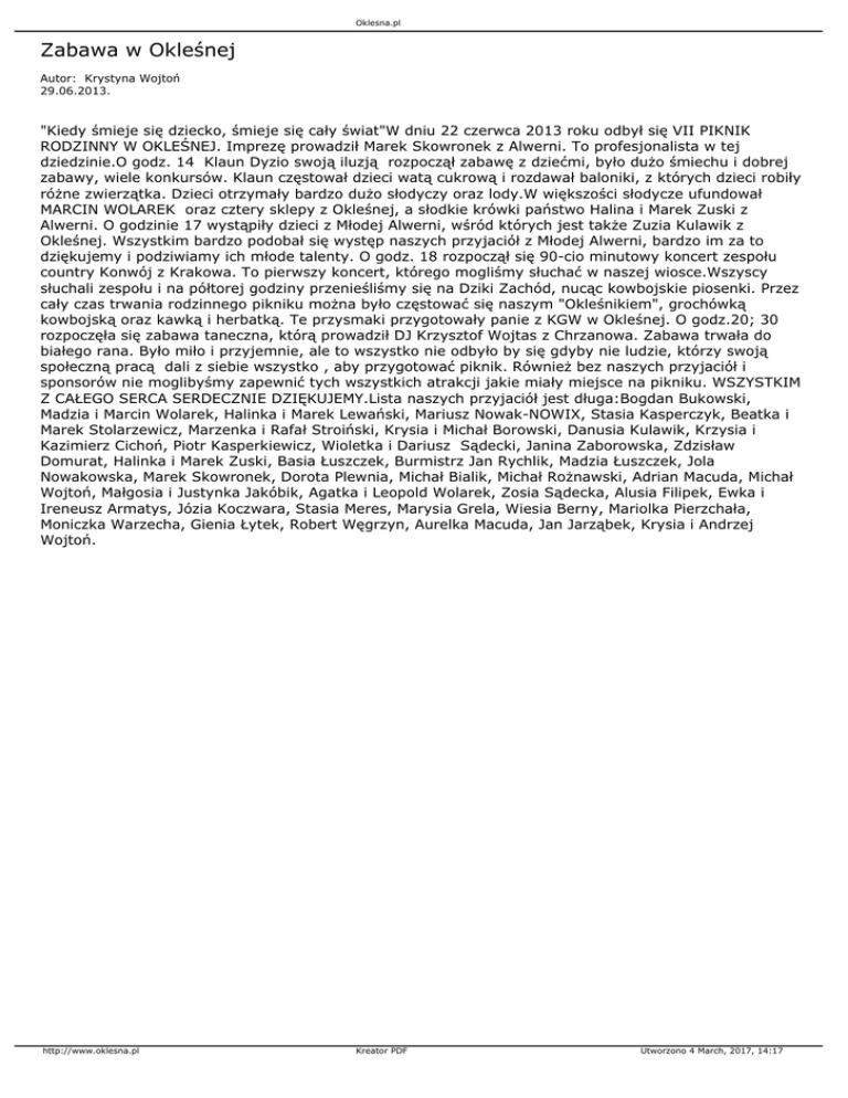 Oklesna.pl Zabawa w Okleśnej Autor: Krystyna Wojtoń 29.06.2013. "Kiedy śmieje się dziecko, śmieje się cały świat"W dniu 22 czerwca 2013 roku odbył się VII PIKNIK RODZINNY W OKLEŚNEJ. Imprezę prowadził Marek Skowronek z Alwerni. To profesjonalista w tej dziedzinie.O godz. 14 Klaun Dyzio swoją iluzją rozpoczął zabawę z dziećmi, było dużo śmiechu i dobrej zabawy, wiele konkursów. Klaun częstował dzieci watą cukrową i rozdawał baloniki, z których dzieci robiły różne zwierzątka. Dzieci otrzymały bardzo dużo słodyczy oraz lody.W większości słodycze ufundował MARCIN WOLAREK oraz cztery sklepy z Okleśnej, a słodkie krówki państwo Halina i Marek Zuski z Alwerni. O godzinie 17 wystąpiły dzieci z Młodej Alwerni, wśród których jest także Zuzia Kulawik z Okleśnej. Wszystkim bardzo podobał się występ naszych przyjaciół z Młodej Alwerni, bardzo im za to dziękujemy i podziwiamy ich młode talenty. O godz. 18 rozpoczął się 90-cio minutowy koncert zespołu country Konwój z Krakowa. To pierwszy koncert, którego mogliśmy słuchać w naszej wiosce.Wszyscy słuchali zespołu i na półtorej godziny przenieśliśmy się na Dziki Zachód, nucąc kowbojskie piosenki. Przez cały czas trwania rodzinnego pikniku można było częstować się naszym "Okleśnikiem", grochówką kowbojską oraz kawką i herbatką. Te przysmaki przygotowały panie z KGW w Okleśnej. O godz.20; 30 rozpoczęła się zabawa taneczna, którą prowadził DJ Krzysztof Wojtas z Chrzanowa. Zabawa trwała do białego rana. Było miło i przyjemnie, ale to wszystko nie odbyło by się gdyby nie ludzie, którzy swoją społeczną pracą dali z siebie wszystko , aby przygotować piknik. Również bez naszych przyjaciół i sponsorów nie moglibyśmy zapewnić tych wszystkich atrakcji jakie miały miejsce na pikniku. WSZYSTKIM Z CAŁEGO SERCA SERDECZNIE DZIĘKUJEMY.Lista naszych przyjaciół jest długa:Bogdan Bukowski, Madzia i Marcin Wolarek, Halinka i Marek Lewański, Mariusz Nowak-NOWIX, Stasia Kasperczyk, Beatka i Marek Stolarzewicz, Marzenka i Rafał Stroiński, Krysia i Michał Borowski, Danusia Kulawik, Krzysia i Kazimierz Cichoń, Piotr Kasperkiewicz, Wioletka i Dariusz Sądecki, Janina Zaborowska, Zdzisław Domurat, Halinka i Marek Zuski, Basia Łuszczek, Burmistrz Jan Rychlik, Madzia Łuszczek, Jola Nowakowska, Marek Skowronek, Dorota Plewnia, Michał Bialik, Michał Rożnawski, Adrian Macuda, Michał Wojtoń, Małgosia i Justynka Jakóbik, Agatka i Leopold Wolarek, Zosia Sądecka, Alusia Filipek, Ewka i Ireneusz Armatys, Józia Koczwara, Stasia Meres, Marysia Grela, Wiesia Berny, Mariolka Pierzchała, Moniczka Warzecha, Gienia Łytek, Robert Węgrzyn, Aurelka Macuda, Jan Jarząbek, Krysia i Andrzej Wojtoń. http://www.oklesna.pl Kreator PDF Utworzono 4 March, 2017, 14:17
