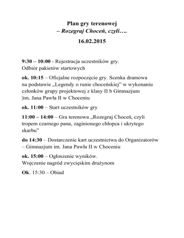 Plan gry terenowej – Rozegraj Choceń, czyli…. 16.02.2015 9:30 – 10:00 - Rejestracja uczestników gry. Odbiór pakietów startowych ok. 10:15 – Oficjalne rozpoczęcie gry. Scenka dramowa na podstawie „Legendy o runie choceńskiej” w wykonaniu członków grupy projektowej z klasy II b Gimnazjum |im. Jana Pawła II w Choceniu ok. 11:00 – Start uczestników gry 11:00 – 14:00 – Gra terenowa „Rozegraj Choceń, czyli tropem czarnego pana, zaginionego chłopca i ukrytego skarbu” do 14:30 – Dostarczenie kart uczestnictwa do Organizatorów – Gimnazjum im. Jana Pawła II w Choceniu ok. 15:00 – Ogłoszenie wyników. Wręczenie nagród zwycięskim drużynom Ok. 15:30 – Obiad