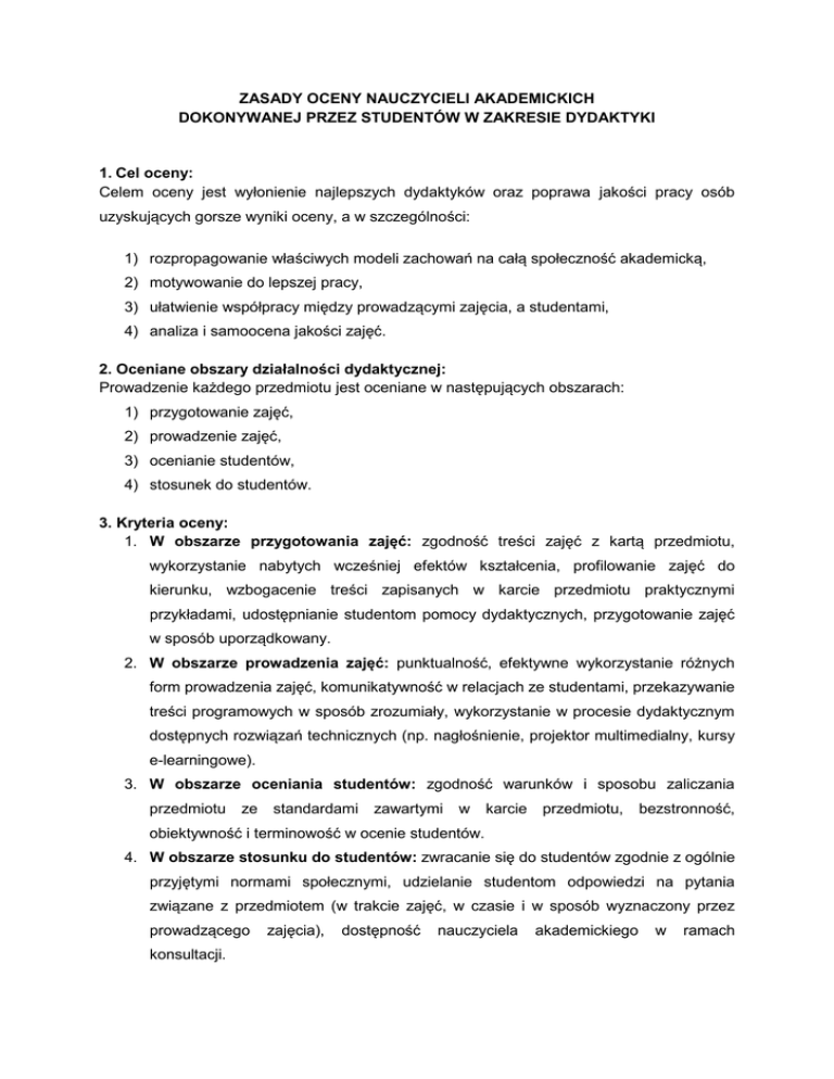 ZASADY OCENY NAUCZYCIELI AKADEMICKICH DOKONYWANEJ PRZEZ STUDENTÓW W ZAKRESIE DYDAKTYKI 1. Cel oceny: Celem oceny jest wyłonienie najlepszych dydaktyków oraz poprawa jakości pracy osób uzyskujących gorsze wyniki oceny, a w szczególności: 1) rozpropagowanie właściwych modeli zachowań na całą społeczność akademicką, 2) motywowanie do lepszej pracy, 3) ułatwienie współpracy między prowadzącymi zajęcia, a studentami, 4) analiza i samoocena jakości zajęć. 2. Oceniane obszary działalności dydaktycznej: Prowadzenie każdego przedmiotu jest oceniane w następujących obszarach: 1) przygotowanie zajęć, 2) prowadzenie zajęć, 3) ocenianie studentów, 4) stosunek do studentów. 3. Kryteria oceny: 1. W obszarze przygotowania zajęć: zgodność treści zajęć z kartą przedmiotu, wykorzystanie nabytych wcześniej efektów kształcenia, profilowanie zajęć do kierunku, wzbogacenie treści zapisanych w karcie przedmiotu praktycznymi przykładami, udostępnianie studentom pomocy dydaktycznych, przygotowanie zajęć w sposób uporządkowany. 2. W obszarze prowadzenia zajęć: punktualność, efektywne wykorzystanie różnych form prowadzenia zajęć, komunikatywność w relacjach ze studentami, przekazywanie treści programowych w sposób zrozumiały, wykorzystanie w procesie dydaktycznym dostępnych rozwiązań technicznych (np. nagłośnienie, projektor multimedialny, kursy e-learningowe). 3. W obszarze oceniania studentów: zgodność warunków i sposobu zaliczania przedmiotu ze standardami zawartymi w karcie przedmiotu, bezstronność, obiektywność i terminowość w ocenie studentów. 4. W obszarze stosunku do studentów: zwracanie się do studentów zgodnie z ogólnie przyjętymi normami społecznymi, udzielanie studentom odpowiedzi na pytania związane z przedmiotem (w trakcie zajęć, w czasie i w sposób wyznaczony przez prowadzącego konsultacji. zajęcia), dostępność nauczyciela akademickiego w ramach 4. Skala ocen i tryb oceniania: Każdy obszar działalności dydaktycznej jest oceniany w skali czterostopniowej: 5 – ocena bardzo dobra; oznacza spełnienie wszystkich kryteriów, a przynajmniej w jednym przypadku w sposób wyróżniający; wymagane uzasadnienie, 4 – ocena dobra; oznacza spełnienie wszystkich kryteriów, bez popełniania istotnych błędów, ale i bez działań zasługujących na szczególnie wysoką ocenę, 3 – ocena dostateczna; oznacza akceptowalne wypełnianie obowiązków dydaktycznych, ale w sposób niestaranny lub z licznymi błędami, 2 – ocena negatywna; oznacza brak spełnienia kryterium w ocenianym obszarze; ocena ta wymaga uzasadnienia. 5. Interpretacja wyników: 1. Każdemu prowadzącemu zajęcia przypisuje się w danym semestrze ocenę końcową, która jest średnią arytmetyczną ze wszystkich uzyskanych ocen w poszczególnych obszarach pod warunkiem, że został oceniony łącznie przez co najmniej 25 studentów. 2. Dopuszcza się przypisanie oceny końcowej przy liczbie wypełnionych formularzy mniejszej od 25, pod warunkiem, że prowadzący zajęcia został oceniony łącznie przez co najmniej 15 % uprawnionych do jego oceny studentów i nie mniej niż 6 studentów. 3. W przypadku, gdy liczba wypełnionych formularzy spełnia warunki przypisania danemu prowadzącemu zajęcia oceny końcowej i otrzymał on w ramach jednej ankiety oceny negatywne co najmniej w 5 formularzach, należy przeanalizować zasadność i przyczyny tych ocen oraz podjąć stosowne działania. O ich formie decyduje bezpośredni przełożony prowadzącego zajęcia w porozumieniu z Pełnomocnikiem Dziekana ds. Jakości Kształcenia i dziekanem. 6. Prawa i obowiązki studenta: 1. System informatyczny zapewnia anonimowość osób dokonujących oceny. 2. Student ma prawo oceny nauczycieli akademickich w ramach wszystkich przewidzianych dla niego zajęć. 3. Student powinien dokonać oceny nauczyciela akademickiego w sposób rzetelny i uczciwy. 4. Student ma prawo zgłosić brak dostępności lub błędy w ankiecie do Pełnomocnika Dziekana ds. Jakości Kształcenia. 5. Przewodniczący Parlamentu Samorządu Studenckiego Politechniki Krakowskiej ma prawo dostępu do danych dotyczących frekwencji wypełnienia ankiet i danych statystycznych.