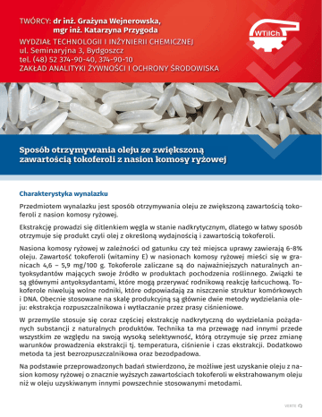 TWÓRCY:dr inż. Grażyna Wejnerowska, mgr inż. Katarzyna Przygoda WYDZIAŁ TECHNOLOGII I INŻYNIERII CHEMICZNEJ ul. Seminaryjna 3, Bydgoszcz tel. (48) 52 374-90-40, 374-90-10 ZAKŁAD ANALITYKI ŻYWNOŚCI I OCHRONY ŚRODOWISKA Sposób otrzymywania oleju ze zwiększoną zawartością tokoferoli z nasion komosy ryżowej Charakterystyka wynalazku Przedmiotem wynalazku jest sposób otrzymywania oleju ze zwiększoną zawartością tokoferoli z nasion komosy ryżowej. Ekstrakcję prowadzi się ditlenkiem węgla w stanie nadkrytycznym, dlatego w łatwy sposób otrzymuje się produkt czyli olej z określoną wydajnością i zawartością tokoferoli. Nasiona komosy ryżowej w zależności od gatunku czy też miejsca uprawy zawierają 6-8% oleju. Zawartość tokoferoli (witaminy E) w nasionach komosy ryżowej mieści się w granicach 4,6 – 5,9 mg/100 g. Tokoferole zaliczane są do najważniejszych naturalnych antyoksydantów mających swoje źródło w produktach pochodzenia roślinnego. Związki te są głównymi antyoksydantami, które mogą przerywać rodnikową reakcję łańcuchową. Tokoferole niwelują wolne rodniki, które odpowiadają za niszczenie struktur komórkowych i DNA. Obecnie stosowane na skalę produkcyjną są głównie dwie metody wydzielania oleju: ekstrakcja rozpuszczalnikowa i wytłaczanie przez prasy ciśnieniowe. W przemyśle stosuje się coraz częściej ekstrakcję nadkrytyczną do wydzielania pożądanych substancji z naturalnych produktów. Technika ta ma przewagę nad innymi przede wszystkim ze względu na swoją wysoką selektywność, którą otrzymuje się przez zmianę warunków prowadzenia ekstrakcji tj. temperatura, ciśnienie i czas ekstrakcji. Dodatkowo metoda ta jest bezrozpuszczalnikowa oraz bezodpadowa. Na podstawie przeprowadzonych badań stwierdzono, że możliwe jest uzyskanie oleju z nasion komosy ryżowej o znacznie wyższych zawartościach tokoferoli w ekstrahowanym oleju niż w oleju uzyskiwanym innymi powszechnie stosowanymi metodami. VERTE Projekt Współfinansowany ze środków Unii Europejskiej w ramach Europejskiego Funduszu Rozwoju Regionalnego Sposób otrzymywania oleju ze zwiększoną zawartością tokoferoli z nasion komosy ryżowej KONTYNUACJA ZE STRONY 1. Przedstawiony sposób polega na przygotowaniu nasion do ekstrakcji poprzez zmielenie ziaren, a następnie wymieszanie ich z wypełnieniem w postaci korzystnie oczyszczonego piasku. Dodatek wypełnienia powoduje około 30% zwiększenie ilości otrzymanego ekstraktu. Kolejno przez powstałą mieszaninę przepuszcza się ditlenek węgla w stanie nadkrytycznym. W zależności od parametrów procesu, czasu prowadzenia ekstrakcji i ciśnienia, otrzymano pożądaną zawartość tokoferoli w oleju. Przez zmielone do frakcji o średnicy 1,0÷1,4 mm (68%), nasiona komosy ryżowej o wilgotności 9,8%, które uprzednio wymieszano z wypełnieniem o średnicy 0,2÷0,3 mm w stosunku 1:0,5-0,8, przepuszczano w czasie 50-180 min, w sposób ciągły ditlenek węgla w stanie nadkrytycznym o natężeniu 14÷15 l/h przy czym ekstrakcję prowadzono w temperaturze 120÷1300°C pod ciśnieniem 18-20 MPa. Sposób według wynalazku umożliwia poprzez zmianę ciśnienia, temperatury i czasu ekstrakcji, otrzymanie produktu pochodzenia naturalnego o bardzo istotnym zastosowaniu z pożądaną wydajnością i zawartością tokoferoli oraz bez obecności w nim rozpuszczalników organicznych. Zastosowanie w praktyce Właściwości tokoferoli wpływają na spowolnienie procesów starzenia, zmniejszenie ryzyka rozwoju chorób sercowo-naczyniowych oraz lepszą pracę układu odpornościowego człowieka. W związku z tym, poszukuje się nowych, naturalnych źródeł tokoferoli, które zaspokoją potrzeby przemysłu spożywczego, kosmetycznego oraz farmaceutycznego. ul. Ks. A. Kordeckiego 20, 85-789 Bydgoszcz | wspolpraca.utp.edu.pl Bezpłatny materiał informacyjny