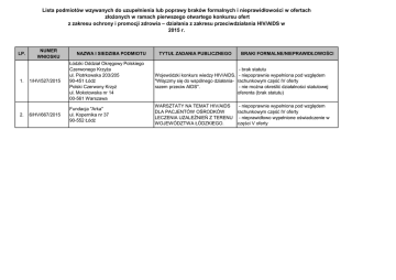 Lista podmiotów wzywanych do uzupełnienia lub poprawy braków formalnych i nieprawidłowości w ofertach złożonych w ramach pierwszego otwartego konkursu ofert z zakresu ochrony i promocji zdrowia – działania z zakresu przeciwdziałania HIV/AIDS w 2015 r. LP. 1. 2. NUMER WNIOSKU NAZWA I SIEDZIBA PODMIOTU TYTUŁ ZADANIA PUBLICZNEGO BRAKI FORMALNE/NIEPRAWIDŁOWOŚCI 1/HV/527/2015 Łódzki Oddział Okręgowy Polskiego Czerwonego Krzyża ul. Piotrkowska 203/205 90-451 Łódź Polski Czerwony Krzyż ul. Mokotowska nr 14 00-561 Warszawa - brak statutu Wojewódzki konkurs wiedzy HIV/AIDS. - niepoprawnie wypełniona pod względem "Włączmy się do wspólnego działania- rachunkowym część IV oferty razem przeciw AIDS". - nie można określić działalności statutowej oferenta (brak statutu) 6/HV/667/2015 Fundacja "Arka" ul. Kopernika nr 37 90-552 Łódź WARSZTATY NA TEMAT HIV/AIDS DLA PACJENTÓW OŚRODKÓW LECZENIA UZALEŻNIEŃ Z TERENU WOJEWÓDZTWA ŁÓDZKIEGO. - niepoprawnie wypełniona pod względem rachunkowym część IV oferty - nieprawidłowo wypełnione oświadczenie w części V oferty