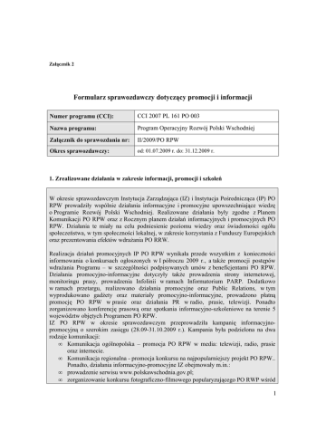 Załącznik 2 Formularz sprawozdawczy dotyczący promocji i informacji Numer programu (CCI): CCI 2007 PL 161 PO 003 Nazwa programu: Program Operacyjny Rozwój Polski Wschodniej Załącznik do sprawozdania nr: II/2009/PO RPW Okres sprawozdawczy: od: 01.07.2009 r. do: 31.12.2009 r. 1. Zrealizowane działania w zakresie informacji, promocji i szkoleń W okresie sprawozdawczym Instytucja Zarządzająca (IZ) i Instytucja Pośrednicząca (IP) PO RPW prowadziły wspólnie działania informacyjne i promocyjne upowszechniające wiedzę o Programie Rozwój Polski Wschodniej. Realizowane działania były zgodne z Planem Komunikacji PO RPW oraz z Rocznym planem działań informacyjnych i promocyjnych PO RPW. Działania te miały na celu podniesienie poziomu wiedzy oraz świadomości ogółu społeczeństwa, w tym społeczności lokalnej, w zakresie korzystania z Funduszy Europejskich oraz prezentowania efektów wdraŜania PO RRW. Realizacja działań promocyjnych IP PO RPW wynikała przede wszystkim z konieczności informowania o konkursach ogłoszonych w I półroczu 2009 r., a takŜe promocji postępów wdraŜania Programu – w szczególności podpisywanych umów z beneficjentami PO RPW. Działania promocyjno-informacyjne dotyczyły takŜe prowadzenia strony internetowej, monitoringu prasy, prowadzenia Infolinii w ramach Informatorium PARP. Dodatkowo w ramach przetargu, realizowano działania promocyjne oraz Public Relations, w tym wyprodukowano gadŜety oraz materiały promocyjno-informacyjne, prowadzono płatną promocję PO RPW w prasie oraz działania PR w radio, prasie, telewizji. Ponadto zorganizowano konferencję prasową oraz spotkania informacyjno-szkoleniowe na terenie 5 województw objętych Programem PO RPW. IZ PO RPW w okresie sprawozdawczym przeprowadziła kampanię informacyjnopromocyjną o szerokim zasięgu (28.09-31.10.2009 r.). Kampania była podzielona na dwa rodzaje komunikacji: • Komunikacja ogólnopolska – promocja PO RPW w media: telewizji, radio, prasie oraz internecie. • Komunikacja regionalna - promocja konkursu na najpopularniejszy projekt PO RPW.. Ponadto, działania informacyjno-promocyjne IZ obejmowały m.in.: • prowadzenie serwisu www.polskawschodnia.gov.pl; • zorganizowanie konkursu fotograficzno-filmowego popularyzującego PO RWP wśród 1 • • • młodzieŜy pt.: Polska Wschodnia – tu zaczyna się Unia; zorganizowanie konkursu na najlepsze publikacje dziennikarskie popularyzującego PO RWP wśród dziennikarzy pt.: Nie przegap zmian na Wschodzie; dystrybucję materiałów informacyjnych dot. PO RPW, organizowanie szkoleń dla pracowników IZ i IP PO RPW; Wszystkie działania realizowane przez IP i IZ skierowane były do beneficjentów i potencjalnych beneficjentów Programu: szkolenia i spotkania dla beneficjentów, aktualizacja stron www dot. PO RPW, prowadzenie informatorium i Infolinii PARP, artykuły prasowe, audycje radiowe i telewizyjne, konkursy. Tabela 1. Zrealizowane działania Lp. 1. 2. Nazwa działania Opis działania Informacja W ramach działalności Infolinii PARP prowadzonej Informatorium działające przy PARP w ramach Informatorium w okresie od 1 lipca do 31 grudnia 2009 r. odnotowano 159 konsultacji, w tym w Warszawie 143 zapytania telefoniczne oraz 16 zapytań emailowych dot. programu PO RPW. Największym zainteresowaniem cieszyło się działanie I.3 PO RPW oraz działanie I.4. Dynamika liczby konsultacji oraz ich zakres i tematyka były skorelowane z harmonogramem ogłaszanych konkursów w ramach programu. Ponadto beneficjenci kontaktowali się w celu wyjaśnienia szczegółowych zagadnień związanych z danym działaniem, które polegały na przedłoŜeniu aktów prawnych dotyczących przeprowadzenia konkursu, jak teŜ samych Wytycznych w zakresie kwalifikowania wydatków w ramach PO RPW 2007- 2013. Sieć Punktów Zgodnie z załoŜeniami Rocznego Planu Działań Informacyjnych i Promocyjnych na 2009 r., Konsultacyjnych zaplanowano powiększenie sieci 98 Punktów w całej Polsce Konsultacyjnych i wyłonienie kolejnych 22 Punktów, aby sieć PK do końca bieŜącego roku, liczyła 120. W II półroczu 2009 r. IP PO RPW dokonała zmian w zakresie finansowania Punktów Konsultacyjnych, zrezygnowała z wyboru pozostałych 9 Punktów Konsultacyjnych. Obecnie Punkty Konsultacyjne prowadzone przez podmioty zarejestrowane w Krajowym Systemie Usług dla Małych i Średnich Przedsiębiorstw tworzą ogólnopolską sieć liczącą 111 PK, świadczących 2 bezpłatne usługi informacyjne dla przedsiębiorców oraz osób zamierzających rozpocząć działalność gospodarczą z zakresu szeroko rozumianego rozwoju przedsiębiorczości oraz dostępnych form wsparcia dla przedsiębiorców, w tym w zakresie PO RPW. Sieć 111 Punktów Konsultacyjnych zostanie utrzymana do końca 2011 roku i nie będzie poszerzana. W okresie sprawozdawczym IZ PO RPW współpracowała z centralnym punktem informacyjnym MRR m.in. dostarczając materiały informacyjno-promocyjnych o PO RPW. Promocja 3 Centralny punkt informacyjny MRR 4. Ogólnopolska W okresie sprawozdawczym została i regionalna kampania przeprowadzona kampania medialna promująca promocyjna PO RPW Programu Operacyjny Rozwój Polski Wschodniej (28 września – 30 października). Kampania była podzielona na dwa rodzaje komunikacji: I. Komunikacja ogólnopolska – promocja PO RPW (media: telewizja ogólnopolska, regionalna, stacje telewizyjne – TVP, TVP 3, Polsat, TVN, TVN 7, TVN 24, TV 4, Discovery, At media. Radio ogólnopolskie - m. in RMF FM, Pakiet Akademicki. Lokalne PR, ESKA. Prasa ogólnopolska - 15 emisji w dziennikach lokalnych, 2 emisje w dzienniku ogólnopolskim (Gazeta Wyborcza) oraz 1 emisja w 4 tygodnikach (Newsweek, Polityka, Wprost, Przekrój) i w 1 tygodniku z programem telewizyjnym oraz w Internecie – banery zostały umieszczone na stronach internetowych; Onet.pl, Interia.pl, O2.pl, Wp.pl, nasza-klasa II. Komunikacja regionalna - promocja konkursu na najpopularniejszy projek
