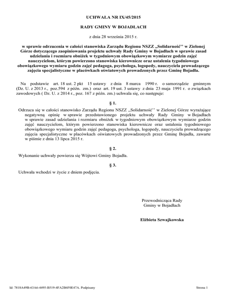 UCHWAŁA NR IX/45/2015 RADY GMINY W BOJADŁACH z dnia 28 września 2015 r. w sprawie odrzucenia w całości stanowiska Zarządu Regionu NSZZ ,,Solidarność’’ w Zielonej Górze dotyczącego zaopiniowania projektu uchwały Rady Gminy w Bojadłach w sprawie zasad udzielania i rozmiaru obniżek w tygodniowym obowiązkowym wymiarze godzin zajęć nauczycielom, którym powierzono stanowiska kierownicze oraz ustalenia tygodniowego obowiązkowego wymiaru godzin zajęć pedagoga, psychologa, logopedy, nauczyciela prowadzącego zajęcia specjalistyczne w placówkach oświatowych prowadzonych przez Gminę Bojadła. Na podstawie art. 18 ust. 2 pkt 15 ustawy z dnia 8 marca 1990 r. o samorządzie gminnym (Dz. U. z 2013 r., poz.594 z późn. zm.) oraz art. 19 ust. 3 ustawy z dnia 23 maja 1991 r. o związkach zawodowych ( Dz. U. z 2014 r., poz. 167 z późn. zm.) uchwala się, co następuje: § 1. Odrzuca się w całości stanowisko Zarządu Regionu NSZZ ,,Solidarność’’ w Zielonej Górze wyrażające negatywną opinię w sprawie przedstawionego projektu uchwały Rady Gminy w Bojadłach w sprawie zasad udzielania i rozmiaru obniżek w tygodniowym obowiązkowym wymiarze godzin zajęć nauczycielom, którym powierzono stanowiska kierownicze oraz ustalenia tygodniowego obowiązkowego wymiaru godzin zajęć pedagoga, psychologa, logopedy, nauczyciela prowadzącego zajęcia specjalistyczne w placówkach oświatowych prowadzonych przez Gminę Bojadła, zawarte w piśmie z dnia 13 lipca 2015 r. § 2. Wykonanie uchwały powierza się Wójtowi Gminy Bojadła. § 3. Uchwała wchodzi w życie z dniem podjęcia. Przewodnicząca Rady Gminy w Bojadłach Elżbieta Szwajkowska Id: 7818A49B-63A6-4495-B519-4FA2B6F0E47A. Podpisany Strona 1 Uzasadnienie W przypadku negatywnej opinii związku zawodowego na temat projektu uchwały Rady Gminy, zgodnie z art. 19. ust. 3 ustawy o związkach zawodowych, Rada Gminy musi ustosunkować się do ww. opinii. Przytoczony przepis stanowi, iż ,,w razie odrzucenia w całości lub w części stanowiska związku, właściwy organ administracji rządowej lub samorządu terytorialnego informuje o tym związek na piśmie, podając uzasadnienie swojego stanowiska. W razie rozbieżności stanowisk związek może przedstawić swoją opinię na posiedzeniu właściwej komisji sejmowej, senackiej lub samorządu terytorialnego’’. Zarząd Regionu NSZZ ,,Solidarność’’ w Zielonej Górze wydał w dniu 13 lipca 2015 r. negatywną opinię na temat uchwały w sprawie zasad udzielania i rozmiaru obniżek w tygodniowym obowiązkowym wymiarze godzin zajęć nauczycielom, którym powierzono stanowiska kierownicze oraz ustalenia tygodniowego obowiązkowego wymiaru godzin zajęć pedagoga, psychologa, logopedy, nauczyciela prowadzącego zajęcia specjalistyczne w placówkach oświatowych prowadzonych przez Gminę Bojadła, zarzucając brak wiedzy o pracy nauczyciela i lekceważeniu prawa oświatowego. Dotychczasowa wysokość pensum była niewspółmierna do potrzeb dydaktycznych uczniów w Gminie Bojadła i zwiększenie pensum było podyktowane koniecznością zapewnienia większej dostępności zajęć specjalistycznych w placówkach oświatowych prowadzonych przez Gminę. Pensum jest jedynie określoną liczbą obowiązkowych zajęć dydaktycznych i wychowawczych, wymaganych przez organ prowadzący. Przy 30- godzinnym pensum nauczyciel prowadzący zajęcia specjalistyczne, logopeda czy pedagog przy 25 i 28 godzinach zajęć dydaktycznych nie przekracza 40-godzinnego tygodnia pracy. Pozostałe 10 godzin zagospodarowuje sobie bowiem na czynności przygotowawcze i inne czynności związane z pracą według własnych potrzeb i możliwości. Decyzja Gminy Bojadła jest zgodna z prawem. To samorząd ma wyłączne prawo decydowania o wysokości pensum specjalistów. - „Ustawodawca wyposażył organ prowadzący w kompetencję do określania pensum m.in. nauczycieli pedagogów, logopedów, psychologów i doradców zawodowych, gdyż organ kierując się potrzebami środowiska lokalnego może kształtować tygodniowy obowiązkowy wymiar godzin zajęć nauczycieli realizujących zajęcia w ramach pomocy psychologiczno-pedagogicznej zgodnie z rzeczywistymi potrzebami dzieci i młodzieży uczących się na terenie jednostki samorządu terytorialnego” – stwierdza Przemysław Krzyżanowski, podsekretarz Ministerstwa Edukacji Narodowej w odpowiedzi na interpelację dotyczącą rzekomo zbyt wysokiego pensum wyznaczanego obecnie przez samorządy lokalne. Potwierdza to wyrok Sądu Najwyższego, który zapadł 25 stycznia 2007 r. (sygn. I PK 195/06) stwierdzający, iż gmina może swobodnie regulować wysokość pensum pedagogów i innych specjalistów, w zależności od lokalnego zapotrzebowania na tego typu zajęcia specjalistyczne. Wszelkie wątpliwości w tej sprawie rozwiewa uchwała Sądu Najwyższego z 21 marca 2012 r. (III PZP 2/12) w składzie 7 sędziów, potwierdzająca prawo samorządu lokalnego do swobodnego regulowania pensum nauczycieli specjalistów. ,,Wątpliwości związane z dopuszczalnością regulowania czasu pracy nauczycieli przez radę gminy nie mają podstaw. Uchwała rady gminy nie jest aktem wykonawczym do ustawy w rozumieniu art. 92 ust. 1 Konstytucji. Organ samorządu terytorialnego ma odrębne umocowanie w art. 94 Konstytucji do ustanawiania prawa miejscowego na podstawie i w granicach upoważnienia zawartego w ustawie (tu: art. 42 ust. 7 pkt 3 KN)’’ – czytamy w uchwale. Uchwała stwierdza również, iż Karta Nauczyciela określa rozpiętość pensum nauczycieli od 15 do 30 godzin, w zależności od realizowanych przez nich zadań. Pensum wyznaczone przez Gminę mieści się więc w rozpiętości innych specjalności nauczycielskich, regulowanych przez Kartę Nauczyciela. Reasumując, decyzja Rady Gminy jest zgodna z prawem i zasadna merytorycznie. Stąd decyzja o odrzuceniu w całości stanowiska Zarządu Regionu NSZZ ,,Solidarność’’ w Zielonej Górze. Id: 781