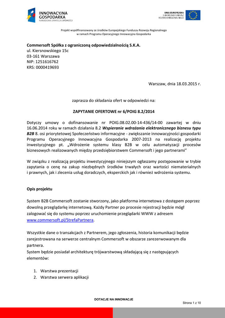 Projekt współfinansowany ze środków Europejskiego Funduszu Rozwoju Regionalnego w ramach Programu Operacyjnego Innowacyjna Gospodarka Commersoft Spółka z ograniczoną odpowiedzialnością S.K.A. ul. Kiersnowskiego 15c 03-161 Warszawa NIP: 1251616762 KRS: 0000419693 Warszaw, dnia 18.03.2015 r. zaprasza do składania ofert w odpowiedzi na: ZAPYTANIE OFERTOWE nr 6/POIG 8.2/2014 Dotyczy umowy o dofinansowanie nr POIG.08.02.00-14-436/14-00 zawartej w dniu 16.06.2014 roku w ramach działania 8.2 Wspieranie wdrażania elektronicznego biznesu typu B2B 8. osi priorytetowej Społeczeństwo informacyjne - zwiększanie innowacyjności gospodarki Programu Operacyjnego Innowacyjna Gospodarka 2007-2013 na realizację projektu inwestycyjnego pt. „Wdrożenie systemu klasy B2B w celu automatyzacji procesów biznesowych realizowanych między przedsiębiorstwem Commersoft i jego partnerami” W związku z realizacją projektu inwestycyjnego niniejszym ogłaszamy postępowanie w trybie zapytania o cenę na zakup niezbędnych środków trwałych oraz wartości niematerialnych i prawnych, jak i zlecenia usług doradczych, eksperckich jak i również wdrożenia systemu. Opis projektu System B2B Commersoft zostanie stworzony, jako platforma internetowa z dostępem poprzez dowolną przeglądarkę internetową. Każdy Partner po procesie rejestracji będzie mógł zalogować się do systemu poprzez uruchomienie przeglądarki WWW z adresem www.commersoft.pl/StrefaPartnera. Wszystkie dane o transakcjach z Partnerem, jego zgłoszenia, historia komunikacji będzie zarejestrowana na serwerze centralnym Commersoft w obszarze zarezerwowanym dla partnera. System będzie posiadał architekturę trójwarstwową składającą się z następujących elementów: 1. Warstwa prezentacji 2. Warstwa serwera aplikacji DOTACJE NA INNOWACJE Strona 1 z 10 Projekt współfinansowany ze środków Europejskiego Funduszu Rozwoju Regionalnego w ramach Programu Operacyjnego Innowacyjna Gospodarka 3. Warstwa Bazy danych Taka architektura pozwala na bezpieczny dostęp do danych. Użytkownik korzystający z przeglądarki WWW komunikuje się zawsze tylko z serwerem aplikacji i nigdy nie ma dostępu do bazy danych, więc zwiększamy w ten sposób bezpieczeństwo rozwiązania. Warstwa wizualna prezentowana na stacji roboczej tworzona będzie w oparciu o platformę Silverlight 5.0 oraz HTML 5 wbudowaną w przeglądarkę internetową. Użytkownicy będą łączyć się z serwerem aplikacji korzystając z przeglądarki WWW. Połączenie będzie nawiązywane z wykorzystaniem protokołu HTTPS opartego o szyfrowanie SSL. Serwer aplikacyjny współpracuję z serwerem bazodanowym, który: a) Służy do autentyfikacji użytkowników, korzysta z usługi Active Directory. b) Wysyła powiadomienia mailowe korzystając z serwera pocztowego komunikując się z nim poprzez protokół SMTP, c) Wymienia informacje z serwerem ERP korzystając z Web Service i protokołu SOAP. Architektura Platformy B2B będzie charakteryzować się następującymi cechami: Nowoczesny system – do stworzenia platformy będą zastosowane najnowocześniejsze technologie internetowe Silverlight wersji 5.0 i HTML 5, serwer aplikacji zbudowany w oparciu o platformę .Net połączony ze skalowalną i bardzo wydajną platformą bazodanową MS SQL Server 2012, Bezpieczeństwo – zastosowanie trójwarstwowej technologii budowy systemu z dostępem klienta szyfrowanym poprzez protokół SSL, która zapewnia bezpieczeństwo dostępu do danych. Otwartość – zastosowana architektura platformy będzie pozwala łatwo rozbudować system o wymaganą w przyszłości nową funkcjonalność. Dostępność – komponenty systemu skonstruowane są w technologiach dających możliwość samodzielnego rozwoju aplikacji. Poniższy rysunek przedstawia oczekiwaną architekturę platformy B2B: DOTACJE NA INNOWACJE Strona 2 z 10 Projekt współfinansowany ze środków Europejskiego Funduszu Rozwoju Regionalnego w ramach Programu Operacyjnego Innowacyjna Gospodarka Po zalogowaniu się na stronie WWW partner będzie miał do dyspozycji wszystkie funkcjonalności przewidziane w opisie projektu – materiały marketingowe, panel zakupu, panel przeglądu dokumentów itp. Portal B2B będzie zawierał możliwość integracji z systemami ERP partnerów poprzez wymianę informacji o transakcjach przeprowadzonych w portalu B2B. Platforma B2B składać się będzie z 10 modułów: I. Moduł rejestracji partnera, II. Moduł zakupów, III. Moduł panel partnera - przeglądarka dokumentów partnera, IV. Moduł Helpdesk, V. Moduł Newsletter, VI. Moduł System zarządzania zmianą, VII. Moduł Generator obiektów biznesowych, VIII. Moduł Generator ekranów, Generator raportów, IX. Moduł Forum dyskusyjne - baza wiedzy, X. Moduł Szablony rozwiązań wraz z dokumentacją. Moduły zostaną podzielone na 2 grupy z uwagi na realizowane funkcje – moduły handlowe i moduły deweloperskie. DOTACJE NA INNOWACJE Strona 3 z 10 Projekt współfinansowany ze środków Europejskiego Funduszu Rozwoju Regionalnego w ramach Programu Operacyjnego Innowacyjna Gospodarka 1. Przedmiot zapytania ofertowego: Przedmiotem zapytania jest wycena realizacji następujących zadań: Nabycie wartości niematerialnych i prawnych Przygotowanie i wdrożenie Platformy Developerskiej dla Programu Partnerskiego Commersoft na podstawie wykonanej analizy. Moduły: System zarządzania zmianą, Generator obiektów biznesowych, Generator ekranów, Generator raportów, Forum dyskusyjne - baza wiedzy, Szablony rozwiązań wraz z dokumentacją, Moduł pro środowiskowy – go GREEN. . 2. Opis przedmiotu zapytania ofertowego: Szczegółowa specyfikacja dotyczącą oczekiwanych funkcjonalności każdego z modułów funkcjonalnych udostępniana jest w siedzibie firmy oraz na zapytanie skierowane na wskazany adres do kontaktu w niniejszym ogłoszeniu. 3. Warunki dotyczące oferentów: Zamawiający nie dopuszcza składania ofert częściowych - rozpatrywane 
