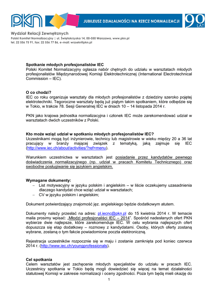 Wydział Relacji Zewnętrznych Polski Komitet Normalizacyjny | ul. Świętokrzyska 14, 00-050 Warszawa, www.pkn.pl tel. 22 556 75 91, fax: 22 556 77 86, e-mail: [email protected] Spotkanie młodych profesjonalistów IEC Polski Komitet Normalizacyjny ogłasza nabór chętnych do udziału w warsztatach młodych profesjonalistów Międzynarodowej Komisji Elektrotechnicznej (International Electrotechnical Commission – IEC). O co chodzi? IEC co roku organizuje warsztaty dla młodych profesjonalistów z dziedziny szeroko pojętej elektrotechniki. Tegoroczne warsztaty będą już piątym takim spotkaniem, które odbędzie się w Tokio, w trakcie 78. Sesji Generalnej IEC w dniach 10 – 14 listopada 2014 r. PKN jako krajowa jednostka normalizacyjna i członek IEC może zarekomendować udział w warsztatach dwóch uczestników z Polski. Kto może wziąć udział w spotkaniu młodych profesjonalistów IEC? Uczestnikami mogą być inżynierowie, technicy lub magistrowie w wieku między 20 a 36 lat pracujący w branży mającej związek z tematyką, jaką zajmuje się IEC (http://www.iec.ch/about/activities/?ref=menu). Warunkiem uczestnictwa w warsztatach jest posiadanie przez kandydatów pewnego doświadczenia normalizacyjnego (np. udział w pracach Komitetu Technicznego) oraz swobodne posługiwanie się językiem angielskim. Wymagane dokumenty: List motywacyjny w języku polskim i angielskim – w liście oczekujemy uzasadnienia dlaczego kandydat chce wziąć udział w warsztatach; CV w języku polskim i angielskim; Dokument potwierdzający znajomość jęz. angielskiego będzie dodatkowym atutem. Dokumenty należy przesłać na adres: [email protected] do 15 kwietnia 2014 r. W temacie maila prosimy wpisać: „Młodzi profesjonaliści IEC – 2014”. Spośród nadesłanych ofert PKN wybierze dwie najlepsze, które zarekomenduje IEC. W celu wybrania najlepszych ofert dopuszcza się etap dodatkowy – rozmowy z kandydatami. Osoby, których oferty zostaną wybrane, zostaną o tym fakcie powiadomione poczta elektroniczną. Rejestracja uczestników rozpocznie się w maju i zostanie zamknięta pod koniec czerwca 2014 r. (http://www.iec.ch/youngprofessionals). Cel spotkania Celem warsztatów jest zachęcenie młodych specjalistów do udziału w pracach IEC. Uczestnicy spotkania w Tokio będą mogli dowiedzieć się więcej na temat działalności statutowej Komisji w zakresie normalizacji i oceny zgodności. Poza tym będą mieli okazję do 1 nawiązania nowych interesujących kontaktów zawodowych – w trakcie warsztatów poznają m.in. managerów IEC, którzy odpowiadają za prowadzenie prac normalizacyjnych i funkcjonowanie oceny zgodności. W ubiegłorocznym spotkaniu młodych profesjonalistów IEC w New Delhi w Indiach wzięło udział 55 uczestników z 30 krajów świata. Informacje dodatkowe PKN nie pokrywa kosztów związanych z wyjazdem do Tokio. Koszty zakwaterowania (do 3 dni) pokrywa za zgłoszonych uczestników IEC. Zachęcamy do przesyłania ofert. Jeśli: jesteś menadżerem, inżynierem lub technikiem w wieku pomiędzy 20 a 36 lat, posiadasz doświadczenie w opracowywaniu norm lub w pracy z normami, pracujesz dla firmy lub branży, która wykorzystuje normy w swojej działalności lub sama bierze czynny udział w pracach IEC, chciałbyś bardziej zaangażować się we współpracę z IEC, Zgłoś się! Prześlij wymagane dokumenty na adres [email protected] do 15 kwietnia 2014 r. 2