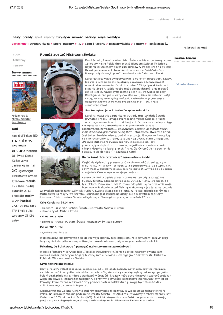 27.11.2013 Pomóż zostać Mistrzem Świata - Sport i raporty - bikeBoard - magazyn rowerowy o nas reklama testy porady sport i raporty turystyka nowości katalog waga kolektyw kontakt szukaj Jesteś tutaj: Strona Główna > Sport i Raporty > PL > Sport i Raporty > Baza artykułów > Tematy > Pomóż zostać... rejestruj zaloguj Sport Pomóż zostać Mistrzem Świata Felietony Karol Serwin, 2-krotny Wicemistrz Świata w trialu rowerowym oraz 11-krotny Mistrz Polski chce zostać Mistrzem Świata! To jeden z najbardziej utalentowanych zawodników w Polsce oraz na świecie. By osiągnąć swój cel zbiera środki w serwisie PolakPotrafi.pl. Przyłącz się do akcji i pomóż Karolowi zostać Mistrzem Świat. Tematy Nowy numer Karol jest niezwykle sympatycznym i skromnym chłopakiem. Każdy, kto miał z nim przez chwilę okazję porozmawiać, natychmiast odnosi takie wrażenie. Karol chce zebrać 22 tysiące złotych do 4 stycznia 2014 r. Każda osoba może się przyłączyć i przeznaczyć coś od siebie, nawet symboliczną złotówkę. Wszystko się liczy. Karol gra va banque – wszystko albo nic. „Jeżeli nie uzbieram całej kwoty, to wszystkie wpłaty wrócą do nadawców, więc jest to gra wszystko albo nic, a dla mnie być albo nie być” – stwierdza stanowczo Karol. zostań fanem Idź do Facebook.com Smutna sytuacja w Polskim Związku Kolarskim enduro triathlon Karol na wszystkie zagraniczne wyjazdy musi wykładać swoje prywatne środki. Pomaga mu rodzinne miasto Świdnik a także otrzymuje wsparcie od ludzi dobrej woli. Jednak to w dalszym ciągu nie wystarcza na uczestnictwo w zagranicznych, bardzo kosztownych, zawodach. „Polski Związek Kolarski, do którego należy moja dyscyplina, przeznacza na nią 0 zł” – stanowczo stwierdza Karol. Jest to tym bardziej niewyobrażalna sytuacja, iż ogromne kwoty idą na inne dyscypliny kolarskie, te jednak są dyscyplinami olimpijskimi. „Polityka (NIE)finansowania sportów nieolimpijskich jest przerażająca, daje do zrozumienia, że jeśli nie uprawiasz sportu olimpijskiego to najlepiej przestań w ogóle ćwiczyć. Ja na pewno nie dostosuję się do tego!” – zaznacza Karol. DT Swiss Kenda Na co Karol chce przeznaczyć zgromadzone środki /gdzie kupić/ /prenumerata/ /archiwum/ tagi nowości Token 650 maratony gwarancja Kellys Jamis Część pieniędzy chcę przeznaczyć na zimowy obóz treningowy w kraju, w którym w lutym temperatura będzie powyżej 15 stopni. Tak, abym mógł w skalistym terenie solidnie przygotowywać się do sezonu – wyjaśnia Karol w opisie swojego projektu. catlike Marin trial XC Lightweight Elite miasto wyścig tytanowe Merida Tubeless Ready Eurobike 2013 crocodile trophy SRAM hardtail 27,5" bc bike race Reszta pieniędzy będzie przeznaczona na zawody, szczególnie Puchary Świata, gdzie koszt jednego wyjazdu jest w granicach 4-5 tys. złotych. Pierwsza runda Pucharu odbędzie się na przełomie maja i czerwca w Krakowie przed Galerią Krakowską – już teraz serdecznie wszystkich zapraszamy. Cały cykl Pucharu Świata składa się z 5 rund. W Polsce odbędą się również Mistrzostwa Europy w Wałbrzychu. Termin nie jest jeszcze ustalony, ale o wszystkim będziemy informować. Mistrzostwa Świata odbędą się w Norwegii na początku września 2014 r. Cele Karola na 2014 rok: TRP Thule cube - pierwsza "szóstka" Pucharu Świata, Mistrzostw Świata i Europy - obrona tytułu Mistrza Polski wyprawy GT Dirt Cel na 2015 rok: Lefty - pierwsza "trójka" Pucharu Świata, Mistrzostw Świata i Europy Cel na 2016 rok: - tytuł Mistrza Świata Wspierając Karola przyczynisz się do rozwoju sportów nieolimpijskich. Pokażmy, że w naszym kraju liczy się nie tylko piłka nożna, w której naprawdę nie mamy się czym pochwalić od wielu lat. Pokażmy, że Polak potrafi pomagać utalentowanemu zawodnikowi! Więcej informacji w serwisie http://polakpotrafi.pl/projekt/pomoz-zostac-mistrzem-swiata Tam również można przeczytać bogatą historię Karola Serwina – od tego jak 10-latek został Mistrzem Polski do Wicemistrzostwa Świata. Czym jest PolakPotrafi.pl Serwis PolakPotrafi.pl to idealne miejsce nie tylko dla osób poszukujących pieniędzy na realizację swoich marzeń i pomysłów, ale także dla tych osób, które chcą stać się częścią ciekawego projektu. PolakPotrafi.pl nie ma zamiaru ograniczać twórczości i kreatywności osób chcących stworzyć projekt wręcz przeciwnie, im bardziej zakręcony, a przy tym oczywiście sensowny i interesujący, tym lepiej! Pomysły, które można realizować przy pomocy portalu PolakPotrafi.pl mogą być zatem bardzo zróżnicowane, co stanowi siłę portalu. Karol Serwin ma 23 lata. Uprawia trial rowerowy od 8 roku życia. W wieku 10 lat został Mistrzem Polski. Na swoim koncie ma podium Mistrzostw Świata – w 2003 roku wywalczył srebrny medal w kat. Cadet a w 2005 roku w kat. Junior (UCI). Jest 11-krotnym Mistrzem Polski. W pełni oddany swojej pasji dąży do osiągnięcia najwyższego celu – złoty medal Mistrzostw Świata w kat. elita. sport-raporty.bikeboard.pl/artykuly,pokaz,nl7kvy8g3t 1/2 27.11.2013 Pomóż zostać Mistrzem Świata - Sport i raporty - bikeBoard - magazyn rowerowy strona internetowa: http://www.serwinkarol.com/ facebook: https://www.facebook.com/KarolSerwinTRIAL POLAK POTRAFI 2013-11-26 | Źródło: www.serwinkarol.com Komentarze użytkowników Zaloguj się aby komentować Redakcja nie ponosi odpowiedzialności za treść komentarzy 0 BikeBoard, ul. Księcia Józefa 54a, 30-206 Kraków; © 2010 A ll Rights Reserved; projekt: Render, wykonanie: maszyna.pl sport-raporty.bikeboard.pl/artykuly,pokaz,nl7kvy8g3t 2/2