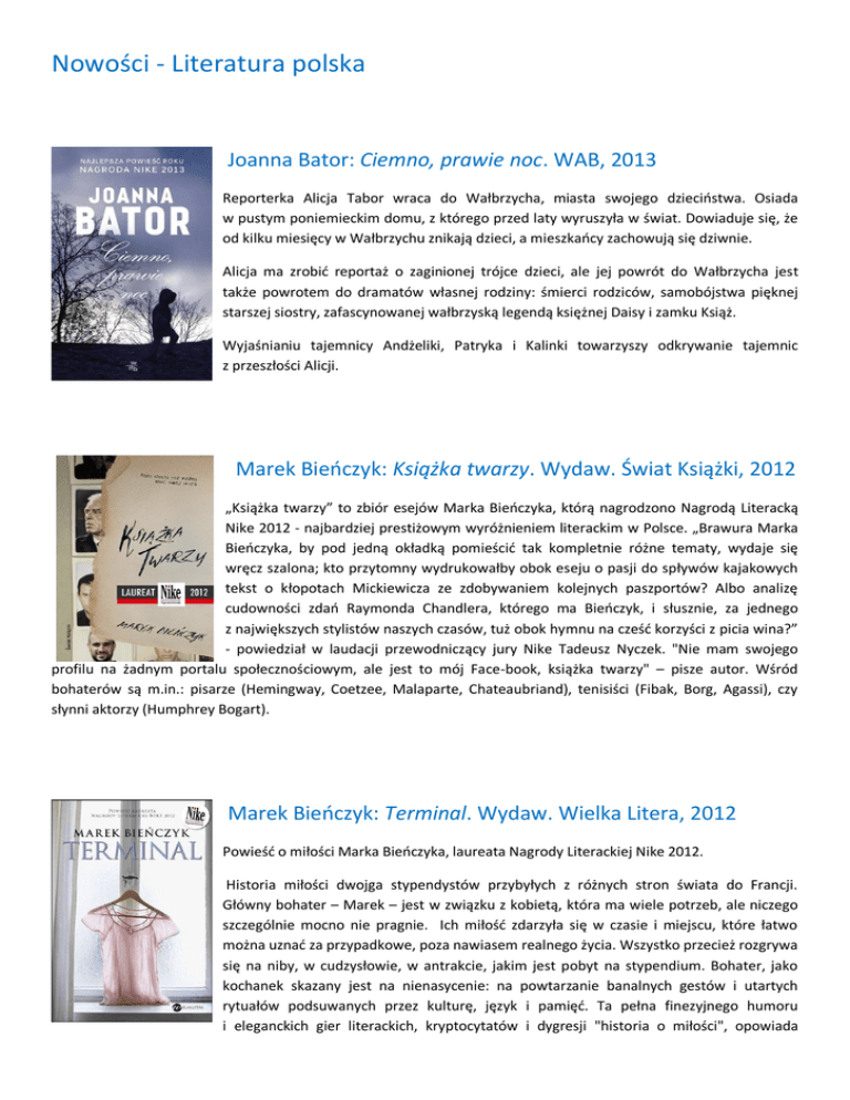 Nowości - Literatura polska Joanna Bator: Ciemno, prawie noc. WAB, 2013 Reporterka Alicja Tabor wraca do Wałbrzycha, miasta swojego dzieciństwa. Osiada w pustym poniemieckim domu, z którego przed laty wyruszyła w świat. Dowiaduje się, że od kilku miesięcy w Wałbrzychu znikają dzieci, a mieszkańcy zachowują się dziwnie. Alicja ma zrobić reportaż o zaginionej trójce dzieci, ale jej powrót do Wałbrzycha jest także powrotem do dramatów własnej rodziny: śmierci rodziców, samobójstwa pięknej starszej siostry, zafascynowanej wałbrzyską legendą księżnej Daisy i zamku Książ. Wyjaśnianiu tajemnicy Andżeliki, Patryka i Kalinki towarzyszy odkrywanie tajemnic z przeszłości Alicji. Marek Bieńczyk: Książka twarzy. Wydaw. Świat Książki, 2012 „Książka twarzy” to zbiór esejów Marka Bieńczyka, którą nagrodzono Nagrodą Literacką Nike 2012 - najbardziej prestiżowym wyróżnieniem literackim w Polsce. „Brawura Marka Bieńczyka, by pod jedną okładką pomieścić tak kompletnie różne tematy, wydaje się wręcz szalona; kto przytomny wydrukowałby obok eseju o pasji do spływów kajakowych tekst o kłopotach Mickiewicza ze zdobywaniem kolejnych paszportów? Albo analizę cudowności zdań Raymonda Chandlera, którego ma Bieńczyk, i słusznie, za jednego z największych stylistów naszych czasów, tuż obok hymnu na cześć korzyści z picia wina?” - powiedział w laudacji przewodniczący jury Nike Tadeusz Nyczek. "Nie mam swojego profilu na żadnym portalu społecznościowym, ale jest to mój Face-book, książka twarzy" – pisze autor. Wśród bohaterów są m.in.: pisarze (Hemingway, Coetzee, Malaparte, Chateaubriand), tenisiści (Fibak, Borg, Agassi), czy słynni aktorzy (Humphrey Bogart). Marek Bieńczyk: Terminal. Wydaw. Wielka Litera, 2012 Powieść o miłości Marka Bieńczyka, laureata Nagrody Literackiej Nike 2012. Historia miłości dwojga stypendystów przybyłych z różnych stron świata do Francji. Główny bohater – Marek – jest w związku z kobietą, która ma wiele potrzeb, ale niczego szczególnie mocno nie pragnie. Ich miłość zdarzyła się w czasie i miejscu, które łatwo można uznać za przypadkowe, poza nawiasem realnego życia. Wszystko przecież rozgrywa się na niby, w cudzysłowie, w antrakcie, jakim jest pobyt na stypendium. Bohater, jako kochanek skazany jest na nienasycenie: na powtarzanie banalnych gestów i utartych rytuałów podsuwanych przez kulturę, język i pamięć. Ta pełna finezyjnego humoru i eleganckich gier literackich, kryptocytatów i dygresji "historia o miłości", opowiada o doświadczeniu znanym każdemu z nas, o niespełnionym pragnieniu, o dotkliwym i jakże często doświadczanym uczuciu porzucenia zamykającym w czterech ścianach samotności. Ale nieuchronne i ostateczne rozstanie z kochanką bynajmniej nie prowadzi do „kamiennej rozpaczy”, lecz staje się impulsem do twórczego pisania. Marek Bieńczyk: Tworki. Wydaw. Wielka Litera, 2012 Najlepsza i najczęściej nagradzana powieść laureata Literackiej Nagrody Nike 2012. Akcja tej powieści rozgrywa się w roku 1943 w podwarszawskich Tworkach. Jej bohaterowie to grupka dwudziestolatków, dziewcząt i chłopców, Polaków i Żydów, którzy pracują w pozostającym pod niemieckim zarządem szpitalu psychiatrycznym. Okazuje się, że jedynym normalnym miejscem w nienormalnym świecie jest zakład dla obłąkanych. Znajdują tu azyl, dający nadzieję na w miarę spokojne i godne przetrwanie okupacji. W chwilach wolnych od zajęć młodzi bawią się, flirtują, spacerują po malowniczej okolicy, deklamują wiersze. Wydaje się, że piekło okupacji hitlerowskiej ich nie dotyczy. Ta beztroska nijak się ma do ponurych czasów, w których przyszło im żyć, a których grozę w pełni zdaje się początkowo odczuwać chyba tylko czytelnik Lecz ni stąd ni zowąd, po cichu i niezauważenie, znikają z kart powieści jej kolejni bohaterowie. Pozostają po nich tylko pożegnalne listy. Wilhelm Dichter: Lekcja angielskiego. Wydawnictwo Znak, 2010 Lekcja angielskiego to trzecia powieść Wilhelma Dichtera oparta na wspomnieniach autora. Dopełnia historię ukrywanego dziecka żydowskiego i młodzieńca dojrzewającego w epoce stalinowskiej opowieścią o emigracji po roku 1968. Dichter zdecydował się opisać traumatyczne przeżycia z dzieciństwa, jako człowiek już sześćdziesięcioletni. Koń Pana Boga okazał się nie tylko świadectwem strasznych czasów, lecz także wybitną, nowoczesną powieścią, nominowaną do Nagrody Nike i przetłumaczoną na wiele języków. Podobnie Lekcja angielskiego jest prozą dojrzałą i wyrafinowaną, skonstruowaną na podstawie przeżyć własnych i całego pokolenia polskich Żydów zmuszonych do opuszczenia ojczyzny. Dichter nie bez autoironii pokazuje trudy adaptacji do nowego życia w „lepszym” świecie. Ameryka – ta ziemia obiecana dla mieszkańców szarego Peerelu – dla przymusowego „szczęściarza” bardzo długo pozostaje zamkniętą i obcą krainą. W końcu jednak, przez wpływ języka i rodziny, bohater powieści zalicza „lekcję angielskiego”, trudny etap odkrywania swojej żydowskiej tożsamości i – buntowania się przeciwko niej. Witold Gombrowicz: Transatlantyk. Wydaw. Literackie, 2013 Trans-Atlantyk” został napisany przez Witolda Gombrowicza w 1953 roku. Książka ma charakter zmitologizowanych wspomnień z wczesnych lat emigracji. „Trzeba dodać dla porządku, choć to może niepotrzebne: „Trans-Atlantyk” jest fantazją. Wszystko – wymyślone w bardzo luźnym tylko związku z prawdziwą Argentyną i prawdziwą kolonią polską w Buenos Aires. Moja „dezercja” także inaczej przedstawia się w rzeczywistości (szperaczy odsyłam do mego dziennika)” (W. Gombrowicz) W 1939 roku pisarz wziął udział w inaugurującym rejsie „Chrobrego” z Gdyni do Buenos Aires. Po wybuchu wojny Gombrowicz został w Argentynie, gdzie w nędzy spędził dziesię
