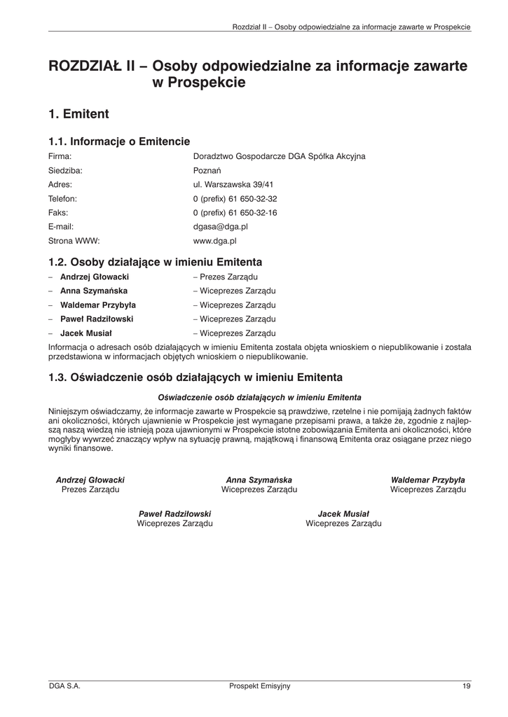 Rozdział II – Osoby odpowiedzialne za informacje zawarte w Prospekcie ROZDZIAŁ II – Osoby odpowiedzialne za informacje zawarte w Prospekcie 1. Emitent 1.1. Informacje o Emitencie Firma: Doradztwo Gospodarcze DGA Spółka Akcyjna Siedziba: Poznań Adres: ul. Warszawska 39/41 Telefon: 0 (prefix) 61 650-32-32 Faks: 0 (prefix) 61 650-32-16 E-mail: [email protected] Strona WWW: www.dga.pl 1.2. Osoby działające w imieniu Emitenta – Andrzej Głowacki – Prezes Zarządu – Anna Szymańska – Wiceprezes Zarządu – Waldemar Przybyła – Wiceprezes Zarządu – Paweł Radziłowski – Wiceprezes Zarządu – Jacek Musiał – Wiceprezes Zarządu Informacja o adresach osób działających w imieniu Emitenta została objęta wnioskiem o niepublikowanie i została przedstawiona w informacjach objętych wnioskiem o niepublikowanie. 1.3. Oświadczenie osób działających w imieniu Emitenta Oświadczenie osób działających w imieniu Emitenta Niniejszym oświadczamy, że informacje zawarte w Prospekcie są prawdziwe, rzetelne i nie pomijają żadnych faktów ani okoliczności, których ujawnienie w Prospekcie jest wymagane przepisami prawa, a także że, zgodnie z najlepszą naszą wiedzą nie istnieją poza ujawnionymi w Prospekcie istotne zobowiązania Emitenta ani okoliczności, które mogłyby wywrzeć znaczący wpływ na sytuację prawną, majątkową i finansową Emitenta oraz osiągane przez niego wyniki finansowe. Andrzej Głowacki Prezes Zarządu Anna Szymańska Wiceprezes Zarządu Paweł Radziłowski Wiceprezes Zarządu DGA S.A. Waldemar Przybyła Wiceprezes Zarządu Jacek Musiał Wiceprezes Zarządu Prospekt Emisyjny 19 Rozdział II – Osoby odpowiedzialne za informacje zawarte w Prospekcie 2. Podmiot dominujący Nazwisko: Głowacki Imię: Andrzej Telefon: 0 (prefix) 61 650-32-32 Faks: 0 (prefix) 61 650-32-16 E-mail: [email protected] Informacja o adresie podmiotu dominującego została objęta wnioskiem o niepublikowanie i została przedstawiona w informacjach objętych wnioskiem o niepublikowanie. 2.1. Oświadczenie podmiotu dominującego Oświadczenie podmiotu dominującego Niniejszym oświadczam, że zawarte w Prospekcie informacje dotyczące podmiotu dominującego są prawdziwe i rzetelne i nie pomijają żadnych faktów ani okoliczności, których ujawnienie w Prospekcie jest wymagane przepisami prawa. Andrzej Głowacki 3. Podmioty sporządzające Prospekt 3.1. Emitent Firma: Doradztwo Gospodarcze DGA S.A. Siedziba: Poznań Adres: ul. Warszawska 39/41 Telefon: 0 (prefix) 61 650-32-32 Faks: 0 (prefix) 61 650-32-16 E-mail: [email protected] Strona WWW: www.dga.pl 3.1.1. Osoby działające w imieniu Emitenta – Andrzej Głowacki – Prezes Zarządu – Anna Szymańska – Wiceprezes Zarządu – Waldemar Przybyła – Wiceprezes Zarządu – Paweł Radziłowski – Wiceprezes Zarządu – Jacek Musiał – Wiceprezes Zarządu Odpowiedzialność z tytułu sporządzania Prospektu wyżej wymienionych osób jest ograniczona do następujących części Prospektu: Rozdział I, Rozdział II, Rozdział III pkt 1., 2., 3.1., 4.1., tabela z pkt 5.1., 8. i 9., Rozdziały IV, V, VI, VII, IX, Rozdział X załączniki nr 1., 2., 3., 4., 5., 6., 7., 8. 3.1.2. Oświadczenie osób działających w imieniu Emitenta Oświadczenie osób działających w imieniu Emitenta jako sporządzającego Prospekt Oświadczamy, że Prospekt został sporządzony z zachowaniem należytej staranności zawodowej oraz że informacje zawarte w częściach Prospektu, za których sporządzenie odpowiedzialny jest Emitent, są prawdziwe i rzetelne i nie pomijają żadnych faktów ani okoliczności, których ujawnianie w Prospekcie jest wymagane przepisami prawa. Andrzej Głowacki Prezes Zarządu Anna Szymańska Wiceprezes Zarządu Paweł Radziłowski Wiceprezes Zarządu 20 Waldemar Przybyła Wiceprezes Zarządu Jacek Musiał Wiceprezes Zarządu Prospekt Emisyjny DGA S.A. Rozdział II – Osoby odpowiedzialne za informacje zawarte w Prospekcie 3.2. Powszechna Kasa Oszczędności Bank Polski S.A. Bankowy Dom Maklerski Firma: Powszechna Kasa Oszczędności Bank Polski S.A. Bankowy Dom Maklerski Siedziba: Warszawa Adres: ul. Puławska 15, 02-515 Warszawa Telefon: 0 (prefix) 22 521-80-00, 521-80-12 Faks: 0 (prefix) 22 521-79-46 E-mail: [email protected] Strona WWW: www.pkobp.pl/bdm 3.2.1. Osoby działające w imieniu Bankowego Domu Maklerskiego Powszechnej Kasy Oszczędności Banku Polskiego S.A. – Jan Kuźma – Dyrektor – Jacek Tyszko – Zastępca Dyrektora Informacja o adresach osób działających w imieniu BDM PKO BP S.A. została objęta wnioskiem o niepublikowanie i została przedstawiona w informacjach objętych wnioskiem o niepublikowanie. 3.2.2. Opis powiązań Bankowego Domu Maklerskiego Powszechnej Kasy Oszczędności Banku Polskiego S.A. oraz osób fizycznych działających w jego imieniu z Emitentem BDM PKO BP S.A. na dzień sporządzenia Prospektu jest związany z Emitentem: 1) umową o współpracy zawartą w dniu 7 sierpnia 2003 roku, na podstawie której zobowiązał się do świadczenia następujących usług: – doradzania Spółce i wspierania jej w negocjacjach do czasu zakończenia transakcji sprzedaży akcji i ich wprowadzania do obrotu na GPW, – sporządzenia niezbędnej dokumentacji w celu wprowadzenia spółki do obrotu publicznego i giełdowego, – przygotowania analizy Spółki wraz z jej wyceną, 2) umową z dnia 29 października 2003 roku, której przedmiotem jest: – przygotowanie prospektu emisyjnego Emitenta, – wykonywanie czynności związanych z pełnieniem funkcji oferującego akcje w publicznym obrocie. Poza wyżej wymienionym powiązaniem pomiędzy podmiotem sporządzającym Prospekt i osobami działającymi w jego imieniu a Emitentem nie istnieją inne powiązania umowne, kapitałowe i personalne. Odpowiedzialność osoby działającej w imieniu BDM PKO BP S.A. jako sporządzającego Prospekt jest ograniczona do następujących części Prospektu: wstęp, Rozdział 