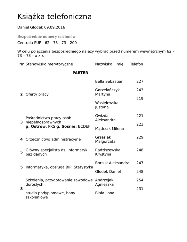 Książka telefoniczna Daniel Głodek 09.09.2016 Bezpośrednie numery telefonów Centrala PUP - 62 - 73 - 73 - 200 W celu połączenia bezpośredniego należy wybrać przed numerem wewnętrznym 62 – 73 – 73 – x x x Nr Stanowisko merytoryczne Nazwisko i imię Telefon Bella Sebastian 227 Gorzelańczyk Martyna 243 PARTER 2 Oferty pracy 219 Wasielewska Justyna Pośrednictwo pracy osób 3 niepełnosprawnych g. Ostrów: PRS g. Sośnie: BCDEF 4 Orzecznictwo administracyjne 5 Główny specjalista ds. informatyki i baz danych Gwizdal Aleksandra 221 223 Mądrzak Milena Grzesiak Małgorzata 229 Radziszewska Krystyna 248 Borsuk Aleksandra 247 Głodek Daniel 248 5 Informatyka, obsługa BIP, Statystyka Szkolenia, przygotowanie zawodowe Andrzejak dorosłych, Agnieszka 8 254 231 studia podyplomowe, bony szkoleniowe Biała Ilona 9 Ryś Wiktor 218 Siwakowska Aneta 218 oferty pracy, pośrednictwo pracy Walczak – Dudek Danuta 220 g. Skalmierzyce: ABCDEFGHIJKLŁ Stasierska Barbara 240 Rejestracja oświadczeń dot. cudzoziemców, MiastoOstrów:DWP 10 g. Odolanów ABCDEFGHIJKLŁMNOPRSTUWZ 244 Zmysłowska Danuta Miast Ostrów:M g. Skalmierzyce: MNOPRSTUWZ Miasto Ostrów: N R Olejniczak–Gąska Marta 239 13 g. Raszków ABCDEFGHIJKLŁ Miasto Ostrów:O S U Z Szczepaniak Małgorzata 226 Krawczyk Justyna 249 Malczyk Marzena 233 Kępas – Ryś Karolina 200 16 Rejestracja, 18 Biuro podawcze / kancelaria/centrala 200 Szafrańska Barbara PIĘTROI 100Sala konferencyjna 101Dyrektor PUP 203 Pawlak–Kornack a Hanna 204 Jackowska Dorota 201 102Sekretariat, kontrole wewnętrzne FAX 103Z-ca Dyrektora PUP/ Kierownik Kaczmarek Anna 202 205 działu CAZ-U g. Sieroszewice ABCDEFGHIJKLŁM Kostrzewska Sylwia 232 g. Ostrów: WZ Miasto Ostrów: T 104 262 Niemand Barbara Miasto Ostrów: EF J g. Ostrów OTU g. Sośnie: A GHIJKLŁMNOPRSTUWZ 262 Szczerecka Ewa Łukaszczyk Łucja 224 Nowak Katarzyna 252 Pawlaczyk Agnieszka 234 Piskorska Romana 228 g. Ostrów ABC Miasto Ostrów: B C Klaudia L Pruchnicka 214 105Kierownik ES g. Raszków MNOPRSTUWZ Miasto Ostrów: AHIŁ 106 g. Przygodzice NOPRSTUWZ Miasto Ostrów: K 107Kierownik CAZ-I g.Sieroszewice NOPRSTUWZ 225 109 Michalak Iwona g. Przygodzice ABCDEFGHIJKLŁM Miasto Ostrów G g. Ostrów DEFGHIJKLŁMN Główny Księgowy /Kierownik działu FK Konkolewska Iwona Budżet, ubezpieczenia zdrowotne i społeczne Krupka Magdalena 110 206 206 111 Miasto Ostrów: KLŁMN T g. osoby z Kwiecień Skalmierzyce i Odolanów prawem Bernadeta do 257 Miasto Ostrów: ABCDEFGHIJ R g. Ostrów i Przygodzice zasiłku Mydlak Magdalena 258 Guździoł Danuta 263 Kaźmierczak Marzena 215 Miasto Ostrów: OPSUWZ g. Raszków, Sieroszewice i Sośnie PIĘTRO II 200Ubezpieczenia zdrowotne i społeczne 210 Walczak Anna 200Księgowość Funduszu Pracy Składnica akt, wydawanie 201 zaświadczeń z archiwum Brodala Teresa 207 Grzesiak Justyna 208 Majchrzak Klaudia 208 Maciejewska Sylwia 250 250 Prudlik Lidia Prace interwencje, prace społecznie Rutkowska Lidia użyteczne, refundacje, CIS, spółdzielnie socjalne, zatrudnienie wspierane, dodatki aktywizacyjne 202 Młynarczyk Renata 211 211 Doposażenie stanowisk pracy FP i PFRON Poprawa Agnieszka 260 Michalak Justyna 203 Ewidencja świadczeń osób z prawem Kokot Beata do zasiłku, wydawanie zaświadczeń Iwaśków Małgorzata Bon zatrudnieniowy, 204 Krakowska Monika dofinansowanie zatrudnienia do 30r.ż. Zamówienia publiczne 238 238 237 216 230 Szczotka Marta Borowska Mariola 242 Moch Lucyna 241 Kierownik działu OR Gajek Jolanta 256 Kadry Stodolska Anna 246 Czekalska Magdalena 217 205Ewidencja osób bez prawa do zasiłku 207 209 Dotacje FP i PFRON, bon zasiedleniowy 217 Król Magdalena Hojan Dorota 245 Krajowy Fundusz Szkoleniowy, dofinansowanie do Lis Magdalena 210 zat. osób 50+, świadczenia aktywizacyjne Zespół projektowy EFS 253 Makowska Sławomira 253 Staże Koryciak Ilona 211 Ewidencja osób odbywających staż lub szkolenie Płokarz Katarzyna Szyszka-Lamczak Joanna Program Aktywizacja i Integracja 236 255 259 bpdz - bez prawa do zasiłku EFS -Europejski Fundusz Społeczny