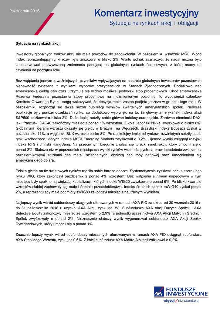 Październik 2016 Komentarz inwestycyjny Sytuacja na rynkach akcji i obligacji Sytuacja na rynkach akcji Inwestorzy globalnych rynków akcji nie mają powodów do zadowolenia. W październiku wskaźnik MSCI World Index reprezentujący rynki rozwinięte zniżkował o blisko 2%. Warto jednak zaznaczyć, że nadal można było zaobserwować podwyższoną zmienność panującą na globalnych rynkach finansowych, z którą mamy do czynienia od początku roku. Bez wątpienia jednym z ważniejszych czynników wpływających na nastroje globalnych inwestorów pozostawała niepewność związana z wynikami wyborów prezydenckich w Stanach Zjednoczonych. Dodatkowo nad amerykańską giełdą cały czas utrzymuje się widmo możliwej podwyżki stóp procentowych. Choć amerykańska Rezerwa Federalna pozostawiła stopy procentowe na niezmienionym poziomie, to wypowiedzi członków Komitetu Otwartego Rynku mogą wskazywać, że decyzja może zostać podjęta jeszcze w grudniu tego roku. W październiku rozpoczął się także sezon publikacji wyników kwartalnych amerykańskich spółek. Pierwsze publikacje były poniżej oczekiwań rynku, co dodatkowo wypłynęło na to, że główny amerykański indeks akcji S&P500 zniżkował o blisko 2%. Dużo lepiej radziły sobie główne indeksy europejskie. Zarówno niemiecki DAX, jak i francuski CAC40 zakończyły miesiąc z ponad 1% wzrostem. Z kolei japoński Nikkei zwyżkował o blisko 6%. Globalnymi liderami wzrostu okazały się giełdy w Brazylii i na Węgrzech. Brazylijski indeks Bovespa zyskał w październiku 11%, a węgierski BUX wzrósł o blisko 8%. Po raz kolejny lepiej od rynków rozwiniętych radziły sobie rynki wschodzące, których indeks MSCI Emerging Markets zwyżkował o 0,2%. Ujemne wyniki osiągnął rosyjski indeks RTS i chiński HangSeng. Na przeciwnym biegunie znalazł się turecki rynek akcji, który umocnił się o ponad 2%. Słabsze niż w poprzednich miesiącach wyniki rynków wschodzących są prawdopodobnie związane z październikowymi zniżkami cen metali szlachetnych, obniżką cen ropy naftowej oraz umocnieniem się amerykańskiego dolara. Polska giełda na tle światowych rynków radziła sobie bardzo dobrze. Systematycznie zyskiwał indeks szerokiego rynku WIG, który zakończył październik z ponad 4% wzrostem. Bez wątpienia silnikiem napędowym w tym miesiącu były spółki o największej kapitalizacji, których indeks WIG20 zwyżkował o ponad 6%. Po blisko kwartale wzrostów słabiej zachowały się małe i średnie przedsiębiorstwa. Indeks średnich spółek mWIG40 zyskał ponad 2%, a reprezentujący małe podmioty sWIG80 zakończył miesiąc z neutralnym wynikiem. Najlepszy wynik wśród subfunduszy akcyjnych oferowanych w ramach AXA FIO za okres od 30 września 2016 r. do 31 października 2016 r. uzyskał AXA Akcji, zyskując 3%. Subfundusze AXA Akcji Dużych Spółek i AXA Selective Equity zakończyły miesiąc ze wzrostem o 2,9%, a jednostki uczestnictwa AXA Akcji Małych i Średnich Spółek zwyżkowały o ponad 2%. Nieznacznie słabszy wynik wygenerował subfundusz AXA Akcji Spółek Dywidendowych, który umocnił się o ponad 1%. Znacznie lepszy wynik wśród subfunduszy mieszanych oferowanych w ramach AXA FIO osiągnął subfundusz AXA Stabilnego Wzrostu, zyskując 0,6%. Z kolei subfundusz AXA Makro Alokacji zniżkował o 0,2%. Październik 2016 Komentarz inwestycyjny Sytuacja na rynkach akcji i obligacji Wykres indeksu WIG 12M na dzień 31.10.2016 r. Sytuacja na rynkach obligacji W minionym miesiącu opublikowano wiele znaczących danych makroekonomicznych odnoszących się do głównych światowych gospodarek. W przypadku Stanów Zjednoczonych pogorszeniu uległy dane dotyczące rynku pracy. Wzrost zatrudnienia w sektorze pozarolniczym znalazł się poniżej oczekiwań ekspertów. Poprawie uległy z kolei dane PMI dla sektora przemysłowego i usługowego oraz odczyt PKB w trzecim kwartale. Informacje te wskazują, że ewentualne podniesienie stóp procentowych przez FED może mieć miejsce jeszcze w tym roku. Poprawie uległy również wstępne odczyty indeksów PMI dla sektora przemysłowego oraz usługowego strefy euro, które wzrosły odpowiednio do poziomu 53,3 pkt i 53,5 pkt. Oba odczyty znalazły się powyżej poziomu zakładanego przez ekspertów. Październikowe dane makroekonomiczne dotyczące stanu polskiej gospodarki przyniosły nieznaczną poprawę nastrojów. Mimo że tempo inflacji konsumenckiej pozostaje niezmiennie poniżej zera, to odczyt na poziomie -0,5% r/r wobec poprzedniego odczytu -0,8% r/r wskazuje na tendencję zwyżkową wskaźnika. Poprawie uległy także dane dotyczące importu i eksportu, które wzrosły odpowiednio o 10,4% i 8% w ujęciu r/r. Produkcja przemysłowa w polskiej gospodarce wzrosła o 3,2% r/r, a sprzedaż detaliczna o 4,8% r/r. W październiku rynek dłużny przyniósł inwestorom ujemne stopy zwrotu. W ciągu całego miesiąca najmniej traciły aktywa obarczone największym ryzykiem. Indeks obligacji wysokodochodowych (iBoxx $ Liquid High Yield Index) nieznacznie się osłabił. Indeks obligacji klasy inwestycyjnej (iBoxx Liquid Investment Grade Index) zniżkował o ponad 1%, podobnie jak indeks amerykańskich obligacji skarbowych (Bloomberg/EFFAS Bond Indices US Govt All > 1 Yr TR). Największą stratę wygenerował indeks rządowych obligacji europejskich (Bloomberg/EFFAS Bond Indices Euro Govt All > 1 Yr TR), zniżkując o ponad 2%. Bardziej sprzyjający dla inwestorów był rynek polskich obligacji skarbowych, którego indeks (Treasury BondSpot Poland Index) spadł o 0,4%, a rentowność 10-letnich obligacji skarbowych (10PLY.B) z końcem października wzrosła powyżej poziomu 3,1%. Subfundusze AXA Lokacyjny oraz AXA Obligacji Korporacyjnych zakończyły miesiąc nieznacznie powyżej wartości z końca września. Subfundusz AXA Obligacji stracił w analogicznym okresie 0,4%. Zespół inwestycyjny AXA TFI Październik 2016 Komentarz inwestycyjny Sytuacja 