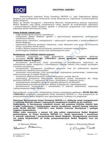 POLITYKA JAKOŚCI Podstawowym zadaniem Firmy Doradczej ISOTOP s.c. jako Organizatora Badań Biegłości jest profesjonalne świadczenie usług obejmujących organizację i przeprowadzanie Badań Biegłości. Mając na uwadze wymagania i zadowolenie Klientów, bezpieczeństwo podczas organizacji Badań Biegłości oraz jakość świadczonych usług, dąŜymy do profesjonalnej organizacji i przeprowadzania Badań Biegłości zgodnie z ustalonymi programami oraz zapewniamy najwyŜszą jakość oferowanych usług. Celem Polityki Jakości jest: - ciągłe doskonalenie systemu zarządzania; - realizowanie Badań Biegłości zgodnie z opracowanymi programami, spełniającymi oczekiwania Klienta; - dostarczenie rzetelnych, wiarygodnych i uŜytecznych sprawozdań z przeprowadzonych Badań Biegłości; - zapewnienie Klientom poufności informacji i praw własności oraz prawa do wnoszenia skarg i wyraŜania swoich opinii; - troska o Klienta poprzez dotrzymywanie ustalonych terminów realizacji zadań; - przestrzeganie przepisów prawa oraz obowiązujących norm. Realizujemy cele Polityki Jakości poprzez: - wdroŜenie, utrzymanie i ciągłe doskonalenie systemu zarządzania zgodnego z wymogami PN-EN ISO/IEC 17043:2011 „Ocena zgodności. Ogólne wymagania dotyczące badania biegłości”; - zatrudnienie dostatecznej liczby pracowników o kwalifikacjach właściwych do wykonywania zadań, znających i rozumiejących Politykę Jakości oraz zasady wynikające z systemu zarządzania; - utrzymywanie wymaganych kwalifikacji personelu oraz ich podnoszenie poprzez systematyczne szkolenia pracowników; - stosowanie wzorcowanego i/lub sprawdzonego wyposaŜenia pomiarowego i badawczego wykorzystywanego do Badań Biegłości; - stosowania udokumentowanych metod badawczych i analizy danych; - zapewnienie dostępności dokumentów opisujących system zarządzania dla całego personelu ISOTOP s.c., znajomości ich treści i stosowania w codziennej pracy; - przywiązywanie szczególnej uwagi do sygnałów płynących od Klientów; - podejmowanie potrzebnych korekcji, działań korygujących i zapobiegawczych; - gwarantowanie bezstronności i niezaleŜności w zakresie planowania, organizacji i przeprowadzania Badań Biegłości. Wprowadzenie, utrzymanie i doskonalenie systemu zarządzania zgodnego z PN-EN ISO/IEC 17043:2011 potwierdza wiarygodność Firmy Doradczej ISOTOP s.c. oraz kompetencje do przeprowadzania Badań Biegłości oraz opracowywania i realizacji ich programów. NajwyŜsze Kierownictwo Firmy Doradczej ISOTOP s.c. deklaruje swoje zaangaŜowanie w realizację Polityki Jakości i zapewnienie niezbędnych środków do jej realizacji. Deklarujemy, iŜ dotrzymamy wszelkich starań, aby powyŜsza Polityka Jakości była w pełni realizowana, a funkcjonujący system zarządzania, spełniał wymogi nałoŜone przez PN-EN ISO/IEC 17043:2011 oraz Polskie Centrum Akredytacji i podlegał ciągłemu doskonaleniu. Zdając sobie znaczenie z waŜnej roli jaką pełnią organizatorzy Badań Biegłości gwarantujemy, Ŝe Firma Doradcza ISOTOP s.c. działa bezstronnie i niezaleŜnie w zakresie organizacji i przeprowadzania Badań Biegłości. Wynagrodzenie personelu nie zaleŜy bezpośrednio od liczby przeprowadzonych Badań Biegłości oraz ich wyników. dr Sławomir Piliszek 6 sierpień 2012 rok Nr wydania: I dr Agata J. Wilczyńska-Piliszek Strona 1 z 1