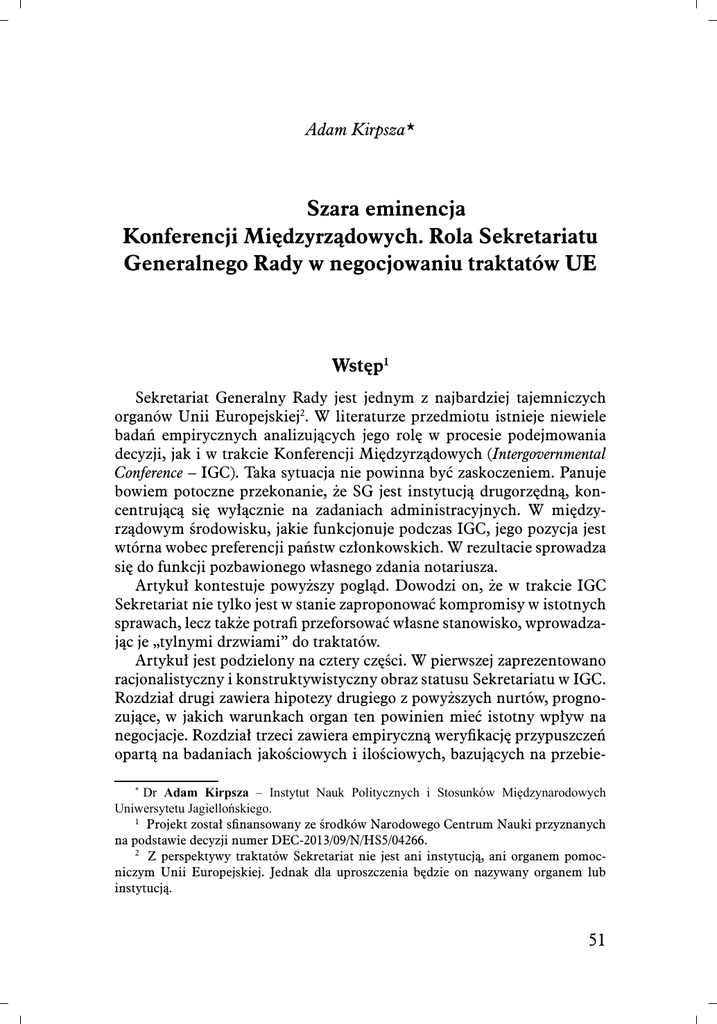 Adam Kirpsza* Szara eminencja Konferencji Międzyrządowych. Rola Sekretariatu Generalnego Rady w negocjowaniu traktatów UE Wstęp1 Sekretariat Generalny Rady jest jednym z najbardziej tajemniczych organów Unii Europejskiej2. W literaturze przedmiotu istnieje niewiele badań empirycznych analizujących jego rolę w procesie podejmowania decyzji, jak i w trakcie Konferencji Międzyrządowych (Intergovernmental Conference – IGC). Taka sytuacja nie powinna być zaskoczeniem. Panuje bowiem potoczne przekonanie, że SG jest instytucją drugorzędną, koncentrującą się wyłącznie na zadaniach administracyjnych. W międzyrządowym środowisku, jakie funkcjonuje podczas IGC, jego pozycja jest wtórna wobec preferencji państw członkowskich. W rezultacie sprowadza się do funkcji pozbawionego własnego zdania notariusza. Artykuł kontestuje powyższy pogląd. Dowodzi on, że w trakcie IGC Sekretariat nie tylko jest w stanie zaproponować kompromisy w istotnych sprawach, lecz także potrafi przeforsować własne stanowisko, wprowadzając je „tylnymi drzwiami” do traktatów. Artykuł jest podzielony na cztery części. W pierwszej zaprezentowano racjonalistyczny i konstruktywistyczny obraz statusu Sekretariatu w IGC. Rozdział drugi zawiera hipotezy drugiego z powyższych nurtów, prognozujące, w jakich warunkach organ ten powinien mieć istotny wpływ na negocjacje. Rozdział trzeci zawiera empiryczną weryfikację przypuszczeń opartą na badaniach jakościowych i ilościowych, bazujących na przebie* Dr Adam Kirpsza – Instytut Nauk Politycznych i Stosunków Międzynarodowych Uniwersytetu Jagiellońskiego. 1 Projekt został sfinansowany ze środków Narodowego Centrum Nauki przyznanych na podstawie decyzji numer DEC-2013/09/N/HS5/04266. 2 Z perspektywy traktatów Sekretariat nie jest ani instytucją, ani organem pomocniczym Unii Europejskiej. Jednak dla uproszczenia będzie on nazywany organem lub instytucją. 51 Studia Europejskie, 4/2016 gu dwóch Konferencji Międzyrządowych: IGC 1996–1997 oraz IGC 2000. Uzyskane wyniki przedstawione są w konkluzjach. Pozycja Sekretariatu Generalnego Rady w Konferencjach Międzyrządowych w świetle racjonalizmu i konstruktywizmu społecznego Zgodnie z dominującym poglądem Sekretariat Generalny odgrywa w czasie Konferencji Międzyrządowych rolę drugorzędną, koncentrującą się na zadaniach administracyjnych. Przede wszystkim wspomaga prezydencję w zakresie koordynacji stanowisk, pełni funkcję tłumacza, archiwisty, doradcy czy eksperta3. Ale nie jest samodzielny i nie kształtuje wyniku negocjacji4. Takie stanowisko wypływa z dwóch teorii – liberalizmu międzyrządowego oraz teorii mocodawca–agent. Z perspektywy pierwszej koncepcji IGC są negocjacjami stricte międzyrządowymi, cechującymi się wysoką efektywnością i niskimi kosztami. Uczestniczący w nich aktorzy są całkowicie racjonalni i mają pełną informację o przedmiocie rokowań oraz preferencjach konkurentów5. W efekcie są oni w stanie znaleźć obszar kompromisu i osiągnąć rezultat efektywny w sensie Pareto, będący odbiciem ich relatywnej siły. W takich warunkach pozycja Sekretariatu Generalnego jest znikoma – aktorzy samodzielnie panują nad procesem negocjacyjnym, a wszelkie ingerencje zewnętrznych podmiotów są zbyteczne, a nawet destrukcyjne6. Z punktu widzenia teorii mocodawca–agent IGC są negocjacjami o wysokich kosztach, często dotyczącymi kwestii wymagających ekspertyzy, z którymi państwa nie zawsze są w stanie sobie poradzić. Konferencje Międzyrządowe cechują się również niebezpieczeństwem wystąpienia problemów kooperacyjnych, takich jak: strategie braku współpracy J. Tallberg, The Power of the Presidency: Brokerage, Efficiency and Distribution in EU Negotiations, „Journal of Common Market Studies”, vol. 42, no. 5/2004, s. 1003–1004; T. Christiansen, S. Vanhoonacker, At a Critical Juncture? Change and Continuity in the Institutional Development of the Council Secretariat, „West European Politics”, vol. 31, no. 4/2008, s. 757; H. Dijkstra, Explaining variation in the role of the EU Council Secretariat in first and second pillar policy-making, „Journal of European Public Policy”, vol. 17, no. 4/2004, s. 527– 544; K. Ławniczak, Rada Unii Europejskiej. Organizacja i sposób działania, Warszawa 2014, s. 36–38. 4 J. Tallberg, The Power of the Chair: Formal Leadership by the Council Presidency, w: Unveiling the Council of the European Union. Games Governments Play in Brussels, red. D. Naurin, H. Wallace, Basingstoke 2010, s. 201; H. Dijkstra, op.cit., s. 537. 5 A. Moravcsik, A New Statecraft? Supranational Entrepreneurs and International Cooperation, „International Organization”, vol. 53, no. 2/1999, s. 292, 298–301. 6 A. Moravcsik, op.cit., s. 269–270. 3 52 A. Kirpsza, Szara eminencja Konferencji Międzyrządowych… ze strony partnerów czy spory wokół dystrybucji zysków i strat, które mogą zablokować podejmowanie decyzji. W takich warunkach znaczenie zyskuje Sekretariat (lub inne instytucje), który potrafi dostarczyć informację (np. o preferencjach aktorów, procedurach) i ekspertyzę oraz zredukować koszty transakcyjne7. Racjonalne zachowanie państw polega zatem na delegacji na rzecz SG określonych uprawnień i zasobów w celu realizacji powyższych funkcji, tym samym zbudowania relacji mocodawca (państwa)–agent (Sekretariat). Jednak wyposażenie zewnętrznego organu w kompetencje generuje ryzyko wymykania się spod kontroli, toteż delegujący tworzą mechanizmy kontroli delegowanego. Według tego obrazu Sekretariat jest drugorzędnym organem – stanowi narzędzie państw stosowane w celu rozwiązania problemów kooperacyjnych i znajdujące się pod ich nadzorem8. Inny obraz Sekretariatu proponuje konstruktywizm społeczny. Zakłada on, że rzeczywistość jest społecznie konstruowana, to znaczy wszystkie zachowania są silnie powiązane z kontekstem, w którym mają miejs