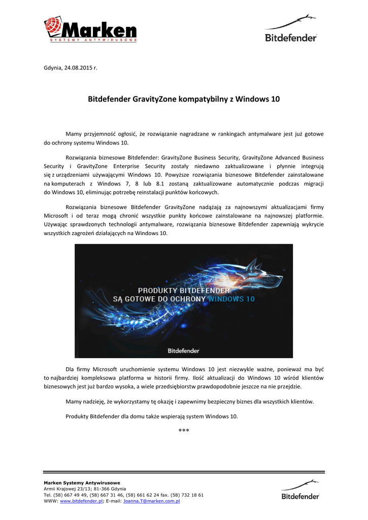 Gdynia, 24.08.2015 r. Bitdefender GravityZone kompatybilny z Windows 10 Mamy przyjemność ogłosić, że rozwiązanie nagradzane w rankingach antymalware jest już gotowe do ochrony systemu Windows 10. Rozwiązania biznesowe Bitdefender: GravityZone Business Security, GravityZone Advanced Business Security i GravityZone Enterprise Security zostały niedawno zaktualizowane i płynnie integrują się z urządzeniami używającymi Windows 10. Powyższe rozwiązania biznesowe Bitdefender zainstalowane na komputerach z Windows 7, 8 lub 8.1 zostaną zaktualizowane automatycznie podczas migracji do Windows 10, eliminując potrzebę reinstalacji punktów końcowych. Rozwiązania biznesowe Bitdefender GravityZone nadążają za najnowszymi aktualizacjami firmy Microsoft i od teraz mogą chronić wszystkie punkty końcowe zainstalowane na najnowszej platformie. Używając sprawdzonych technologii antymalware, rozwiązania biznesowe Bitdefender zapewniają wykrycie wszystkich zagrożeń działających na Windows 10. Dla firmy Microsoft uruchomienie systemu Windows 10 jest niezwykle ważne, ponieważ ma być to najbardziej kompleksowa platforma w historii firmy. Ilość aktualizacji do Windows 10 wśród klientów biznesowych jest już bardzo wysoka, a wiele przedsiębiorstw prawdopodobnie jeszcze na nie przejdzie. Mamy nadzieję, że wykorzystamy tę okazję i zapewnimy bezpieczny biznes dla wszystkich klientów. Produkty Bitdefender dla domu także wspierają system Windows 10. *** Marken Systemy Antywirusowe Armii Krajowej 23/13; 81-366 Gdynia Tel. (58) 667 49 49, (58) 667 31 46, (58) 661 62 24 fax. (58) 732 18 61 WWW: www.bitdefender.pl; E-mail: [email protected] Bitdefender® to twórca jednej z najszybciej i najefektywniej rozwijających się linii cenionego na świecie oprogramowania bezpieczeństwa. Od 2001 roku Bitdefender jest pionierem branży, opracowującym i wdrażającym nagradzane technologie bezpieczeństwa. Każdego dnia Bitdefender chroni cyfrowe doświadczenia dziesiątek milionów użytkowników domowych i korporacyjnych na całym świecie. Rozwiązania Bitdefender rozpowszechniane są poprzez globalną sieć partnerów i dystrybutorów z wielu krajów. Technologia antywirusowa Bitdefendera znalazła się na szczycie wiodących w branży testów AV-Test i AV-Comparatives. Więcej informacji na temat Bitdefendera i jego produktów można znaleźć na stronach internetowych poświęconych rozwiązaniom bezpieczeństwa. Dodatkowo, na stronie www.hotforsecurity.com Bitdefender przedstawia kulisy i najbardziej aktualne informacje dotyczące zagrożeń bezpieczeństwa, pozwalając użytkownikom śledzić jego codzienną walkę ze złośliwym oprogramowaniem. Marken Systemy Antywirusowe istnieje od 1999 roku i aktywnie działa w branży bezpieczeństwa IT na terenie całej Polski. Firma zajmuje się dystrybucją oraz wdrażaniem produktów związanych z najnowszymi technologiami w zakresie bezpieczeństwa i ochrony danych w sieciach komputerowych, zwłaszcza oprogramowania antywirusowego. W swojej ofercie posiada rozwiązania, które otrzymały pozytywne opinie i certyfikaty w niezależnych testach prowadzonych przez laboratoria na całym świecie. Marken Systemy Antywirusowe Armii Krajowej 23/13; 81-366 Gdynia Tel. (58) 667 49 49, (58) 667 31 46, (58) 661 62 24 fax. (58) 732 18 61 WWW: www.bitdefender.pl; E-mail: [email protected]