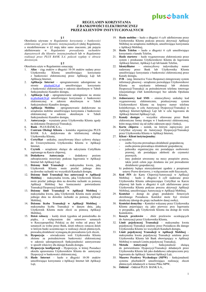 REGULAMIN KORZYSTANIA Z BANKOWOŚCI ELEKTRONICZNEJ PRZEZ KLIENTÓW INSTYTUCJONALNYCH §1 Określenia używane w Regulaminie korzystania z bankowości elektronicznej przez klientów instytucjonalnych (dalej Regulamin), a niezdefiniowane w §2 mają takie samo znaczenie, jak pojęcia zdefiniowanie w Regulaminie prowadzenia rachunków depozytowych dla klientów instytucjonalnych lub w Regulaminie realizacji przez PLUS BANK S.A. poleceń wypłaty w obrocie dewizowym. §2 Określenia użyte w Regulaminie oznaczają: 1. Alias – ciąg znaków o długości 10-30 znaków nadany przez Użytkownika Klienta umożliwiający korzystanie z bankowości elektronicznej przez Aplikację Lajt lub Aplikację Internet, 2. Aplikacja Internet – oprogramowanie udostępnione na stronie plusbank24.pl umożliwiające korzystanie z bankowości elektronicznej w zakresie określonym w Tabeli funkcjonalności Kanałów dostępu, 3. Aplikacja Lajt - oprogramowanie udostępnione na stronie m.plusbank24.pl umożliwiające korzystanie z bankowości elektronicznej w zakresie określonym w Tabeli funkcjonalności Kanałów dostępu, 4. Aplikacja Mobilna – oprogramowanie dedykowane na urządzenia mobilne umożliwiające korzystania z bankowości elektronicznej w zakresie określonym w Tabeli funkcjonalności Kanałów dostępu, 5. Autoryzacja – wyrażenie przez Użytkownika Klienta zgody na dokonanie Dyspozycji/Transakcji, 6. Bank – PLUS BANK S.A., 7. Centrum Obsługi Klienta – komórka organizacyjna PLUS BANK S.A. dedykowana do telefonicznej obsługi Użytkownika Klienta, 8. Certyfikat – unikalny, zaszyfrowany klucz cyfrowy służący do Uwierzytelnienia Użytkownika Klienta w Aplikacji Internet, 9. Czytnik – urządzenie służące do odczytania Certyfikatu zapisanego na Karcie chipowej, 10. Dodatkowa Autoryzacja – dodatkowy poziom zabezpieczenia stosowany podczas logowania w Aplikacji Internet lub Aplikacji Lajt, 11. Dzienny limit Transakcji – maksymalna kwota, jaką Użytkownik Klienta może przelać jednego dnia na dowolne rachunki we wszystkich Kanałach dostępu, 12. Dzienny limit Transakcji bez autoryzacji w Aplikacji Mobilnej – maksymalna kwota, jaką Użytkownik Klienta może przelać jednego dnia na dowolne rachunki za pomocą Aplikacji Mobilnej bez konieczności potwierdzenie Transakcji/Dyspozycji kodem PIN, 13. Dzienny limit Transakcji w Aplikacji Mobilnej maksymalna kwota, jaką Użytkownik Klienta może przelać jednego dnia na dowolne rachunki za pomocą Aplikacji Mobilnej, 14. Dzienna liczba Transakcji w Aplikacji Mobilnej – maksymalna liczba Transakcji w danym dniu, jaką Użytkownik Klienta może zlecić za pomocą Aplikacji Mobilnej, 15. Dzień roboczy – każdy dzień tygodnia od poniedziałku do piątku, z wyłączeniem dni ustawowo uznanych w Rzeczypospolitej Polskiej za dni wolne od pracy lub uznanych za wolne przez Bank, dzień roboczy oznacza dzień w którym banki uczestniczące w realizacji zleceń płatniczych, prowadzą działalność wymaganą do prowadzenia tych zleceń, 16. Dyspozycja - oświadczenie woli Użytkownika Klienta złożone za pośrednictwem bankowości elektronicznej w zakresie udostępnionych funkcjonalności autoryzowane w sposób właściwy dla danego Kanału dostępu. 17. Dyspozycja konfiguracji – Dyspozycja, w której Posiadacz określa uprawnienia Użytkowników Klienta do autoryzacji Dyspozycji w bankowości elektronicznej, 18. Hasło Internet – hasło o długości 10-30 znaków umożliwiające korzystanie z Aplikacji Internet lub Aplikacji Lajt, 19. Hasło mobilne – hasło o długości 4 cyfr zdefiniowane przez Użytkownika Klienta podczas procesu aktywacji Aplikacji Mobilnej na urządzeniu mobilnym, umożliwiające korzystania z Aplikacji Mobilnej, 20. Hasło Telefon – hasło o długości 6 cyfr umożliwiające korzystanie z kanału Telefon, 21. Hasło startowe – hasło wygenerowane elektronicznie przez system i przekazane Użytkownikowi Klienta do logowania Aplikacji Internet, Aplikacji Lajt lub kanale Telefon, 22. Identyfikator – ośmiocyfrowy indywidualny numer nadawany przez Bank lub Użytkownika Klienta umożliwiający korzystanie z bankowości elektronicznej przez Kanały dostępu, 23. IVR – (ang. Interactive Voice Response) zintegrowany system informacji głosowej - urządzenie pozwalające Użytkownikowi Klienta na uzyskanie informacji lub złożenie Dyspozycji/Transakcji za pośrednictwem telefonu tonowego (stacjonarnego i/lub komórkowego) bez udziału Opiekuna Klienta, 24. Jednorazowy kod SMS - ośmiocyfrowy unikalny kod wygenerowany elektronicznie, przekazywany system Użytkownikowi Klienta na krajowy numer telefonu komórkowego, w celu Autoryzacji Dyspozycji/Transakcji w Aplikacji Internet/Aplikacji Lajt lub w celu logowania do Aplikacji Internet/Aplikacji Lajt, 25. Kanały dostępu – wszystkie oferowane przez Bank elektroniczne formy dostępu w I bankowości elektronicznej, które mogą różnić się od siebie zakresem opcji i funkcji, 26. Karta chipowa - nośnik, na którym zapisywany jest Certyfikat używany do Autoryzacji Dyspozycji/Transakcji przez Użytkownika Klienta w Aplikacji Internet, 27. Klient - Klient instytucjonalny: a) rezydent: osoba fizyczna prowadząca działalność gospodarczą; osoba prawna prowadząca działalność gospodarczą; jednostka organizacyjna nie posiadająca osobowości prawnej, ale posiadająca zdolność do czynności prawnych; inny podmiot utworzony na mocy przepisów prawa, także jeżeli celem jego działania nie jest prowadzenie działalności gospodarczej; b) podmioty będące nierezydentami zgodnie z przepisami ustawy Prawo dewizowe, z wyłączeniem osób fizycznych, 28. Kod PIN do Karty Chipowej/Autoryzacji w Aplikacji Mobilnej – hasło o długości 6 cyfr nadawane przez Użytkownika Klienta zabezpieczające Certyfikat na Karcie chipowej lub hasło o długości 6 cyfr zdefiniowane przez Użytkownika Klienta podczas procesu aktywacji Aplikacji Mobilnej, umożliwiające Autor