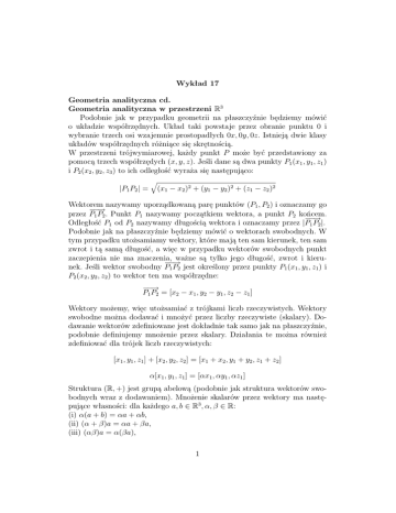 Wykład 17 Geometria analityczna cd. Geometria analityczna w przestrzeni R3 Podobnie jak w przypadku geometrii na płaszczyźnie będziemy mówić o układzie współrzędnych. Układ taki powstaje przez obranie punktu 0 i wybranie trzech osi wzajemnie prostopadłych 0x, 0y, 0z. Istnieją dwie klasy układów współrzędnych różniące się skrętnością. W przestrzeni trójwymiarowej, każdy punkt P może być przedstawiony za pomocą trzech współrzędych (x, y, z). Jeśli dane są dwa punkty P1 (x1 , y1 , z1 ) i P2 (x2 , y2 , z3 ) to ich odległość wyraża się następująco: |P1 P2 | = q (x1 − x2 )2 + (y1 − y2 )2 + (z1 − z2 )2 Wektorem nazywamy uporządkowaną parę punktów (P1 , P2 ) i oznaczamy go −−→ przez P1 P2 . Punkt P1 nazywamy początkiem wektora, a punkt P2 końcem. −−→ Odległość P1 od P2 nazywamy długością wektora i oznaczamy przez |P1 P2 |. Podobnie jak na płaszczyźnie będziemy mówić o wektorach swobodnych. W tym przypadku utożsamiamy wektory, które mają ten sam kierunek, ten sam zwrot i tą samą długość, a więc w przypadku wektorów swobodnych punkt zaczepienia nie ma znaczenia, ważne są tylko jego długość, zwrot i kieru−−→ nek. Jeśli wektor swobodny P1 P2 jest określony przez punkty P1 (x1 , y1 , z1 ) i P2 (x2 , y2 , z2 ) to wektor ten ma współrzędne: −−→ P1 P2 = [x2 − x1 , y2 − y1 , z2 − z1 ] Wektory możemy, więc utożsamiać z trójkami liczb rzeczywistych. Wektory swobodne można dodawać i mnożyć przez liczby rzeczywiste (skalary). Dodawanie wektorów zdefiniowane jest dokładnie tak samo jak na płaszczyźnie, podobnie definiujemy mnożenie przez skalary. Działania te można również zdefiniować dla trójek liczb rzeczywistych: [x1 , y1 , z1 ] + [x2 , y2 , z2 ] = [x1 + x2 , y1 + y2 , z1 + z2 ] α[x1 , y1 , z1 ] = [αx1 , αy1 , αz1 ] Struktura (R, +) jest grupą abelową (podobnie jak struktura wektorów swobodnych wraz z dodawaniem). Mnożenie skalarów przez wektory ma następujące własności: dla każdego a, b ∈ R3 , α, β ∈ R: (i) α(a + b) = αa + αb, (ii) (α + β)a = αa + βa, (iii) (αβ)a = α(βa), 1 (iv) 1a = a. Długość wektora Jeśli wektor a ma współrzędne [xa , ya , za ] to jego długość jest wyrażona wzorem: q |a| = x2a + ya2 + za2 Własności długości wektorów są podobne jak własności długości wektorów na płaszczyźnie: (i) |a + b| ¬ |a| + |b|, (ii) |αa| = |α||a|. Wektor a nazywa się wersorem jeśli |a| = 1. Wersory, który są położone na osiach nazywamy wersorami osi i oznaczamy je i dla osi 0x, j dla osi 0y, k dla osi 0z. Jak łatwo zauważy wersory osi mają współrzędne: i = [1, 0, 0], j = [0, 1, 0], k = [0, 0, 1]. Jeśli a, b, c są trzema wektorami, a α, β, γ skalarami to αa + βb + γc nazywamy liniową kombinacją wektorów a, b, c. Każdy wektor da się jednoznacznie przedstawić jako liniową kombinację wersorów i, j, k. Jeśli wektor a ma współrzędne xa , ya , za to a = xa i + ya j + za k. Rzeczywiście a = [xa , ya , za ] = xa [1, 0, 0] + ya [0, 1, 0] + za [0, 0, 1] = xa i + ya j + za k. Wektory a, b, c nazywamy komplanarnymi wtedy i tylko wtedy gdy istnieje płaszczyzna do której te wektory są równoległe. Inaczej mówiąc wektory a, b, c są komplanarne wtedy i tylko wtedy gdy jeden z nich jest liniową kombinacją pozostałych wektorów, np. a = βb + γc. Iloczyn skalarny Iloczynem skalarnym wektorów a = [x1 , y1 , z1 ] i b = [x2 , y2 , z2 ] nazywamy liczbę rzeczywistą x1 x2 + y1 y2 + z1 z2 i oznaczamy ją przez a ◦ b. Własności iloczynu skalarnego Niech a, b, c będą trzema wektorami, i niech α będzie skalarem, wtedy iloczyn skalarny ma następujące własności: (i) (a + b) ◦ c = a ◦ c + b ◦ c, (ii) (αa) ◦ b = α(a ◦ b) = a ◦ (αb), (iii) a ◦ b = b ◦ a, (iv) a ◦ a 0 i a ◦ a = 0 ⇐⇒ a = 0. √ Ponadto można zauważyć, że |a| = a ◦ a. Kątem między wektorami a i b nazywamy mniejszy z kątów, wyznaczonych przez przecinające się proste wyznaczone przez te wektory. Kąt między wektorami a i b wyznaczony jest wzorem: cos(^(a, b)) = 2 a◦b |a||b| Wektory a, b nazywamy ortogonalnymi wtedy i tylko wtedy gdy a ◦ b = 0 (inaczej mówiąc wektory są ortogonalne gdy kąt między nimi jest równy π2 ). Zadanie Wyznaczyć kąt między wektorami √ i b = [1, √ a = [2, 0, −1] √3, 0]. 2 2 Rozwiązanie Obliczamy: a ◦ b = 2, |a| = 2 + 1 = 5, |b| = 12 + 32 = √ 10 i otrzymujemy: cos(^(a, b)) = a◦b 2 =√ √ |a||b| 5 10 Iloczyn wektorowy Iloczynem wektorowym wektorów a = [xa , ya , za ] i b = [xb , yb , zb ] nazywamy wektor, który ma następujące współrzędne: [ya zb − yb za , xb za − xa zb , xa yb − xb ya ] i oznaczamy go przez a × b. Sposób obliczania iloczynu wektorowego. Iloczyn wektorowy wektorów a = [xa , ya , za ] i b = [xb , yb , zb ] można wyrazić przez wyznacznik: i a × b = xa xb j k ya za yb zb gdzie i, j, k są wersorami osi. Wyznacznik ten formalnie nie ma sensu (pierwszy wiersz składa się z wektorów) ale pozwala łatwo zapamiętać sposób obliczania iloczynu wektorowego. Można zauważyć, że: (i) |a × b| = |a||b| sin(^(a, b)), (ii) wektor a × b jest ortogonalny do wektora a i b, (iii) zwrot wektora a × b jest określony przez tzw. regułę śruby prawoskrętnej lub trzech palców lewej dłoni. (iv) a × b = 0 wtedy i tylko wtedy gdy a i b są wektorami kolinearnymi, (v) a × b = −b × a, (vi) (a + b) × c = a × c + b × c, (vii) (αa) × b = α(a × b). Z punktu (iv) łatwo wynika, że wektory a = [xa , ya , za ] i b = [xb , yb , zb ] są kolinearne wtedy i tylko wtedy gdy: ya za xa = = xb yb zb Zadanie Obliczyć pole trójkąta o wierzchołkach w punktach P1 (1, 2, 3), P2 (0, −1, −1), P3 (1, 0, 1). 3 −−→ −−→ Rozwiązanie Jeśli wyznaczymy wektory P1 P2 i P1 P3 to pole trójkąta jest −−→ −−→ −−→ −−→ równe P4 = 12 |P1 P2 ||P1 P3 | sin(^(P1 P2 , P1 P3 )), zatem P4 = 12 |P1 P2 × P1 P3 |