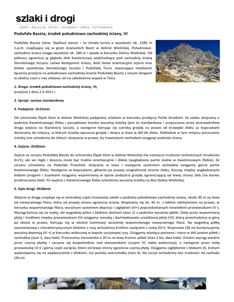 Podufała Baszta, środek południowo-zachodniej ściany, VI Podufała Baszta (słow. Opálová stena) – to śmiała turnia o wysokości ok. 2285 m n.p.m. znajdująca się w grani Granackich Baszt w dolinie Wielickiej. Południowozachodnia ściana osiąga wysokość ok. 180 m i opada w kierunku Doliny Wielickiej. Od północy ogranicza ją głęboki żleb Kwietnicowy podchodzący pod zachodnią ścianę Staroleśnego Szczytu. Łatwa dostępność ściany, dość łatwe orientacyjne zejście oraz bliskie sąsiedztwo Staroleśnego Szczytu i Podufałej Turni, stwarzające możliwość łączenia przejścia na południowo-zachodniej ścianie Podufałej Baszty z innymi drogami w okolicy czyni z niej ciekawy cel na całodzienny wypad w Tatry. 1. Droga: środek południowo-zachodniej ściany, VI, przejście z dnia 2.X.2011 r. 2. Sprzęt: zestaw standardowy 3. Podejście: 1h15min Od schroniska Śląski Dom w dolinie Wielickiej podążamy szlakiem w kierunku przełęczy Polski Grzebień. Ze szlaku skręcamy u podnóża Kwietnicowego Żlebu i początkowo bardzo wyraźną ścieżką (jest to standardowa i uczęszczana przez przewodników droga wejścia na Staroleśny Szczyt), a następnie kierując się szeroką grzędą na prawo od krawędzi żlebu za kopczykami docieramy do miejsca, w którym ścieżka opuszcza grzędę i skręca w lewo w dół do żlebu. Dokładnie w tym miejscu porzucamy ścieżkę (nie schodzimy do żlebu) i skręcamy w prawo, by trawiastymi zachodami osiągnąć podnóże ściany. 4. Zejście: 2h20min Zejście ze szczytu Podufałej Baszty do schroniska Śląski Dom w dolinie Wielickiej nie nastręcza trudności technicznych (trudności 0+/1), ale we mgle i deszczu może być trudne orientacyjnie i śliskie (wygładzone partie skalne w Kwietnicowym Żlebie). Ze szczytu schodzimy na Podufały Przechód, skręcamy w lewo i następnie systemem zachodów osiągamy górne partie Kwietnicowego Żlebu. Następnie za kopczykami, głównie po prawej orograficznie stronie żlebu, klucząc między wygładzonymi białymi progami i ściankami osiągamy wspomnianą w opisie podejścia grzędę ograniczającą od lewej strony żleb (na koniec przekraczamy żleb). Po wyjściu z Kwietnicowego Żlebu schodzimy wyraźną ścieżką na dno Doliny Wielickiej. 5. Opis drogi: 3h30min Wejście w drogę znajduje się w centralnej części trawiastej zatoki u podnóża południowo-zachodniej ściany, około 30 m na lewo od niewyraźnego filara, który od prawej strony ogranicza ścianę. Wspinamy się ok. 45 m z lekkim odchyleniem na prawo, w kierunku wspomnianego filara, wyraźnym systemem depresji i zagłębień (IV+) poprzedzielanych niewielkimi przewieszkami (V-). Wyciąg kończy się na małej, ale wygodnej półce z blokiem skalnym (stan 1) u podnóża wyraźnej płytki. Dalej przez wspomnianą płytę i środkiem między przewieszkami (V) osiągamy szeroką i dachówkowato urzeźbioną płytę (VI), którą przechodzimy w górę po skosie w prawo, kierując się w okolice kulminacji wcześniej wspomnianego niewyraźnego filara. Na wygodną półkę stanowiskową z charakterystycznym blokiem z rysą wchodzimy krótkim zacięciem z ryską (IV+). Wspinanie (30 m) kontynuujemy wyraźną depresją (III +) w kierunku widocznej w kopule szczytowej rysy. Osiągamy wiodący poziomo i nieco w dół system półek i zachodów (stan 3, dwa haki). Przenosimy stanowisko o 20 m na lewy kraniec półek (stan 3 bis, dwa haki). Ostatni wyciąg wiedzie przez czarną płytkę i zaczyna się bezpośrednio nad stanowiskiem (czujne VI, słaba asekuracja), a następnie przez małą przewieszkę (V+) i górną część zacięcia, które od lewej strony ogranicza czarną płytę. Osiągamy zagłębienie z blokami (I), którym wydostajemy się na wypłaszczenie z blokiem, tuż poniżej wierzchołka (stan 4). Na szczyt wchodzimy bez trudności od zachodu (20 m). 6. Uwagi: Drogę próbowaliśmy skończyć idąc ze stanowiska nr 3 wprost w górę płytą (VI) pod kominek przechodzący w rysę (stare pętle) w przewieszkach (VII?) i dalej na szczyt – wycof z przewieszek … 7. Schemat: