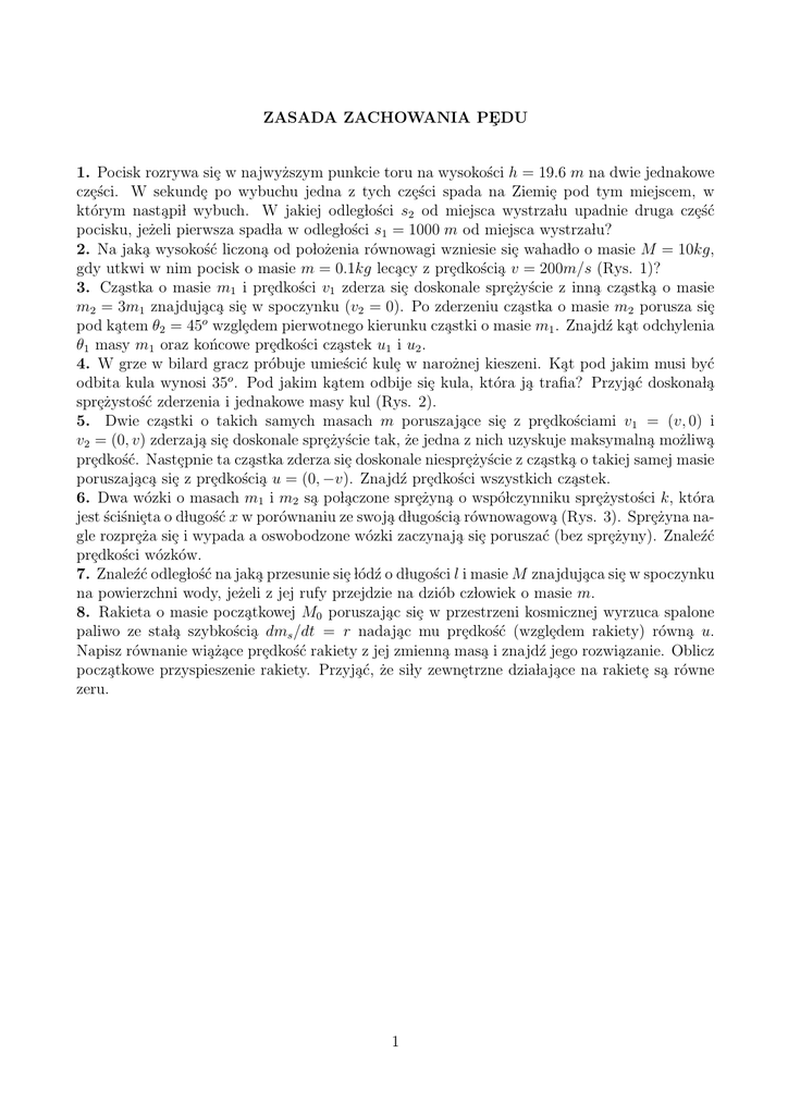 ZASADA ZACHOWANIA PȨDU 1. Pocisk rozrywa siȩ w najwyższym punkcie toru na wysokości h = 19.6 m na dwie jednakowe czȩści. W sekundȩ po wybuchu jedna z tych czȩści spada na Ziemiȩ pod tym miejscem, w którym nasta̧piÃl wybuch. W jakiej odlegÃlości s2 od miejsca wystrzaÃlu upadnie druga czȩść pocisku, jeżeli pierwsza spadÃla w odlegÃlości s1 = 1000 m od miejsca wystrzaÃlu? 2. Na jaka̧ wysokość liczona̧ od poÃlożenia równowagi wzniesie siȩ wahadÃlo o masie M = 10kg, gdy utkwi w nim pocisk o masie m = 0.1kg leca̧cy z prȩdkościa̧ v = 200m/s (Rys. 1)? 3. Cza̧stka o masie m1 i prȩdkości v1 zderza siȩ doskonale sprȩżyście z inna̧ cza̧stka̧ o masie m2 = 3m1 znajduja̧ca̧ siȩ w spoczynku (v2 = 0). Po zderzeniu cza̧stka o masie m2 porusza siȩ pod ka̧tem θ2 = 45o wzglȩdem pierwotnego kierunku cza̧stki o masie m1 . Znajdź ka̧t odchylenia θ1 masy m1 oraz końcowe prȩdkości cza̧stek u1 i u2 . 4. W grze w bilard gracz próbuje umieścić kulȩ w narożnej kieszeni. Ka̧t pod jakim musi być odbita kula wynosi 35o . Pod jakim ka̧tem odbije siȩ kula, która ja̧ trafia? Przyja̧ć doskonaÃla̧ sprȩżystość zderzenia i jednakowe masy kul (Rys. 2). 5. Dwie cza̧stki o takich samych masach m poruszaja̧ce siȩ z prȩdkościami v1 = (v, 0) i v2 = (0, v) zderzaja̧ siȩ doskonale sprȩżyście tak, że jedna z nich uzyskuje maksymalna̧ możliwa̧ prȩdkość. Nastȩpnie ta cza̧stka zderza siȩ doskonale niesprȩżyście z cza̧stka̧ o takiej samej masie poruszaja̧ca̧ siȩ z prȩdkościa̧ u = (0, −v). Znajdź prȩdkości wszystkich cza̧stek. 6. Dwa wózki o masach m1 i m2 sa̧ poÃla̧czone sprȩżyna̧ o wspóÃlczynniku sprȩżystości k, która jest ściśniȩta o dÃlugość x w porównaniu ze swoja̧ dÃlugościa̧ równowagowa̧ (Rys. 3). Sprȩżyna nagle rozprȩża siȩ i wypada a oswobodzone wózki zaczynaja̧ siȩ poruszać (bez sprȩżyny). Znaleźć prȩdkości wózków. 7. Znaleźć odlegÃlość na jaka̧ przesunie siȩ Ãlódź o dÃlugości l i masie M znajduja̧ca siȩ w spoczynku na powierzchni wody, jeżeli z jej rufy przejdzie na dziób czÃlowiek o masie m. 8. Rakieta o masie pocza̧tkowej M0 poruszaja̧c siȩ w przestrzeni kosmicznej wyrzuca spalone paliwo ze staÃla̧ szybkościa̧ dms /dt = r nadaja̧c mu prȩdkość (wzglȩdem rakiety) równa̧ u. Napisz równanie wia̧ża̧ce prȩdkość rakiety z jej zmienna̧ masa̧ i znajdź jego rozwia̧zanie. Oblicz pocza̧tkowe przyspieszenie rakiety. Przyja̧ć, że siÃly zewnȩtrzne dziaÃlaja̧ce na rakietȩ sa̧ równe zeru. 1 2