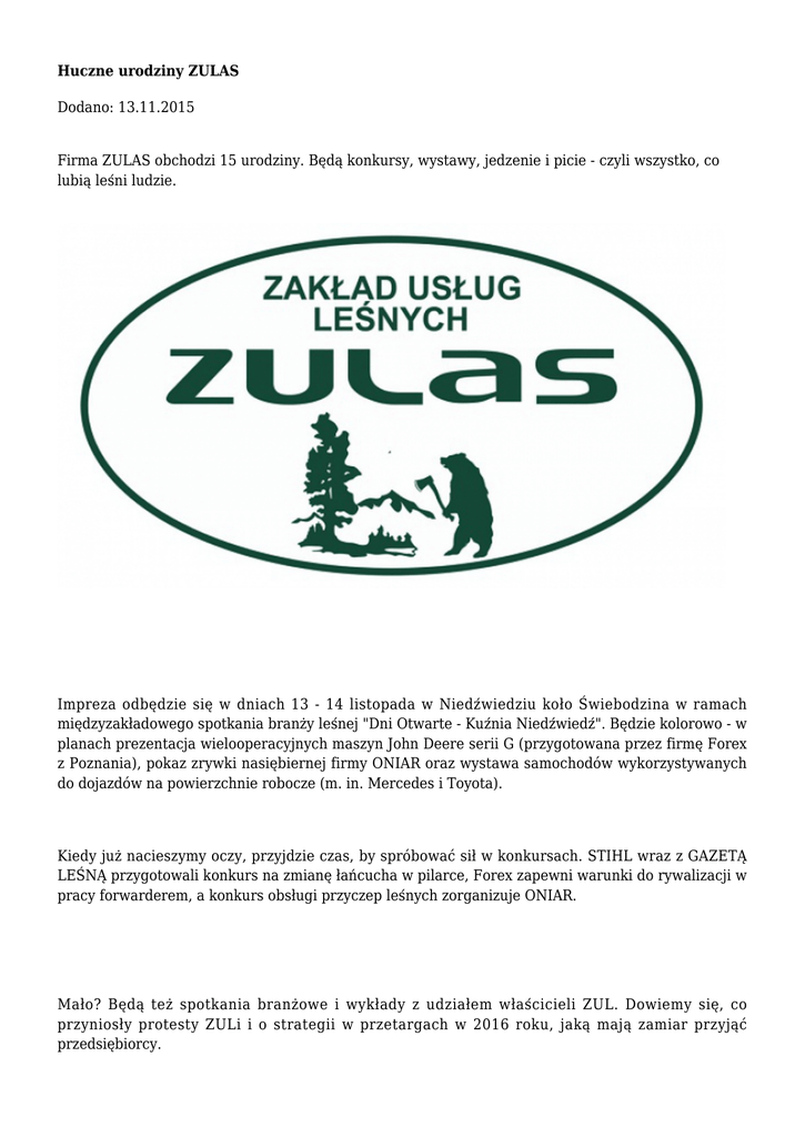 Huczne urodziny ZULAS Dodano: 13.11.2015 Firma ZULAS obchodzi 15 urodziny. Będą konkursy, wystawy, jedzenie i picie - czyli wszystko, co lubią leśni ludzie. Impreza odbędzie się w dniach 13 - 14 listopada w Niedźwiedziu koło Świebodzina w ramach międzyzakładowego spotkania branży leśnej "Dni Otwarte - Kuźnia Niedźwiedź". Będzie kolorowo - w planach prezentacja wielooperacyjnych maszyn John Deere serii G (przygotowana przez firmę Forex z Poznania), pokaz zrywki nasiębiernej firmy ONIAR oraz wystawa samochodów wykorzystywanych do dojazdów na powierzchnie robocze (m. in. Mercedes i Toyota). Kiedy już nacieszymy oczy, przyjdzie czas, by spróbować sił w konkursach. STIHL wraz z GAZETĄ LEŚNĄ przygotowali konkurs na zmianę łańcucha w pilarce, Forex zapewni warunki do rywalizacji w pracy forwarderem, a konkurs obsługi przyczep leśnych zorganizuje ONIAR. Mało? Będą też spotkania branżowe i wykłady z udziałem właścicieli ZUL. Dowiemy się, co przyniosły protesty ZULi i o strategii w przetargach w 2016 roku, jaką mają zamiar przyjąć przedsiębiorcy. Na sam koniec, drugiego dnia odbędzie się wielka feta z muzyką na żywo. To z okazji wspomnianego piętnastolecia firmy ZULAS - wręczone zostaną wyróżnienia dla pracowników z najdłuższym stażem, a także dla tych najbardziej zasłużonych dla leśnictwa zielonogórskiego. Współorganizatorem "Dni Otwartych - Kuźnia Niedźwiedź" jest GAZETA LEŚNA, która wraz z portalem FIRMYLESNE.pl objęła patronat medialny nad wydarzeniem. Szczegóły imprezy znaleźć można na stronie ZULAS oraz na zawodydrwali.pl. Do wglądu również zaproszenie z kompletnym planem wydarzenia. Komentarze (0) Nie dodano jeszcze żadnego komentarza.