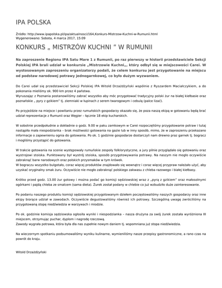 IPA POLSKA Źródło: http://www.ipapolska.pl/ipa/aktualnosci/164,Konkurs-Mistrzow-Kuchni-w-Rumunii.html Wygenerowano: Sobota, 4 marca 2017, 15:09 KONKURS „ MISTRZÓW KUCHNI ” W RUMUNII Na zaproszenie Regionu IPA Satu Mare 1 z Rumunii, po raz pierwszy w historii przedstawiciele Sekcji Polskiej IPA brali udział w konkursie „Mistrzowie Kuchni„, który odbył się w miejscowości Carei. W wystosowanym zaproszeniu organizatorzy podali, że celem konkursu jest przygotowanie na miejscu od podstaw narodowej potrawy jednogarnkowej, co było dużym wyzwaniem. Do Carei udał się przedstawiciel Sekcji Polskiej IPA Witold Drzażdżyński wspólnie z Ryszardem Maciałczykiem, a do pokonania mieliśmy ok. 900 km przez 4 państwa. Wyruszając z Poznania postanowiliśmy zabrać wszystko aby móc przygotować tradycyjny polski żur na białej kiełbasie oraz poznańskie „ pyry z gzikiem” tj. ziemniaki w łupinach z serem twarogowym i cebulą (palce lizać). Po przyjeździe na miejsce i powitaniu przez rumuńskich gospodarzy okazało się, że poza naszą ekipą w gotowaniu będą brać udział reprezentacje z Rumunii oraz Węgier – łącznie 18 ekip kucharskich. W sobotnie przedpołudnie a dokładnie o godz. 9.00 w paku zamkowym w Carei rozpoczęliśmy przygotowanie potraw i tutaj nastąpiła mała niespodzianka – brak możliwości gotowania na gazie lub w inny sposób, mimo, że w zaproszeniu przekazano informacje o zapewnieniu ognia do gotowania. Po ok. 1 godzinie gospodarze dostarczyli nam drewno praz garnek tj. bogracz i mogliśmy przystąpić do gotowania. W trakcie gotowania na scenie występowały rumuńskie zespoły folklorystyczne, a jury pilnie przyglądało się gotowaniu oraz wystrojowi stoiska. Punktowany był wystrój stoiska, sposób przygotowywania potrawy. Na naszym nie mogło oczywiście zabraknąć barw narodowych oraz polskich przysmaków w tym krówek. W bograczu wszystko bulgotało, coraz więcej produktów znajdowało się wewnątrz i coraz więcej przypraw należało użyć, aby uzyskać oryginalny smak żuru. Oczywiście nie mogło zabraknąć polskiego zakwasu z chleba razowego i białej kiełbasy. Krótko przed godz. 13.00 żur gotowy i można podać go komisji sędziowskiej wraz z „pyrą z gzikiem” oraz małosolnymi ogórkami i pajdą chleba ze smalcem (sama dieta). Żurek został podany w chlebie co już wzbudziło duże zainteresowanie. Po podaniu naszego produktu komisji sędziowskiej przygotowanym dziełem poczęstowaliśmy naszych gospodarzy oraz inne ekipy biorące udział w zawodach. Oczywiście degustowaliśmy również ich potrawy. Szczególną uwagę zwróciliśmy na przygotowaną stopę niedźwiedzia w warzywach i miodzie. Po ok. godzinie komisja sędziowska ogłosiła wyniki i niespodzianka – nasza drużyna za swój żurek została wyróżniona III miejscem, otrzymując puchar, dyplom i nagrodę rzeczową. Zawody wygrała potrawa, która była dla nas zupełnie nowym daniem tj. wspomniana już stopa niedźwiedzia. Na wieczornym spotkaniu podsumowaliśmy wyniku kulinarne, wymieniliśmy nasze przepisy gastronomiczne, a rano czas na powrót do kraju. Witold Drzażdżyński Ocena: 5/5 (1) Tweetnij IPA Rumunia, IPA Poznań