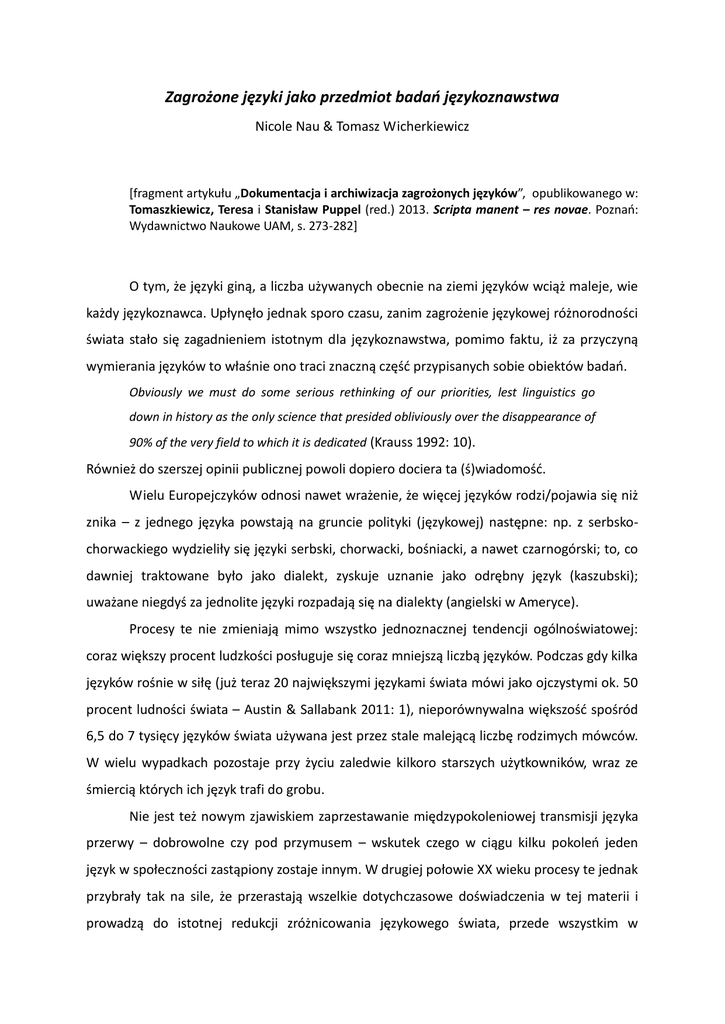 Zagrożone języki jako przedmiot badań językoznawstwa Nicole Nau & Tomasz Wicherkiewicz [fragment artykułu „Dokumentacja i archiwizacja zagrożonych języków”, opublikowanego w: Tomaszkiewicz, Teresa i Stanisław Puppel (red.) 2013. Scripta manent – res novae. Poznań: Wydawnictwo Naukowe UAM, s. 273-282] O tym, że języki giną, a liczba używanych obecnie na ziemi języków wciąż maleje, wie każdy językoznawca. Upłynęło jednak sporo czasu, zanim zagrożenie językowej różnorodności świata stało się zagadnieniem istotnym dla językoznawstwa, pomimo faktu, iż za przyczyną wymierania języków to właśnie ono traci znaczną część przypisanych sobie obiektów badań. Obviously we must do some serious rethinking of our priorities, lest linguistics go down in history as the only science that presided obliviously over the disappearance of 90% of the very field to which it is dedicated (Krauss 1992: 10). Również do szerszej opinii publicznej powoli dopiero dociera ta (ś)wiadomość. Wielu Europejczyków odnosi nawet wrażenie, że więcej języków rodzi/pojawia się niż znika – z jednego języka powstają na gruncie polityki (językowej) następne: np. z serbskochorwackiego wydzieliły się języki serbski, chorwacki, bośniacki, a nawet czarnogórski; to, co dawniej traktowane było jako dialekt, zyskuje uznanie jako odrębny język (kaszubski); uważane niegdyś za jednolite języki rozpadają się na dialekty (angielski w Ameryce). Procesy te nie zmieniają mimo wszystko jednoznacznej tendencji ogólnoświatowej: coraz większy procent ludzkości posługuje się coraz mniejszą liczbą języków. Podczas gdy kilka języków rośnie w siłę (już teraz 20 największymi językami świata mówi jako ojczystymi ok. 50 procent ludności świata – Austin & Sallabank 2011: 1), nieporównywalna większość spośród 6,5 do 7 tysięcy języków świata używana jest przez stale malejącą liczbę rodzimych mówców. W wielu wypadkach pozostaje przy życiu zaledwie kilkoro starszych użytkowników, wraz ze śmiercią których ich język trafi do grobu. Nie jest też nowym zjawiskiem zaprzestawanie międzypokoleniowej transmisji języka przerwy – dobrowolne czy pod przymusem – wskutek czego w ciągu kilku pokoleń jeden język w społeczności zastąpiony zostaje innym. W drugiej połowie XX wieku procesy te jednak przybrały tak na sile, że przerastają wszelkie dotychczasowe doświadczenia w tej materii i prowadzą do istotnej redukcji zróżnicowania językowego świata, przede wszystkim w dotychczas tak bogatych regionach, jak Pacyfik, obie Ameryki czy środkowa Afryka. W Europie tendencja ta przybrała zarazem formę (zwłaszcza w latach 1950–1970) zanikania dialektów i wymierania języków mniejszościowych. Procesy te znajdywały wsparcie w ideologii, wedle której 1) język stanowi jedynie narzędzie komunikacji, które najlepiej funkcjonuje, gdy przez wszystkich używany jest w ten sam sposób, (2) funkcja tworzenia/wzmacniania tożsamości przynależy jedynie językom narodowym (wg równania język = naród = państwo), a (3) tożsamość regionalna lub grupowa jest nieistotna, a wręcz niepożądana. Równolegle w ówczesnym językoznawstwie panował powszechny brak zainteresowania zróżnicowaniem języków i językami „egzotycznymi”. Zakres badań najbardziej wpływowych ośrodków lingwistycznych w Stanach Zjednoczonych i Europie Zachodniej wyznaczano na podstawie kilku dobrze znanych języków (zazwyczaj rodzimych języków samych badaczy). Dotyczyło to paradoksalnie nawet takich zagadnień, jak uniwersalia językowe, czyli cech wspólnych wszystkim językom. Dopiero w latach 1980-tych nastawienie to uległo zmianie – zarówno w językoznawstwie, jak i w wielu zachodnich społeczeństwach. W niektórych europejskich państwach postrzegać zaczęto dialekty i języki regionalne nie jako zagrożenie dla narodowej kultury i tożsamości, lecz jako ubogacenie. Języki mniejszości coraz częściej zyskiwały oficjalne uznanie i wsparcie, nie tylko w bogatych krajach przemysłowych, ale i w państwach takich, jak Boliwia, Namibia czy Nepal. W przypadku wielu języków i dialektów wsparcie to nadeszło jednak zbyt późno. Wymieranie języków (śmierć języka) badać zaczęto z perspektywy socjolingwistycznej. Już w roku 1977 International Journal of the Sociology of Language poświęcił temu zagadnieniu cały numer (Dressler 1977). Kolejne studia badały poszczególne przypadki, w jakich zachodził ten proces (znane stały się zwłaszcza publikacje: Dorian 1981, Schmidt 1985 czy też tom zbiorowy Dorian 1989). Zachowanie i rewitalizacja języków stały się też ważkimi dziedzinami polityki językowej i planowania językowego (Fishman 1991, a z nowszych publikacji np. Grenoble, Lindsay 2006; Tsunoda 2005). W latach 1990-tych problematyka niebezpieczeństwa, przed jakim stoi różnorodność języków świata, przekroczyła granice socjolingwistyki, stając w centrum zainteresowań badawczych językoznawstwa. Świadczy o tym mnogość nowszych publikacji skupiających się wokół tematyki wymierania języków w skali światowej (np. Crystal 2000; Evans 2010; Harrison 2007; Nettle & Romaine 2000). Na zlecenie UNESCO powstał i udostępniony został w Internecie Atlas of the World’s Languages in Danger (Moseley 2009). Osiągnięcia i aktualne rezultaty badań nad zagrożonymi językami zawiera The Cambridge handbook of endangered languages (Austin & Sallabank 2011). W sytuacji nieuniknionego wymierania znacznej liczby języków – szczególnie takich, które są prawie nieznane poza wspólnotami komunikatywnymi swoich użytkowników – palącym zadaniem językoznawców staje się przynajmniej tych języków (u)dokumentowanie, dopóki to jest jeszcze w ogóle możliwe. Od lat 1990-tych uruchamiane są i prowadzone w wielu krajach świata rozmaite programy dokumentacji i archiwizowania zasobów zagrożonych języków (przegląd