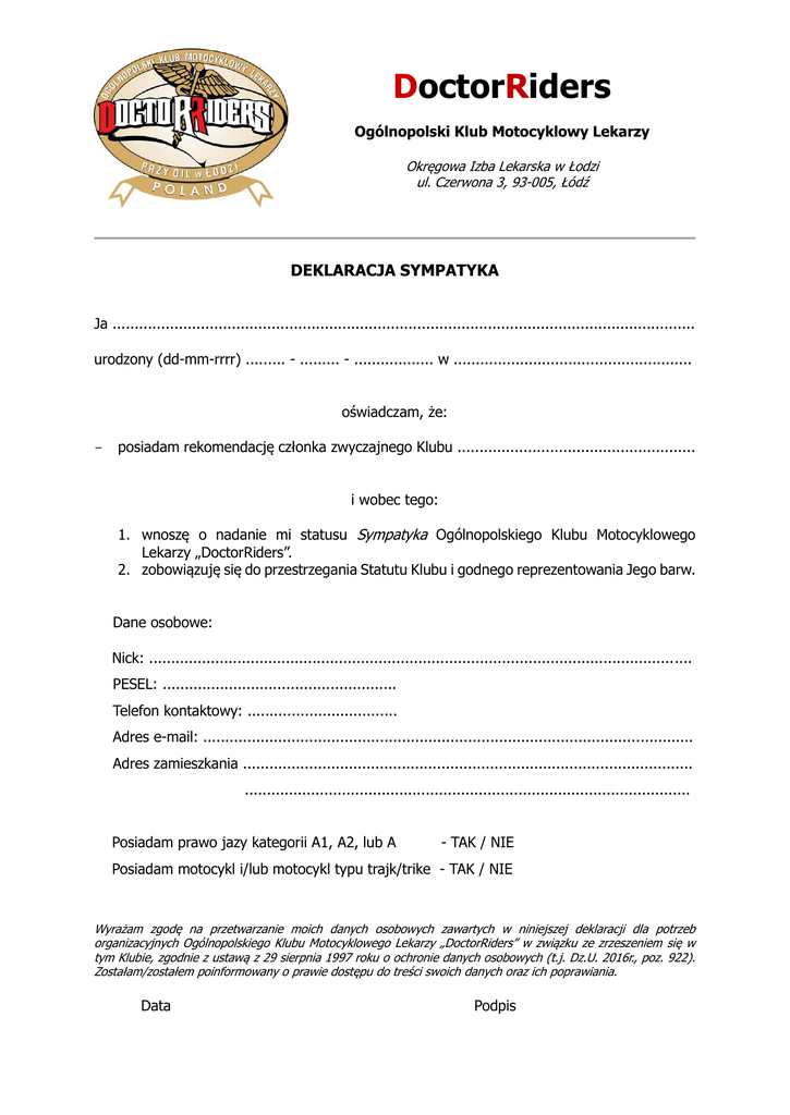 DoctorRiders Ogólnopolski Klub Motocyklowy Lekarzy Okręgowa Izba Lekarska w Łodzi ul. Czerwona 3, 93-005, Łódź DEKLARACJA SYMPATYKA Ja .................................................................................................................................... urodzony (dd-mm-rrrr) ......... - ......... - .................. w ...................................................... oświadczam, że: - posiadam rekomendację członka zwyczajnego Klubu ...................................................... i wobec tego: 1. wnoszę o nadanie mi statusu Sympatyka Ogólnopolskiego Klubu Motocyklowego Lekarzy „DoctorRiders”. 2. zobowiązuję się do przestrzegania Statutu Klubu i godnego reprezentowania Jego barw. Dane osobowe: Nick: ........................................................................................................................... PESEL: ..................................................... Telefon kontaktowy: .................................. Adres e-mail: ............................................................................................................... Adres zamieszkania ...................................................................................................... ..................................................................................................... Posiadam prawo jazy kategorii A1, A2, lub A - TAK / NIE Posiadam motocykl i/lub motocykl typu trajk/trike - TAK / NIE Wyrażam zgodę na przetwarzanie moich danych osobowych zawartych w niniejszej deklaracji dla potrzeb organizacyjnych Ogólnopolskiego Klubu Motocyklowego Lekarzy „DoctorRiders” w związku ze zrzeszeniem się w tym Klubie, zgodnie z ustawą z 29 sierpnia 1997 roku o ochronie danych osobowych (t.j. Dz.U. 2016r., poz. 922). Zostałam/zostałem poinformowany o prawie dostępu do treści swoich danych oraz ich poprawiania. Data Podpis
