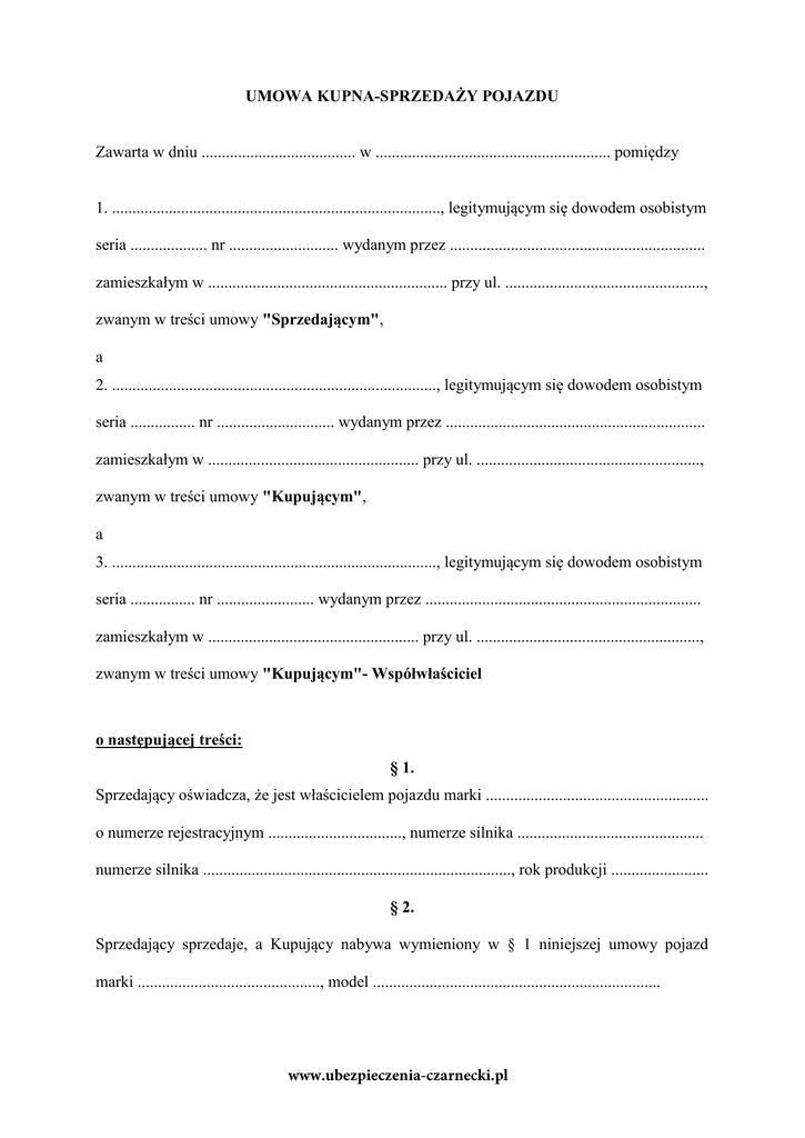 UMOWA KUPNA-SPRZEDAŻY POJAZDU Zawarta w dniu ...................................... w .......................................................... pomiędzy 1. ................................................................................., legitymującym się dowodem osobistym seria ................... nr ........................... wydanym przez ............................................................... zamieszkałym w ........................................................... przy ul. ................................................., zwanym w treści umowy "Sprzedającym", a 2. ................................................................................, legitymującym się dowodem osobistym seria ................ nr ............................. wydanym przez ................................................................ zamieszkałym w .................................................... przy ul. ......................................................., zwanym w treści umowy "Kupującym", a 3. ................................................................................, legitymującym się dowodem osobistym seria ................ nr ........................ wydanym przez .................................................................... zamieszkałym w .................................................... przy ul. ......................................................., zwanym w treści umowy "Kupującym"- Współwłaściciel o następującej treści: § 1. Sprzedający oświadcza, że jest właścicielem pojazdu marki ....................................................... o numerze rejestracyjnym ................................., numerze silnika .............................................. numerze silnika ............................................................................, rok produkcji ........................ § 2. Sprzedający sprzedaje, a Kupujący nabywa wymieniony w § 1 niniejszej umowy pojazd marki ............................................., model ....................................................................... www.ubezpieczenia-czarnecki.pl § 3. Kupujący tytułem ceny za przedmiotowy pojazd zapłaci Sprzedającemu kwotę ........................ zł (słownie: ................................................................................................................... złotych), płatną gotówką w chwili wydania pojazdu. § 4. Wydanie przedmiotu sprzedaży nastąpi w ................................................................................... § 5. Kupujący oświadcza, że znany mu jest stan techniczny pojazdu określonego w§ 1 niniejszej umowy i oświadcza ponadto, iż z tego tytułu nie będzie rościł żadnych pretensji do Sprzedającego. Kupujący sprawdził także oznaczenia numerowe pojazdu i dowodu rejestracyjnego, nie wnosząc do nich żadnych zastrzeżeń. § 6. Wszelkie koszty związane z realizacją postanowień niniejszej umowy, w tym także koszty uiszczenia opłaty skarbowej, obciążają ........................................................................................ § 7. Wszelkie zmiany umowy wymagają formy pisemnej, pod rygorem nieważności. § 8. W sprawach nie uregulowanych niniejszą umową stosuje się odpowiednie przepisy kodeksu cywilnego. § 9. Umowę sporządzono w ........... jednobrzmiących egzemplarzach, po ......... dla każdej ze stron. Kupujący Sprzedawca ..................................... .................................... www.ubezpieczenia-czarnecki.pl