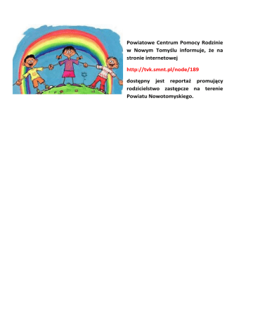 Powiatowe Centrum Pomocy Rodzinie w Nowym Tomyślu informuje, że na stronie internetowej http://tvk.smnt.pl/node/189 dostępny jest reportaż promujący rodzicielstwo zastępcze na terenie Powiatu Nowotomyskiego.