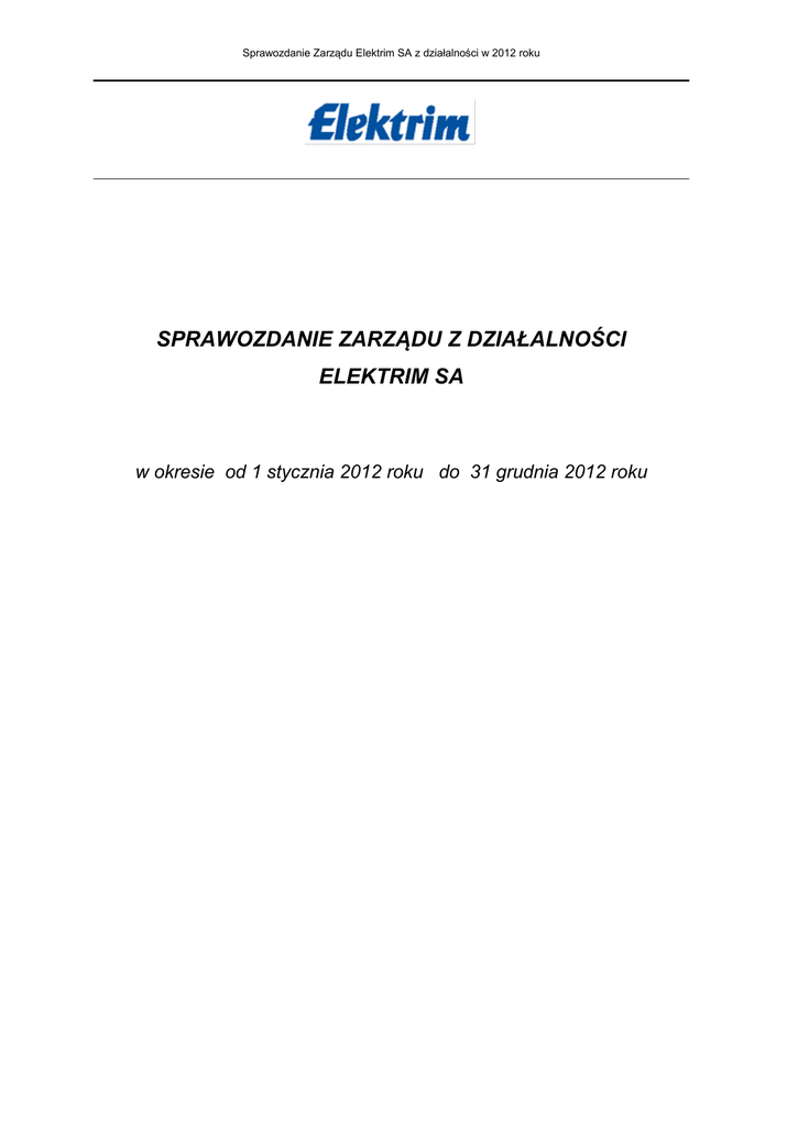 Sprawozdanie Zarządu Elektrim SA z działalności w 2012 roku SPRAWOZDANIE ZARZĄDU Z DZIAŁALNOŚCI ELEKTRIM SA w okresie od 1 stycznia 2012 roku do 31 grudnia 2012 roku Sprawozdanie Zarządu Elektrim SA z działalności w 2012 roku 1 Wprowadzenie 1.1 Informacje podstawowe o Spółce Nazwa spółki: Adres: Numer identyfikacji podatkowej: Numer statystyczny: Elektrim SA ul. Pańska 77/79, 00-834 Warszawa NIP: 526 020 77 46 REGON: 000144058 Spółka zarejestrowana jest w Sądzie Rejonowym dla m. st. Warszawy w Warszawie, XII Wydział Gospodarczy Krajowego Rejestru Sądowego pod numerem KRS 0000039329. 1.2 Działalność Spółki Działalność Elektrim SA opiera się na Statucie Spółki – tekst jednolity Statutu uwzględniający zmiany uchwalone przez Walne Zgromadzenia w dniach 04.04.2003r., 30.06.2009r. i 24.06.2010r. - został ustalony przez Radę Nadzorczą i zatwierdzony uchwałą Rady Nadzorczej w dniu 24 maja 2012 roku. Przedmiotem działalności statutowej Spółki jest: wytwarzanie energii elektrycznej przesyłanie energii elektrycznej dystrybucja energii elektrycznej telefonia stacjonarna i telegrafia telefonia ruchoma transmisja danych i teleinformatyka radiotelekomunikacja telewizja kablowa pozostałe usługi telekomunikacyjne pozostałe formy udzielania kredytów pozostałe pośrednictwo finansowe, gdzie indziej nie sklasyfikowane działalność pomocnicza związana z ubezpieczeniami i funduszami emerytalno rentowymi zagospodarowanie i sprzedaż nieruchomości na własny rachunek kupno i sprzedaż nieruchomości na własny rachunek działalność w zakresie oprogramowania pozostała działalność związana z informatyką badanie rynku i opinii publicznej działalność związana z zarządzaniem holdingami. Kluczowymi elementami strategii Elektrim SA jest działalność w sektorach energetycznym, nieruchomości i telekomunikacyjnym. 1.3 Zarys historyczny Spółki Elektrim to jedno z najstarszych przedsiębiorstw handlu zagranicznego w Polsce. Powstał w dniu 16 listopada 1945 roku jako spółka z ograniczoną odpowiedzialnością pod nazwą Polskie Towarzystwo Handlu Zagranicznego dla Elektrotechniki „Elektrim”. W 1990 roku Zgromadzenie Wspólników Spółki zadecydowało o przekształceniu Elektrimu w spółkę akcyjną. W dniu 5 października 1990 roku Spółka została zarejestrowana w Rejestrze Handlowym Sądu Rejonowego dla m.st. Warszawy, a właścicielem wszystkich akcji stał się Skarb Państwa. Na podstawie decyzji Ministra Współpracy Gospodarczej z Zagranicą z dnia 25 września 1991 roku rozpoczęto proces prywatyzacji Elektrimu. Elektrim był pierwszym przedsiębiorstwem handlu zagranicznego prywatyzowanym w warunkach istnienia giełdy i rynku papierów wartościowych. 1 Sprawozdanie Zarządu Elektrim SA z działalności w 2012 roku Akcje Elektrimu były notowane na Giełdzie Papierów Wartościowych w Warszawie SA od 1991 roku. Wykluczenie akcji Spółki z obrotu na Giełdzie Papierów Wartościowych w Warszawie SA nastąpiło w dniu 21 stycznia 2008 roku na podstawie uchwały Giełdy Papierów Wartościowych w Warszawie SA z dnia 5 listopada 2007 roku. Elektrim SA pozostał spółką publiczną w rozumieniu ustawy o ofercie publicznej i warunkach wprowadzania instrumentów finansowych do zorganizowanego systemu obrotu oraz o spółkach publicznych. W sierpniu 2007 roku Sąd Rejonowy dla miasta stołecznego Warszawy w Warszawie, X Wydział Gospodarczy dla spraw upadłościowych i naprawczych, na wniosek Zarządu Elektrim SA, kierującego się koniecznością sprawiedliwego zaspokojenia wierzycieli, wydał postanowienie o ogłoszeniu upadłości Elektrim SA z możliwością zawarcia układu. W dniu 17 grudnia 2010 roku, wskutek wniosków wierzycieli, Sąd Rejonowy dla m.st. Warszawy w Warszawie, Sąd Gospodarczy, X Wydział Gospodarczy dla spraw upadłościowych i naprawczych umorzył postępowanie upadłościowe Spółki. Stwierdzenie prawomocności w/w postanowienia nastąpiło w dniu 10 stycznia 2011 roku. W konsekwencji umorzenia postępowania upadłościowego Elektrim SA Zarząd Spółki odzyskał, zgodnie z przepisami prawa upadłościowego i naprawczego, prawo zarządzania majątkiem Elektrim SA oraz rozporządzania jego składnikami. Umorzenie postępowania upadłościowego było możliwe, w szczególności wskutek zawarcia w grudniu 2010 roku Ugody, która zakończyła ponad dziesięcioletni spór dotyczący praw udziałowych w Polskiej Telefonii Cyfrowej. Ugodę podpisały w szczególności Vivendi oraz jej podmioty zależne, Deutsche Telekom wraz ze swoimi podmiotami zależnymi, The Law Debenture Trust Corporation p.l.c. - Powiernik Obligacji, Skarb Państwa Rzeczpospolitej Polskiej oraz Elektrim wraz z podmiotami z grupy Elektrim. Spór o 48% udziałów w PTC był jednym z największych, najdłuższych i najbardziej skomplikowanych sporów prawnych w Europie. W jego wyniku prowadzonych było kilkadziesiąt spraw sądowych i arbitrażowych, toczących się równolegle w kilku jurysdykcjach (polskiej, austriackiej, szwajcarskiej, angielskiej i amerykańskiej), przed sądami wszystkich instancji, w tym najwyższymi instancjami sądowymi Polski, Austrii i Wielkiej Brytanii. W efekcie Ugody, Vivendi wycofało swoje roszczenia dotyczące PTC, grupa Deutsche Telekom została jedynym właścicielem operatora Ery, a Elektrim spłacił swoich wierzycieli, w tym w szczególności Skarb Państwa, obligatariuszy oraz Vivendi. Wskutek Ugody Elektrim zbył posiadane przez siebie udziały w Elektrim Telekomunikacja Sp. z o.o. oraz Carcom Warszawa Sp. z o.o.. Ugoda umożliwiła także umorzenie, na zgodny wniosek właściwych stron, postępowań sądowych, dotyczących udziałów Polskiej Telefonii Cyfrowej Sp. z o.o. lub ze sporem tym związanych. Od 2011 roku w Spółce prowadzony jest proces restrukturyzacyjny, mający na celu uporządkowanie aktywów Spółki. 2. Struktura akcjonariatu Kapitał akcyjny Spółki wynosi 83 770 297 PLN i dzieli się 83 770 