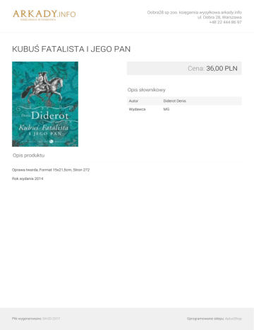 Dobra28 sp zoo. księgarnia wysyłkowa arkady.info ul. Dobra 28, Warszawa +48 22 444 86 97 KUBUŚ FATALISTA I JEGO PAN Cena: 36,00 PLN Opis słownikowy Autor Diderot Denis Wydawca MG Opis produktu Oprawa twarda, Format 15x21,5cm, Stron 272 Rok wydania 2014 Plik wygenerowano: 04-03-2017 Powered by TCPDF (www.tcpdf.org) Oprogramowanie sklepu: AptusShop