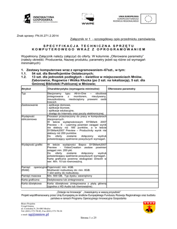 Znak sprawy: FN.IX.271.2.2014 Załącznik nr 1 - szczegółowy opis przedmiotu zamówienia SPECYFIKACJA TECHNICZNA SPRZĘTU KOMPUTEROWEGO WRAZ Z OPROGRAMOWANIEM Wypełniony Załącznik należy załączyć do oferty. W kolumnie „Oferowane parametry” (należy określić: Producenta, Nazwę produktu, parametry jeżeli są różne od wymagań minimalnych) 1. Zestawy komputerowe wraz z oprogramowaniem–67szt., w tym: 1.1. 54 szt. dla Beneficjentów Ostatecznych; 1.2. 13 szt. dla jednostek podległych – świetlice w miejscowościach Mniów, Zaborowice, Rogowice i Wólka Kłucka (po 2 szt. na lokalizację), 5 szt. dla Gminnej Biblioteki Publicznej w Mniowie; Atrybut Charakterystyka (wymagania minimalne) Typ Stacjonarny typu All-in-One – obudowa zintegrowana z monitorem, nieużywany, nieuszkodzony, nieobciążony prawami osób trzecich - aplikacje domowe, - aplikacje biurowe, - aplikacje edukacyjne, - dostęp do Internetu oraz poczty elektronicznej. Procesor przeznaczony do pracy w komputerach stacjonarnych. W teście wydajnościowym SYSMark 2007 Preview – E - Learning powinien osiągać wynik nie słabszy niż 185 punktów, a w teście SYSMark2007 Preview – Productivity wynik nie słabszy niż 200 punktów. Do oferty zostanie dołączony wydruk potwierdzający spełnienie powyższych wymagań. Zastosowanie Wydajność obliczeniowa Wydajność grafiki Oferowane parametry W teście wydajności Bapco SYSMark2007 Preview - VideoCreation zestaw powinien osiągać min. 200 pkt. Do oferty zostanie dołączony wydruk potwierdzający spełnienie powyższych wymagań. Karta graficzna powinna obsługiwać DirectX w wer. Min. 10 lub równoważną. Pamięć (RAM) operacyjna Pojemność: min. 4GB. Możliwość rozbudowy do: min. 8GB. 1 slot wolny do rozbudowy. Pamięć masowa Min. 500 GB, Typ dysku: wewnętrzny Karta graficzna Dedykowana lub zintegrowana Karta dźwiękowa Karta dźwiękowa zintegrowana z płytą główną (zgodna z HD Audio lub równoważne). ,,Dotacje na Innowacje” ,,Inwestujemy w waszą przyszłość” Projekt współfinansowany przez Unię Europejską ze środków Europejskiego Funduszu Rozwoju Regionalnego oraz budżetu państwa w ramach Programu Operacyjnego Innowacyjna Gospodarka _______________________________________________________________________________________________________ Biuro Projektu Urząd Gminy ul. Centralna 9, 26-080 Mniów Tel. (041) 373-70-02, Fax (041) 373-70-24 e-mail: [email protected] Strona 1 z 25 Karta sieciowa Porty - zintegrowana; - 10/100/1000 Mbps; - Wi-Fi 802.11 b/g/n. min. 6 x USB w tym min. 2 x USB 3.0, port sieciowy RJ-45. Porty audio: 1 szt (wyjście liniowe), 2 szt. (wyjście na słuchawki, wejście na mikrofon). Czytnik kart multimedialnych 8-in-1 min.: Secure Digital (SD), Secure Digital Input Output (SDIO), MultiMediaCard (MMC), Memory Stick Memory Stick PRO, xD-Picture Card, HiSpeed-SD, Hi Capacity-SD. Uwaga: Wymagana ilość i rozmieszczenie (na zewnątrz obudowy komputera) np. portów USB nie może być osiągnięta w wyniku stosowania konwerterów, przejściówek itp. Klawiatura Obudowa Klawiaturę USB w układzie QWERTY obsługującą standard polski programisty. Mysz optyczną USB z trzema klawiszami oraz rolką (scroll). Nagrywarka DVD obsługująca płyty zarówno DVD-R, jak i DVD+R, możliwość nagrywania płyt dwuwarstwowych, dodane oprogramowanie umożliwiające nagrywanie płyt i odczytywanie płyt DVD. Typu All-in-One z ekranem o przekątnej min 20” Wbudowany ekran 1. Typ ekranu: LED. Mysz Napęd optyczny 2. Przekątna wyświetlacza: min. 20”. 3. Rozdzielczość: min. 1600x900. 4. Czas reakcji: max. 5ms. 5. Jasność: Min. 250 cd/m2. 6. Kontrast: Min. 1000:1. Zasilacz System operacyjny 7. Certyfikaty: Monitor posiada certyfikat TCO 03 bądź wyższy, lub równoważny. Dopuszczalne jest posiadanie certyfikatu równoważnego do TCO 03. Monitor wyprodukowany zgodnie z wymaganiami normy ISO 9001 lub równoważnej. Monitor wyprodukowany zgodnie z wymaganiami normy ISO 14001 lub równoważnej. Monitor powinien być opatrzony znakiem CE. Zasilacz: dobrany do mocy pobieranej przez komputer oraz podłączone poprzez porty urządzeń System operacyjny klasy PC fabrycznie przeinstalowany przez producenta oferowanego ,,Dotacje na Innowacje” ,,Inwestujemy w waszą przyszłość” Projekt współfinansowany przez Unię Europejską ze środków Europejskiego Funduszu Rozwoju Regionalnego oraz budżetu państwa w ramach Programu Operacyjnego Innowacyjna Gospodarka _______________________________________________________________________________________________________ Biuro Projektu Urząd Gminy ul. Centralna 9, 26-080 Mniów Tel. (041) 373-70-02, Fax (041) 373-70-24 e-mail: [email protected] Strona 2 z 25 komputera w polskiej wersji językowej w wersji 64-bitowej. System musi spełniać następujące wymagania poprzez natywne dla niego mechanizmy, bez użycia aplikacji wspomagających: 1. Zainstalowany oraz (jeżeli producent oprogramowania tego wymaga) aktywowany system operacyjny. 2. Możliwość dokonywania aktualizacji i poprawek systemu przez Internet z możliwością wyboru instalowanych poprawek, 3. Dołączony nośnik z oprogramowaniem umożliwiający szybkie przywrócenie fabrycznie przeinstalowanego systemu operacyjnego 4. Możliwość dokonywania uaktualnień sterowników urządzeń przez Internet - witrynę producenta systemu, 5. Darmowe aktualizacje w ramach systemu operacyjnego przez Internet (niezbędne aktualizacje, poprawki, biuletyny bezpieczeństwa muszą być dostarczone bez dodatkowych opłat) – wymagane podanie adresu strony WWW, 6. Internetowa aktualizacja zapewniona w języku polskim, 7. Wbudowana zapora internetowa (firewall) dla ochrony połączeń internetowych; zintegrowana z systemem konsola do zarządzania ustawieniami zapory i regułami IP v4 i v6 lub równoważne; 8. Zlokalizowane w języku polskim, co najmniej następujące elementy: menu, odtwarzacz multimediów, pomoc, komunikaty systemowe; 9.