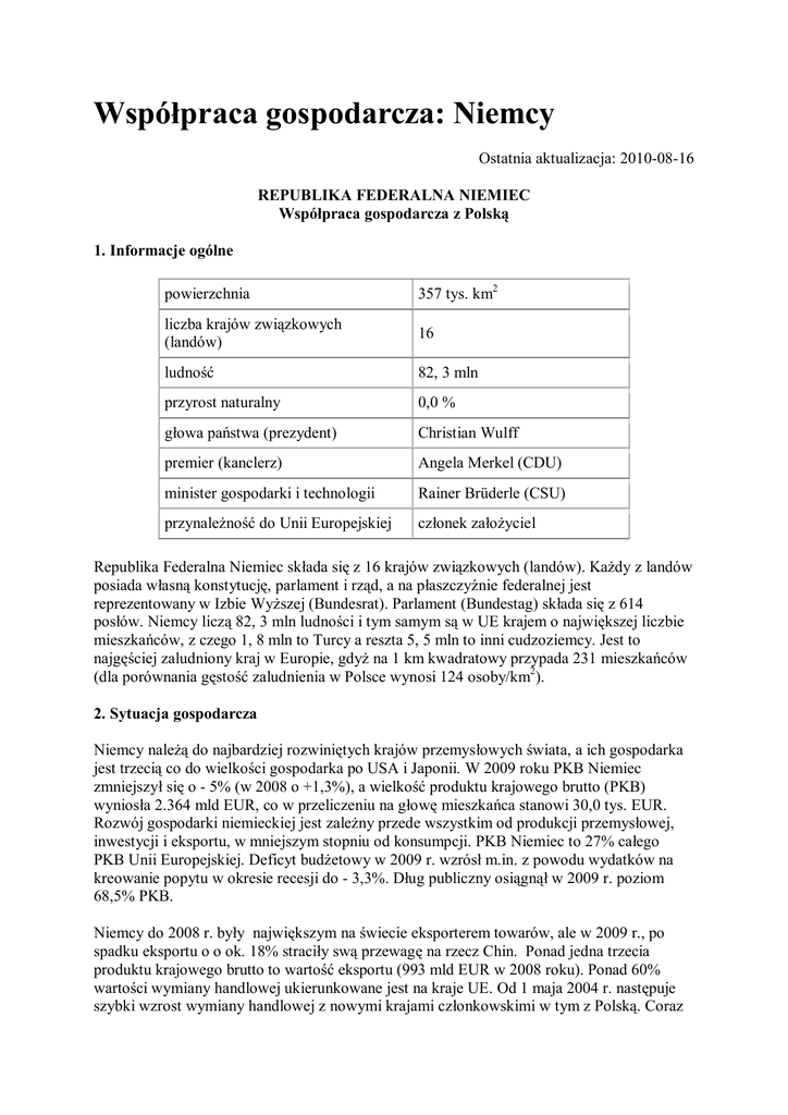 Współpraca gospodarcza: Niemcy Ostatnia aktualizacja: 2010-08-16 REPUBLIKA FEDERALNA NIEMIEC Współpraca gospodarcza z Polską 1. Informacje ogólne powierzchnia 357 tys. km2 liczba krajów związkowych (landów) 16 ludność 82, 3 mln przyrost naturalny 0,0 % głowa państwa (prezydent) Christian Wulff premier (kanclerz) Angela Merkel (CDU) minister gospodarki i technologii Rainer Brüderle (CSU) przynależność do Unii Europejskiej członek założyciel Republika Federalna Niemiec składa się z 16 krajów związkowych (landów). Każdy z landów posiada własną konstytucję, parlament i rząd, a na płaszczyźnie federalnej jest reprezentowany w Izbie Wyższej (Bundesrat). Parlament (Bundestag) składa się z 614 posłów. Niemcy liczą 82, 3 mln ludności i tym samym są w UE krajem o największej liczbie mieszkańców, z czego 1, 8 mln to Turcy a reszta 5, 5 mln to inni cudzoziemcy. Jest to najgęściej zaludniony kraj w Europie, gdyż na 1 km kwadratowy przypada 231 mieszkańców (dla porównania gęstość zaludnienia w Polsce wynosi 124 osoby/km2). 2. Sytuacja gospodarcza Niemcy należą do najbardziej rozwiniętych krajów przemysłowych świata, a ich gospodarka jest trzecią co do wielkości gospodarka po USA i Japonii. W 2009 roku PKB Niemiec zmniejszył się o - 5% (w 2008 o +1,3%), a wielkość produktu krajowego brutto (PKB) wyniosła 2.364 mld EUR, co w przeliczeniu na głowę mieszkańca stanowi 30,0 tys. EUR. Rozwój gospodarki niemieckiej jest zależny przede wszystkim od produkcji przemysłowej, inwestycji i eksportu, w mniejszym stopniu od konsumpcji. PKB Niemiec to 27% całego PKB Unii Europejskiej. Deficyt budżetowy w 2009 r. wzrósł m.in. z powodu wydatków na kreowanie popytu w okresie recesji do - 3,3%. Dług publiczny osiągnął w 2009 r. poziom 68,5% PKB. Niemcy do 2008 r. były największym na świecie eksporterem towarów, ale w 2009 r., po spadku eksportu o o ok. 18% straciły swą przewagę na rzecz Chin. Ponad jedna trzecia produktu krajowego brutto to wartość eksportu (993 mld EUR w 2008 roku). Ponad 60% wartości wymiany handlowej ukierunkowane jest na kraje UE. Od 1 maja 2004 r. następuje szybki wzrost wymiany handlowej z nowymi krajami członkowskimi w tym z Polską. Coraz większego znaczenia nabierają stosunki handlowe i gospodarcze z tzw. wschodzącymi rynkami w Azji, jak Chiny i Indie. Na 2010 rok rząd niemiecki zakłada wzrost PKB o ok. 1,4% oraz wzrost deficytu budżetowego do - 5,3% poziom 2,2%. Podstawowe wskaźniki makroekonomiczne Wyszczególnienie PKB na 1 mieszkańca (w tys. €) 2006 2007 2008 28,5 29,5 30,3 2 2 423,0 2 489,0 PKB (w mld €) 302,7 PKB (dynamika w %) 2,9 2,5 1,3 Deficyt budżetowy (% PKB) -2,0 0,0 -0,5 Dług publiczny (% PKB) 67,8 65,3 63,0 Inflacja (w %) 1,7 2,2 1,7 Bezrobocie (w %) 10,8 8,3 8,2 883,8 969,0 992,7 + Eksport (w mld €) 2,8% 704,0 770,0 814,5 + Import (w mld €) 5,8% Bezpośrednie inwestycje zagraniczne (mld 25,1 b.d. x €) rocznie: narastająco: 688 Inwestycje bezpośrednie Niemiec za 63,3 b.d. x granicą (mld €) narastająco: 403 2009 30,0 2 364,0 -5,0 -3,3 68,5 0,8 7,8 813,4 18,2% 676,5 27,2% x x Źródło: Eurostat, Destatis 3. Ramy prawno-traktatowe współpracy gospodarczej Traktat Akcesyjny ze Wspólnotami Europejskimi i ich krajami członkowskimi, który wszedł w życie w dniu 1.05.2004 r. posiada podstawowe znaczenie dla całokształtu współpracy gospodarczej i wymiany handlowej między Polską a krajami Unii Europejskiej, w tym z RFN. Poza tym, szereg kwestii związanych ze współpracą gospodarczą regulują bilateralne umowy międzyrządowe, uzupełniające postanowienia Traktatu Europejskiego. Są to między innymi: Umowa o unikaniu podwójnego opodatkowania podatków od dochodu i od majątku (Dz.U. 2005 nr 12 poz. 90); Umowa w sprawie popierania i wzajemnej ochrony inwestycji (Dz.U. 1991 nr 27 poz. 116); Traktat o dobrym sąsiedztwie i przyjaznej współpracy z 17 czerwca 1991 r., który zawiera część gospodarczą odnoszącą się do współpracy Polski i RFN zarówno o charakterze ściśle dwustronnym, jak też wielostronnym (Dz.U. 1992 nr 14 poz. 54). 4. Polsko - niemieckie obroty towarowe W całym minionym 20-leciu RFN pozostawała pierwszym partnerem handlowym Polski. W 2009 r. obroty wyniosły 48,7 mld EUR (-21,4%), w tym 25,1 mld EUR polskiego eksportu (13,8%) i 23,5 mld importu (-28,2%). Udział Niemiec w polskim eksporcie ogółem sięga 26% i w imporcie 22%. Polska dla RFN jest 13. partnerem handlowym jako ich importer (2,8%) i 10. jako kraj, do którego Niemcy eksportują swoje towary (3,2%). W strukturze towarowej polskiego eksportu na rynek niemiecki dominują części i akcesoria do pojazdów samochodowych, meble, silniki spalinowe, pojazdy samochodowe, miedź rafinowana, druty, aparatura odbiorcza dla telewizji, konstrukcje do budowy mostów, statki i łodzie. Największy udział w eksporcie miały maszyny i urządzenia mechaniczne oraz sprzęt elektryczny (22%), metale nieszlachetne (17%) oraz pojazdy (15%). W polskim imporcie przeważają: części i akcesoria do pojazdów samochodowych, pojazdy samochodowe, oleje ropy naftowej, części do silników, leki, wyroby walcowane i artykuły z żeliwa lub ze stali, artykuły z tworzyw sztucznych, okucia, maszyny i urządzenia mechaniczne. Największy udział w imporcie miały maszyny i urządzenia mechaniczne (25%), metale nieszlachetne (16%), pojazdy i statki (14%) oraz tworzywa sztuczne i wyroby z kauczuku (12%). Wyniki polsko-niemieckich obrotów towarowych w latach 2005-2009 r., wg statystyk polskich, obrazuje poniższe zestawienie (w mln EUR): 2005 2006 2007 2008 Eksport 20.142,0 23.776,2 26.370,1 29.124,1 Import 20.024,0 23.854,6 29.023,1 32.755,2 Obroty 40.166,0 47.630,8 55.393,2 61.879,3 + 118,0 -78,4 -2.653,0 -3.631,1 Saldo Dynamika 2007=100 12 mies. 2009* 110,4 113,2 111,9 * 25.117,3 23.532,1 48.649,4 +1.585,2 Dynamika 12/2009 2008=100 86,2 71,8 78,6 * Źródło: * dane szacunkowe MG 5. Współpraca 