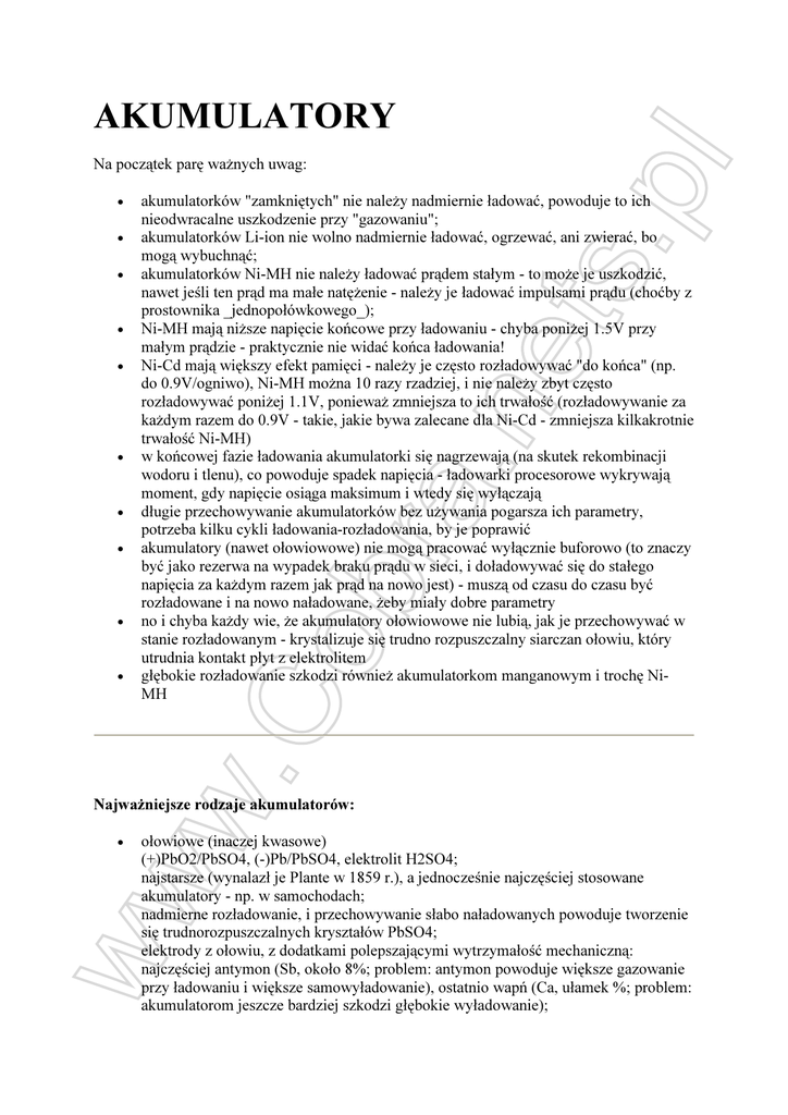 AKUMULATORY Na początek parę ważnych uwag: • • • • • • • • • • akumulatorków "zamkniętych" nie należy nadmiernie ładować, powoduje to ich nieodwracalne uszkodzenie przy "gazowaniu"; akumulatorków Li-ion nie wolno nadmiernie ładować, ogrzewać, ani zwierać, bo mogą wybuchnąć; akumulatorków Ni-MH nie należy ładować prądem stałym - to może je uszkodzić, nawet jeśli ten prąd ma małe natężenie - należy je ładować impulsami prądu (choćby z prostownika _jednopołówkowego_); Ni-MH mają niższe napięcie końcowe przy ładowaniu - chyba poniżej 1.5V przy małym prądzie - praktycznie nie widać końca ładowania! Ni-Cd mają większy efekt pamięci - należy je często rozładowywać "do końca" (np. do 0.9V/ogniwo), Ni-MH można 10 razy rzadziej, i nie należy zbyt często rozładowywać poniżej 1.1V, ponieważ zmniejsza to ich trwałość (rozładowywanie za każdym razem do 0.9V - takie, jakie bywa zalecane dla Ni-Cd - zmniejsza kilkakrotnie trwałość Ni-MH) w końcowej fazie ładowania akumulatorki się nagrzewają (na skutek rekombinacji wodoru i tlenu), co powoduje spadek napięcia - ładowarki procesorowe wykrywają moment, gdy napięcie osiąga maksimum i wtedy się wyłączają długie przechowywanie akumulatorków bez używania pogarsza ich parametry, potrzeba kilku cykli ładowania-rozładowania, by je poprawić akumulatory (nawet ołowiowowe) nie mogą pracować wyłącznie buforowo (to znaczy być jako rezerwa na wypadek braku prądu w sieci, i doładowywać się do stałego napięcia za każdym razem jak prąd na nowo jest) - muszą od czasu do czasu być rozładowane i na nowo naładowane, żeby miały dobre parametry no i chyba każdy wie, że akumulatory ołowiowowe nie lubią, jak je przechowywać w stanie rozładowanym - krystalizuje się trudno rozpuszczalny siarczan ołowiu, który utrudnia kontakt płyt z elektrolitem głębokie rozładowanie szkodzi również akumulatorkom manganowym i trochę NiMH Najważniejsze rodzaje akumulatorów: • ołowiowe (inaczej kwasowe) (+)PbO2/PbSO4, (-)Pb/PbSO4, elektrolit H2SO4; najstarsze (wynalazł je Plante w 1859 r.), a jednocześnie najczęściej stosowane akumulatory - np. w samochodach; nadmierne rozładowanie, i przechowywanie słabo naładowanych powoduje tworzenie się trudnorozpuszczalnych kryształów PbSO4; elektrody z ołowiu, z dodatkami polepszającymi wytrzymałość mechaniczną: najczęściej antymon (Sb, około 8%; problem: antymon powoduje większe gazowanie przy ładowaniu i większe samowyładowanie), ostatnio wapń (Ca, ułamek %; problem: akumulatorom jeszcze bardziej szkodzi głębokie wyładowanie); • • • • • ostatnio konstruuje się je w wersji zamkniętej - np. żelowej (elektrolit zmieszany z krzemionką (SiO2), zmniejszona ilość elektrolitu tak, by zostawały "dziury" - po to, żeby elektrolit nie mógł się wylać nawet po rozbiciu obudowy, i żeby tlen i wodór powstające głównie podczas ładowania mogły się ze sobą połączyć); skonstruowano też akumulatory z elektrolitami takimi, jak HBF4 i H2SiF6, których sole ołowiu są łatworozpuszczalne - przy rozładowaniu elektrody (Pb, PbO2) rozpuszczają się, dlatego (+) jest z PbO2 na węglu, przy ładowaniu Pb i PbO2 wydzielają się roztworu; ryzyko skażenia środowiska solami ołowiu; żelazowo-niklowe (Ni-Fe) (+)NiO.OH/Ni(OH)2, (-)Fe(OH)2/Fe(OH)3, elektrolit KOH; wynalezione przez Edisona, obecnie prawie nie używane z powodu dużego gazowania - na żelaznej elektrodzie łatwo wydziela się wodór (z tego powodu nie można ich wykonać w wersji zamkniętej); na niklowej elektrodzie reakcja zachodzi bez istotnych zmian struktury kryształów (dochodzi tylko atom wodoru), co zwiększa jej trwałość; dotyczy to również innych akumulatorów z elektrodą niklową; nadmierne naładowanie zmienia strukturę krystaliczną, co powoduje obniżenie napięcia, i jednocześnie przyśpiesza niszczenie elektrody; kadmowo-niklowe (Ni-Cd) (+)NiO.OH/Ni(OH)2, (-)Cd/Cd(OH)2, elektrolit KOH; wynalezione przez Jungnera, zawierają silnie trujący kadm, z tego powodu próbuje się je zastąpić innymi; dobrze wytrzymują głębokie rozładowanie; przypisuje się im efekt pamięci - że jeśli akumulator nie zostanie całkowicie rozładowany, to traci część pojemności - to jest bardziej mit niż prawda; wodorkowo-niklowe (Ni-Mh) (+)NiO.OH/Ni(OH)2, (-)H (zwykle w LaNi5)/H2O, elektrolit KOH; ze względu na koszt zamiast LaNi5 często używa sie stopu niklu (Ni), kobaltu (Co), manganu (Mn) i glinu (Al); litowo-jonowe (Li-ion) (+)Li na różnych (CoO2, NiO2, MnO2), (-)Li (na C6), elektrolitem jest substancja przenosząca jony litu, w rozpuszczalniku organicznym; wysokie, w porównaniu z innymi akumulatorami, napięcie: około 3.6V; największa z dostępnych w handlu gęstość energii; małe samowyładowanie; nadmierne naładowanie, ogrzewanie, lub zwarcie może być niebezpieczne; zbyt głębokie rozładowanie powoduje zniszczenie akumulatora - nie daje się on więcej naładować; zwykle połączony z elektroniką sterującą ładowaniem i rozładowaniem, aby chronić akumulator; manganowo-cynkowe (Mn-Zn) (+)MnO2/MnO.OH, (-)Zn/Zn(OH)2, elektrolit KOH; napięcie 1.5V (tak, jak zwykłe "baterie"), małe samowyładowanie; mała trwałość - około 100 cykli, jeśli unika się głębokiego wyładowania, zaledwie 30, jeśli rozładowuje się całkowicie. Mechanizmy powodujące zużycie lub niszczenie akumulatorów: • • uszkodzenia mechaniczne - na skutek uderzenia (szkodzi to wszystkim, nawet małym akumulatorom - nie należy ich upuszczać na podłogę, bo może pęknąć obudowa, lub jakiś element konstrukcji wewnętrznej - wiele typów akumulatorów ma elektrody z materiału o dużym ciężarze właściwym i małej wytrzymałości); akumulatory z płynnym elektrolitem są bardziej wrażliwe (bo łatwo dochodzi do przemieszczenia elektrod) i na dodatek może im szkodzić im praca w niewłaś