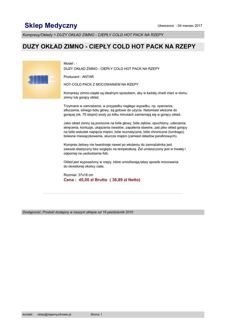 Sklep Medyczny Utworzono : 04 marzec 2017 Kompresy/Okłady > DUZY OKŁAD ZIMNO - CIEPŁY COLD HOT PACK NA RZEPY DUZY OKŁAD ZIMNO - CIEPŁY COLD HOT PACK NA RZEPY Model : DUZY OKŁAD ZIMNO - CIEPŁY COLD HOT PACK NA RZEPY Producent : ANTAR HOT-COLD PACK Z MOCOWANIEM NA RZEPY Kompresy zimno-ciepłe są idealnym sposobem, aby w każdej chwili mieć w domu zimny lub gorący okład. Trzymane w zamrażarce, w przypadku nagłego wypadku, np. oparzenia, stłuczenia, silnego bólu głowy, są gotowe do użycia. Natomiast włożone do gorącej (ok. 70 stopni) wody po kilku minutach zamieniają się w gorący okład. Jako okład zimny są pomocne na bóle głowy, bóle zębów, opuchlizny, uderzenia, skręcenia, kontuzje, ukąszenia owadów, zapalenia stawów, zaś jako okład gorący na bóle wskutek napięcia mięśni, bóle reumatyczne, bóle chroniczne (lumbago), bolesne miesiączkowanie, skurcze mięśni (zamiast okładów parafinowych). Kompres żelowy nie twardnieje nawet po włożeniu do zamrażalnika jest zawsze elastyczny bez względu na temperaturę. Żel umieszczony jest w trwałej i odpornej na uszkodzenia folii. Okład jest wyposażony w rzepy, które umożliwiają łatwy sposób mocowania do określonej okolicy ciała. Rozmiar: 37x18 cm Cena : 45,00 zł Brutto ( 36,89 zł Netto) Dostępność: Produkt dostępny w naszym sklepie od 18 październik 2010 kontakt : - [email protected] Strona 1
