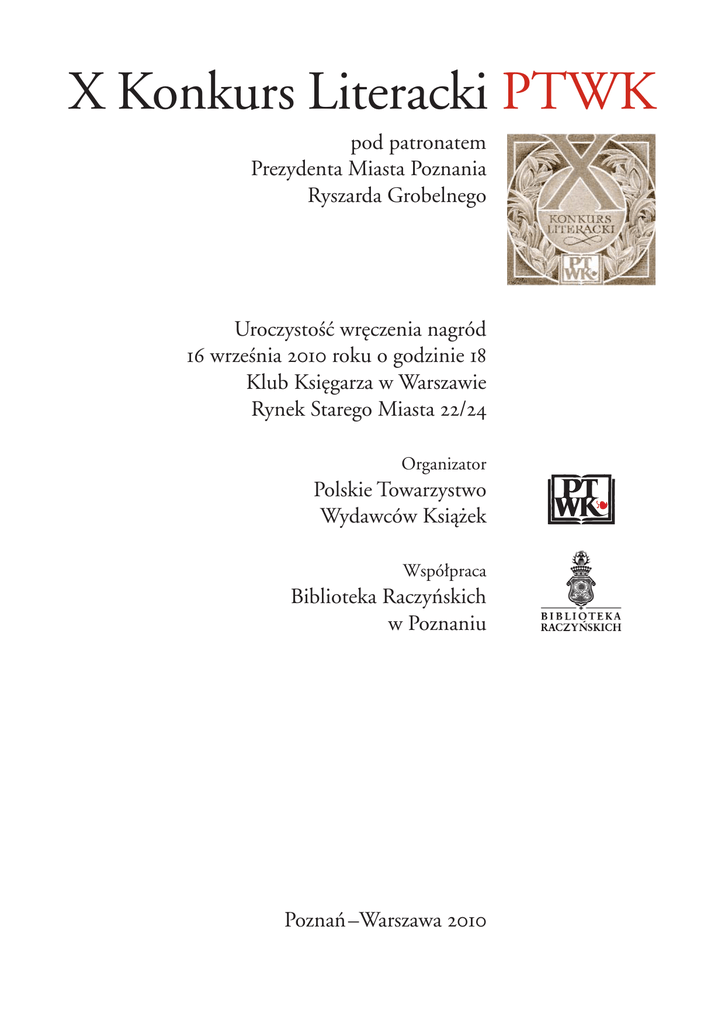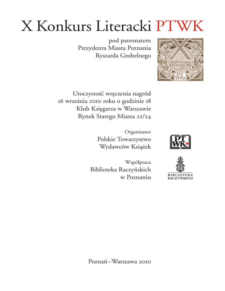 X Konkurs Literacki PTWK pod patronatem Prezydenta Miasta Poznania Ryszarda Grobelnego Uroczystość wręczenia nagród 16 września 2010 roku o godzinie 18 Klub Księgarza w Warszawie Rynek Starego Miasta 22/24 Organizator Polskie Towarzystwo Wydawców Książek Współpraca Biblioteka Raczyńskich w Poznaniu Poznań –Warszawa 2010 W dniu 30 czerwca 2010 roku na posiedzeniu Jury, odbywającym się w Warszawie w Klubie Księgarza, rozstrzygnięta została X edycja promocyjnego Konkursu Literackiego Polskiego Towarzystwa Wydawców Książek w czterech kategoriach twórczości: poezja, proza, esej, literatura dla dzieci i młodzieży oraz kategorii debiutu. W konkursie brały udział książki wydane w latach 2008–2009 autorów mających w swoim dorobku nie więcej niż trzy publikacje w danej kategorii. Zgłoszono 203 książki. Od 2000 roku Konkurs Literacki PTWK odbywa się pod patronatem Prezydenta Miasta Poznania Ryszarda Grobelnego, który wzbogacił formułę Konkursu dodatkową Nagrodą Specjalną za debiut. poezja proza esej literatura dla dzieci i młodzieży W obradach uczestniczyli członkowie Jury w składzie: Grażyna Borkowska (przewodnicząca), Alina Brodzka-Wald, Przemysław Czapliński, Grzegorz Leszczyński, Bronisław Maj, Andrzej Rostocki, Piotr Śliwiński oraz przedstawiciele PTWK (z głosem doradczym): Olcha Sikorska (komisarz Konkursu), Barbara Petrozolin-Skowrońska i Lidia Sadowska. Jury nominowało do nagród następujące książki: W kategorii poezji Magdalena Bielska, Wakacje, widmo (Wydawnictwo a5, Kraków 2009) Szczepan Kopyt, Sale, sale, sale (Wydawnictwo Wojewódzkiej Biblioteki Publicznej i Centrum Animacji Kultury, Poznań 2009) Przemysław Owczarek, Cyklist (Wydawnictwo Kwadratura, Łódzki Dom Kultury, 2009) W kategorii prozy Joanna Bator, Piaskowa Góra (Wydawnictwo W.A.B., Warszawa 2009) Małgorzata Rejmer, Toksymia (Wydawnictwo Lampa i Iskra Boża, Warszawa 2009) Marta Syrwid, Zaplecze (Wydawnictwo W.A.B., Warszawa 2009) Inga Iwasiów, Bambino (Świat Książki – Bertelsmann Media, Warszawa 2008) W kategorii eseju Dariusz Czaja, Lekcje ciemności (Wydawnictwo Czarne, Wołowiec 2009) Agnieszka Graff, Rykoszetem. Rzecz o płci, seksualności i narodzie (Wydawnictwo W.A.B., Warszawa 2008) Anda Rottenberg, Proszę bardzo (Wydawnictwo W.A.B., Warszawa 2009) Krzysztof Varga, Gulasz z turula (Wydawnictwo Czarne, Wołowiec 2008) W kategorii literatury dla dzieci i młodzieży Andrzej Maleszka, Magiczne drzewo. Czerwone krzesło (Społeczny Instytut Wydawniczy Znak, Kraków 2009) Romek Pawlak, Czapka Holmesa (Wydawnictwo Akapit Press, Łódź 2009) Michał Rusinek, Mały Chopin (Społeczny Instytut Wydawniczy Znak, Kraków 2009) Konkurs zrealizowano ze środków Ministra Kultury i Dziedzictwa Narodowego Nagrodę Specjalną za Debiut ufundował Prezydent Miasta Poznania Nagrodę w kategorii poezji dla Magdaleny Bielskiej ufundował Marszałek Województwa Wielkopolskiego W kategorii debiutu Sławomir Elsner, Antypody – tomik poezji (Biuro Literackie, Wrocław 2008) Joanna Lech, Zapaść – tomik poezji (Poleski Ośrodek Sztuki w Łodzi, Stowarzyszenie Pisarzy Polskich Oddział w Łodzi, 2009) Piotr Paziński, Pensjonat – powieść (Wydawnictwo Nisza, Warszawa 2009) Anna Wieser, Delta – tomik poezji (Wydawnictwo Wojewódzkiej Biblioteki Publicznej i Centrum Animacji Kultury, Poznań 2009) W wyniku głosowania Jury przyznało następujące równorzędne nagrody w kategorii poezji ex aequo Magdalenie Bielskiej, autorce tomu Wakacje, widmo (Wydawnictwo a5, Kraków 2009). Za wiersze pełne niepokoju – ale nie chaosu, przesiąknięte intuicją nieokreślonej klęski – lecz zarazem zespolone kojącym szacunkiem dla języków lirycznej tradycji, mówiące o samotności – lecz głodne porozumienia, boleśnie dotknięte – lecz od stojącej za nimi rozpaczy wymagające powściągliwości i celności wyrazu. Za poezję daleką od mód, od źle pojętej wspólnoty upodobań, od jakże częstego poczucia bezsiły i zbędności sztuki, nienaiwną, wewnętrznie rozdartą i równocześnie wewnętrznie mocną. Za lirykę, która nie ucieka od rzeczywistości, lecz uważnie zapisuje jej składniki, a jednocześnie nie ucieka od scalającej puenty, nie boi się uświęcać i uwznioślać ludzkich doświadczeń, nie skąpi i nie trwoni fraz na temat zawiłej natury naszego losu. Piotr Śliwiński Przemysławowi Owczarkowi, autorowi tomu Cyklist (Wydawnictwo Kwadratura, Łódzki Dom Kultury, 2009). Czy Bóg może się objawić w Poddębicach? Czy w rachitycznym zagajniku gdzieś na obrzeżach Łodzi można usłyszeć pytania o sens, o los i czas? Czy nad zamienionym w brudny ściek Nerem można, w olśnieniu, pojąć sens heraklitejskiej myśli? Tak! – odpowiada na wszystkie te pytania Przemysław Owczarek, odpowiada – cyklem swych liryków prozą (czy: poematem?) Cyklist. Te liryki – najbanalniejszą, potoczną, „nieestetyczną” sytuację potrafią przemienić w okno, przez które nagle spoglądamy na to, co naprawdę najgłębiej istotne. Świat poetycki Owczarka – dojmująco konkretny, realny – to nasz świat, innego nie będzie. Trzeba go przyjąć i pokochać – z czułością, ale i ironią, zachwytem i rozpaczą – tak, jak to jest w tych lirykach. Lirykach – przy, niekiedy, pozorach kolokwialnej mowy – nadzwyczaj ciekawych i wyrafinowanych językowo, pełnych niezwykłej energii, budujących sugestywną, mocno istniejącą poetycką rzeczywistość. Świetna książka – Cyklist ! Bronisław Maj Joannie Bator, autorce książki Piaskowa Góra (Wydawnictwo W.A.B., Warszawa 2009) w kategorii prozy Za stworzenie jednej z najpełniejszych narracji o spotkaniu polskiej obyczajowości z socjalistyczną modernizacją, za pomieszczenie w tej narracji obrazu zwykłej rodziny, za dyskretne rozproszenie odmienności w najbardziej zwykłych biografiach. Za powieść wielowątkową i przerzutną, a zarazem troskliwie doglądaną przez główne