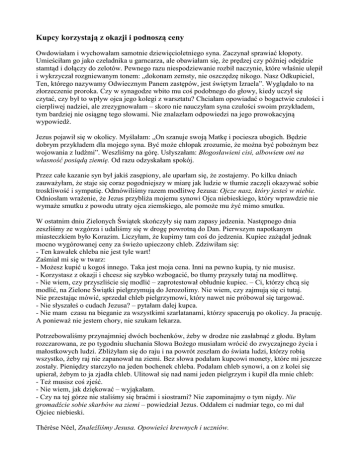 Kupcy korzystają z okazji i podnoszą ceny Owdowiałam i wychowałam samotnie dziewięcioletniego syna. Zaczynał sprawiać kłopoty. Umieściłam go jako czeladnika u garncarza, ale obawiałam się, że prędzej czy później odejdzie stamtąd i dołączy do zelotów. Pewnego razu niespodziewanie rozbił naczynie, które właśnie ulepił i wykrzyczał rozgniewanym tonem: „dokonam zemsty, nie oszczędzę nikogo. Nasz Odkupiciel, Ten, którego nazywamy Odwiecznym Panem zastępów, jest świętym Izraela”. Wyglądało to na złorzeczenie proroka. Czy w synagodze wbito mu coś podobnego do głowy, kiedy uczył się czytać, czy był to wpływ ojca jego kolegi z warsztatu? Chciałam opowiadać o bogactwie czułości i cierpliwej nadziei, ale zrezygnowałam – skoro nie nauczyłam syna czułości swoim przykładem, tym bardziej nie osiągnę tego słowami. Nie znalazłam odpowiedzi na jego prowokacyjną wypowiedź. Jezus pojawił się w okolicy. Myślałam: „On szanuje swoją Matkę i pociesza ubogich. Będzie dobrym przykładem dla mojego syna. Być może chłopak zrozumie, że można być pobożnym bez wojowania z ludźmi”. Weszliśmy na górę. Usłyszałam: Błogosławieni cisi, albowiem oni na własność posiądą ziemię. Od razu odzyskałam spokój. Przez całe kazanie syn był jakiś zasępiony, ale uparłam się, że zostajemy. Po kilku dniach zauważyłam, że staje się coraz pogodniejszy w miarę jak ludzie w tłumie zaczęli okazywać sobie troskliwość i sympatię. Odmówiliśmy razem modlitwę Jezusa: Ojcze nasz, który jesteś w niebie. Odniosłam wrażenie, że Jezus przybliża mojemu synowi Ojca niebieskiego, który wprawdzie nie wymaże smutku z powodu utraty ojca ziemskiego, ale pomoże mu żyć mimo smutku. W ostatnim dniu Zielonych Świątek skończyły się nam zapasy jedzenia. Następnego dnia zeszliśmy ze wzgórza i udaliśmy się w drogę powrotną do Dan. Pierwszym napotkanym miasteczkiem było Korazim. Liczyłam, że kupimy tam coś do jedzenia. Kupiec zażądał jednak mocno wygórowanej ceny za świeżo upieczony chleb. Zdziwiłam się: - Ten kawałek chleba nie jest tyle wart! Zaśmiał mi się w twarz: - Możesz kupić u kogoś innego. Taka jest moja cena. Inni na pewno kupią, ty nie musisz. - Korzystasz z okazji i chcesz się szybko wzbogacić, bo tłumy przyszły tutaj na modlitwę. - Nie wiem, czy przyszliście się modlić – zaprotestował obłudnie kupiec. – Ci, którzy chcą się modlić, na Zielone Świątki pielgrzymują do Jerozolimy. Nie wiem, czy zajmują się ci tutaj. Nie przestając mówić, sprzedał chleb pielgrzymowi, który nawet nie próbował się targować. - Nie słyszałeś o cudach Jezusa? – pytałam dalej kupca. - Nie mam czasu na bieganie za wszystkimi szarlatanami, którzy spacerują po okolicy. Ja pracuję. A ponieważ nie jestem chory, nie szukam lekarza. Potrzebowaliśmy przynajmniej dwóch bochenków, żeby w drodze nie zasłabnąć z głodu. Byłam rozczarowana, ze po tygodniu słuchania Słowa Bożego musiałam wrócić do zwyczajnego życia i małostkowych ludzi. Zbliżyłam się do raju i na powrót zeszłam do świata ludzi, którzy robią wszystko, żeby raj nie zapanował na ziemi. Bez słowa podałam kupcowi monety, które mi jeszcze zostały. Pieniędzy starczyło na jeden bochenek chleba. Podałam chleb synowi, a on z kolei się upierał, żebym to ja zjadła chleb. Ulitował się nad nami jeden pielgrzym i kupił dla mnie chleb: - Też musisz coś zjeść. - Nie wiem, jak dziękować – wyjąkałam. - Czy na tej górze nie staliśmy się braćmi i siostrami? Nie zapominajmy o tym nigdy. Nie gromadźcie sobie skarbów na ziemi – powiedział Jezus. Oddałem ci nadmiar tego, co mi dał Ojciec niebieski. Thérèse Néel, Znaleźliśmy Jesusa. Opowieści krewnych i uczniów.