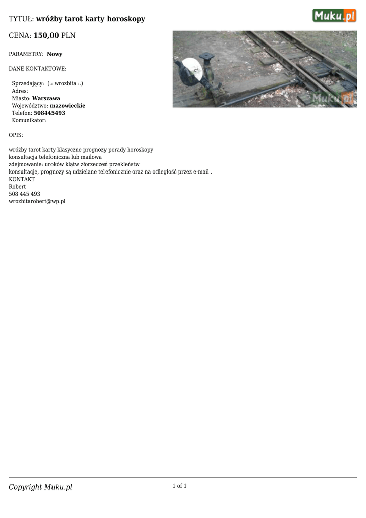 TYTUŁ: wróżby tarot karty horoskopy CENA: 150,00 PLN PARAMETRY: Nowy DANE KONTAKTOWE: Sprzedający: (.: wrozbita :.) Adres: Miasto: Warszawa Województwo: mazowieckie Telefon: 508445493 Komunikator: OPIS: wróżby tarot karty klasyczne prognozy porady horoskopy konsultacja telefoniczna lub mailowa zdejmowanie: uroków klątw złorzeczeń przekleństw konsultacje, prognozy są udzielane telefonicznie oraz na odległość przez e-mail . KONTAKT Robert 508 445 493 [email protected] Copyright Muku.pl 1 of 1
