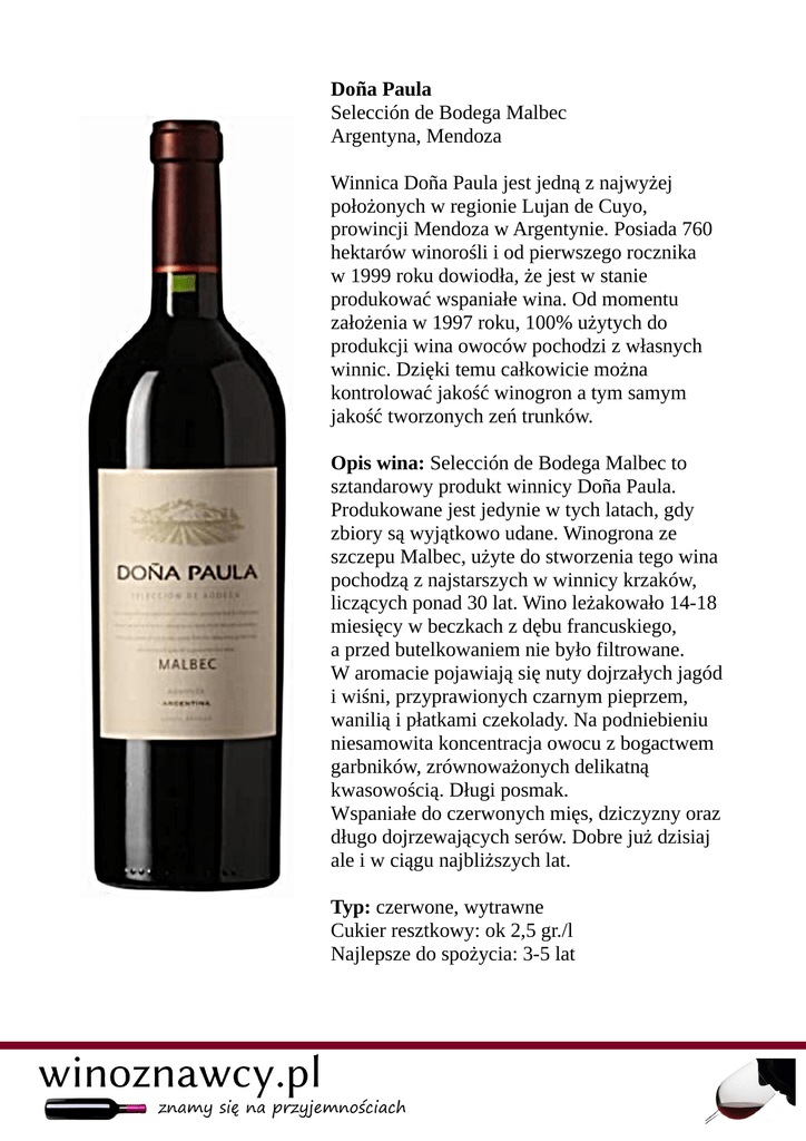 Doña Paula Selección de Bodega Malbec Argentyna, Mendoza Winnica Doña Paula jest jedną z najwyżej położonych w regionie Lujan de Cuyo, prowincji Mendoza w Argentynie. Posiada 760 hektarów winorośli i od pierwszego rocznika w 1999 roku dowiodła, że jest w stanie produkować wspaniałe wina. Od momentu założenia w 1997 roku, 100% użytych do produkcji wina owoców pochodzi z własnych winnic. Dzięki temu całkowicie można kontrolować jakość winogron a tym samym jakość tworzonych zeń trunków. Opis wina: Selección de Bodega Malbec to sztandarowy produkt winnicy Doña Paula. Produkowane jest jedynie w tych latach, gdy zbiory są wyjątkowo udane. Winogrona ze szczepu Malbec, użyte do stworzenia tego wina pochodzą z najstarszych w winnicy krzaków, liczących ponad 30 lat. Wino leżakowało 14-18 miesięcy w beczkach z dębu francuskiego, a przed butelkowaniem nie było filtrowane. W aromacie pojawiają się nuty dojrzałych jagód i wiśni, przyprawionych czarnym pieprzem, wanilią i płatkami czekolady. Na podniebieniu niesamowita koncentracja owocu z bogactwem garbników, zrównoważonych delikatną kwasowością. Długi posmak. Wspaniałe do czerwonych mięs, dziczyzny oraz długo dojrzewających serów. Dobre już dzisiaj ale i w ciągu najbliższych lat. Typ: czerwone, wytrawne Cukier resztkowy: ok 2,5 gr./l Najlepsze do spożycia: 3-5 lat