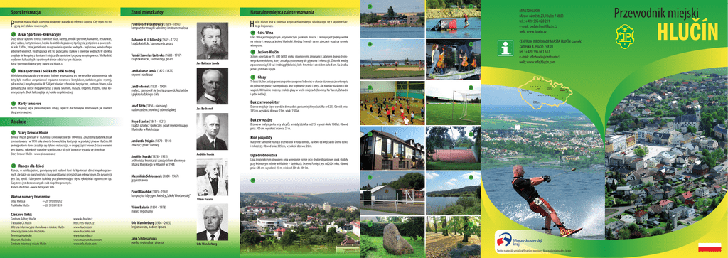 Sport i rekreacja P ołożenie miasta Hlučín zapewnia doskonałe warunki do rekreacji i sportu. Cały rejon ma też gęstą sieć szlaków rowerowych. Znani mieszkańcy Naturalne miejsca zainteresowania Pavel Josef Vejvanovský (1639 - 1693) kompozytor muzyki sakralnej i instrumentalista H Bohumír H. J. Bílovský (1659 - 1725) ksiądz katolicki, kaznodzieja, pisarz 25 Hala sportowa i boiska do piłki nożnej Jan Baltazar Janda (1827 - 1875) snycerz i rzeźbiarz Wielofunkcyjna sala do gry w sporty halowe wyposażona jest we wszelkie udogodnienia, tak żeby bylo możliwe zorganizować regularne meczów w koszykówce, siatkówce, piłce ręcznej, piłce nożnej i innych sportów. W Sali jest również schronisko turystyczne, centrum fitness, sala gimnastyczna, goście mogą korzystać z sauny, solarium, masażu, kręgielni, fryzjera, usług kosmetycznych. Obok hali znajduje się boisko do piłki nożnej. 26 Korty tenisowe Korty znajduję się w parku miejskim i mają zaplecze dla turniejów tennisowych jak również do gry rekreacyjnej. Atrakcje 27 Stary Browar Hlučín Browar Hlučín powstał w 1526 roku i piwo warzone do 1904 roku. Zniszczony budynek został zremontowany i w 1993 roku otwarto browar, który kontynuje w produkcji piwa w Hlučínie. W jednej połówie domu znajduje się stylowa restauracja, w drugiej części browar. Ściana warzelni jest sklanna, także kotły warzelne są widoczne z ulicy. W browarze wyrabia się piwo Avar. Stary Browar Hlučín - www.pivovaravar.cz 28 Ranczo dla dzieci Ranczo, w pobliżu jeziora, poświęcony jest hodowli koni do hipoterapii dzieci niepełnosprawnych, ale także do (para)woltyżu i (para)ujeżdżaniu i przejażdżkam rekreacyjnym. Do dyspozycji jest Zoo, ogród z labiryntem i zakłady pracy koncentrujące się na rękodzieła i ogrodnictwo itp. Cały teren jest dostosowany do osób niepełnosprawnych. Ranczo dla dzieci - www.detskyranc.info Ważne numery telefonów: Straż Miejska Poliklinika Hlučín Ciekawe linki: +420 595 020 202 +420 595 041 059 Centrum Kultury Hlučín www.kc-hlucin.cz TV studio CK Hlučín http://tvs-hlucin.cz Witryna informacyjna i handlowa o mieście Hlučín www.hlucin.com Stowarzyszenie Gmin Hlučínska www.hlucinsko.com Telewizja Hlučínskowww.hlucinsko.tv Muzeum Hlučínskawww.muzeum.hlucin.com Centrum informacji miasta Hlučín www.info.hlucin.com Tomáš Xaverius Laštovka (1688 - 1747) ksiądz katolicki, kaznodzieja, pisarz Jan Baltazar Janda 25 25 27 26 28 30 31 31 Jezioro powstało w 70. i 80 lat XX wieku stopniowymi zmianami i zalaniem byłego żwirowego kamieniołomu, który został przystosowany do pływania i rekreacyji. Zbiornik wodny z powierzchnią 130 ha i średnią głębokością koło 4 metrów i obwódem koło 8 km. Na środku jeziora jest mała wyspa. MIASTO HLUČÍN Mírové náměstí 23, Hlučín 748 01 tel.: +420 595 020 211 e-mail: [email protected] web: www.hlucin.cz CENTRUM INFORMACJI MIASTA HLUČÍN (zamek) Zámecká 4, Hlučín 748 01 tel.: +420 595 041 617 e-mail: [email protected] web: www.info.hlucin.com 31 Głazy Te bloki skalne zostały przetransportowane przez lodowiec w okresie starszego czwartorzędu do północnej granicy naszego kraju. Jest to głównie granit i gnejs, ale również piaskowca lub wapień. W Hlučínie możemy znaleźć głazy w wielu miejscach (Rovniny, Na Valech, Zahradní i gdzie indziej). Buk czerwonolistny Jan Bochenek Drzewo znajduje się w ogrodzie domu obok parku miejskiego (działka nr 523). Obwód pnia: 385 cm, wysokość drzewa: 23 m, wiek: 150 lat. Buk zwyczajny Drzewo w małym parku przy ulicy Čs. armády (działka nr 215) wynosi około 150 lat. Obwód pnia: 300 cm, wysokość drzewa: 23 m. Klon pospolity Jan Janda Štěpán (1870 - 1914) znaczący pisarz ludowy Masywne samotnie rosnąca drzewo stoi w rogu ogrodu, na lewo od wejścia do Domu dzieci i młodzieży. Obwód pnia: 335 cm, wysokość drzewa: 26 m. Andělín Novák Lipa drobnolistna Lipa z największym obwodem pnia w regionie rośnie przy drodze dojazdowej obok stodoły przy Krömrovym mlynie w Hlučínie – Jasénkách. Drzewo Pamięci jest od 2004 roku. Obwód pnia: 683 cm, wysokość: 23 m, wiek: od 300 do 400 lat. Maxmilián Schlossarek (1884 - 1967) językoznawca Pavel Blaschke (1885 - 1969) kompozytor i dyrygent katedry„Szkoły Wrocławskiej“ 24 30 Jezioro Hlučín Hugo Stanke (1861 - 1921) ksiądz, działacz społeczny, poseł reprezentujący Hlučínsko w Reichstagu Andělín Novák (1878 - 1955) archiwista, kronikarz i założycielem dawnego Muzea Miejskiego w Hlučíně w 1948 24 lučín Miasto leży u podnóża wzgórza Hlučínskiego, składającego się z łagodnie fałistego krajobrazu. Góra Wina jest najwyższym przyrodniczym punktem miasta, z którego jest piękny widok na miasto i zwłaszcza jezioro hlučínské. Według legendy się na zboczach wzgórza rosneło winogrono. Jan Bochenek (1831 - 1909) malarz, zajmował się teorią proporcji, kształtów i piękna ludzkiego ciała Josef Bitta (1856 - nieznany) nadprezydent prowincji górnośląskiej 24 29 Góra Wina 24 Areał Sportowo-Rekreacyjny Duży obszar u jeziora tworzą trawiaste plaże, baseny, ośrodki sportowe, kawiarnie, restauracje, placy zabaw, korty tenisowe, boiska do siatkówki plażowej itp. Częścią jest jezioro o powierzchni koło 130 ha, które jest idealne do uprawiania sportów wodnych - żeglarstwa, windsurfingu albo nart wodnych. Do dyspozycji jest też pożyczalnia statków i rowerów wodnych. W obiektu znajduje się kemping z domkami i miejsca dla namiotów i przyczep kempingowych. Wielka ilość wydarzeń kulturalnych i sportowych bierze udział na tym obszarze. Areał Sportowo-Rekreacyjny - www.sra-hlucin.cz 24 29 Vilém Balarin Vilém Balarin (1894 - 1978) malarz regionalny Udo Wanderburg (1936 - 2003) krajoznawcza, badacz i pisarz Jana Schlossarková poetka regionalna i pisarka Udo Wanderburg Tento materiál vznikl za finanční podpory Moravskoslezského kraje. Przewodnik m