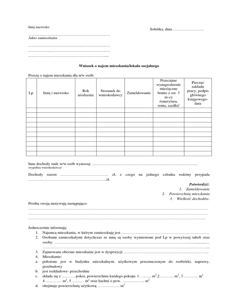 Imię nazwisko Sobótka, dnia…………………… …………………………………………… Adres zamieszkania …………………………………………… …………………………………………… …………………………………………... Wniosek o najem mieszkania/lokalu socjalnego Proszę o najem mieszkania dla n/w osób: Lp. Imię i nazwisko Rok urodzenia Stosunek do wnioskodawcy Zameldowanie Przeciętne wynagrodzenie miesięczne brutto z ost. 3 m-cy /emerytura, renta, zasiłki/ Pieczęć zakładu pracy, podpis głównego księgowegodata Inne dochody stałe w/w osób wynoszą: ……………………………………………………………… /wypełnia wnioskodawca/ Dochody razem ……………………………… zł, z czego na jednego członka rodziny przypada …………………………………………………..zł. Potwierdzić: 1. Zameldowanie 2. Powierzchnię mieszkania 3. Wielkość dochodów. Prośbę swoją motywuję następująco: ……………………………………………………………………………………………………………………… ……………………………………………………………………………………………………………………… ……………………………………………………………………………………………………………………. Jednocześnie informuję: 1. Najemcą mieszkania, w którym zamieszkuję jest ………………………………………………………… 2. Osobami zamieszkałymi dotychczas ze mną są osoby wymienione pod Lp w powyŜszej tabeli oraz osoby: ………………………………………………………………………………………....................... ……………………………………………………………………………………………………………... 3. Zajmowane obecnie mieszkanie jest w dyspozycji ………………………………………………………. 4. Mieszkanie: a. połoŜone jest w budynku mieszkalnym, uŜytkowym przeznaczonym do rozbiórki, naprawy, przebudowy b. jest rozkładowe- przechodnie c. składa się z ………. pokoi, powierzchnia kaŜdego pokoju: 1. …….. m2,2……….. m2, 3 ……….. m2 4 ………… m2, 5 ……… m2 oraz kuchni o pow. …………….. m2 d. obejmuje powierzchnię uŜytkową …………….. m2 5. Mieszkanie zajmowane jest: a. samodzielnie b. wspólnie w następujący sposób Lp. Powierzchnia Imię i nazwisko najemcy Potwierdzenie administratora lub właściciela budynku Liczba zamieszkałych osób Uwagi Kuchnia uŜytkowana jest samodzielnie/ wspólnie przez: ………………………………………………………………………………………………………………………. ………………………………………………………………………………………………………………………. Mieszkanie połoŜone jest na ……………… i wyposaŜone w instalację: wodno- kanalizacyjną, gazową, centralnego ogrzewania, piece, łazienkę, w.c. (wyraŜam zgodę na przetwarzanie moich danych zgodnie z ustawą o ochronie danych osobowych z 29 sierpnia 1997 r. tekst jedn. Dz. U. nr 101 poz. 926) Podpis wnioskodawcy …………………………………………………. Opinia o warunkach mieszkaniowych na podstawie oględzin lokalu: ……………………………………………………………………………………………………………………… ……………………………………………………………………………………………………………………. ………………………………………………………………………………………………………………………. Data ……………………… .Podpis ……………………………………………….. Sposób rozstrzygnięcia i uzasadnienie: ……………………………………………………………………………………………………………………… ……………………………………………………………………………………………………………………. ………………………………………………………………………………………………………………………. Data ……………………… .Podpis ………………………………………………… Adnotacje o ostatecznym załatwieniu sprawy: 1. Pan/i ……………………………………………… z dnia ……………… zostało przydzielone mieszkanie……… …………………….. nr …….. w budynku nr ………. przy ul. …………………… …………………………. w ………………………………….. kategorii M …….. składające się z ………. izb o powierzchni uŜytkowej …………… m2 w tym pokoi o powierzchni……………….. m2 2. Wniosek Pana/i ………………………………………….. o przydział mieszkania został załatwiony odmownie o czym wnioskodawcę powiadomiono pismem nr …………………………………….. z dnia ………………………………………………. Data ……………………… .Podpis ………………………………………………… ……………………………………. Pieczęć zakładu pracy ZAŚWIADCZENIE Zaświadcza się, Ŝe Pan/i ………………………………………………………………………………… zamieszkały/a …………………………………………………………………………………………. jest/ był zatrudniony/a …………………………………………………………………………………. w okresie od ………………………………………. do ……………………………………………… Dochód (faktycznie wypłacony) osiągnięty w okresie trzech miesięcy poprzedzaj